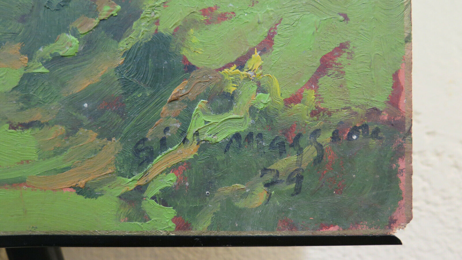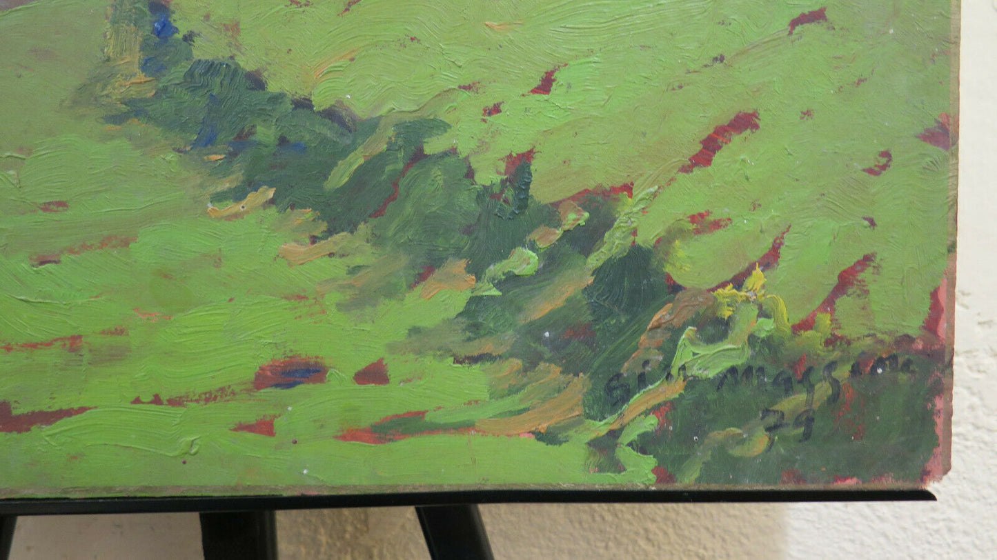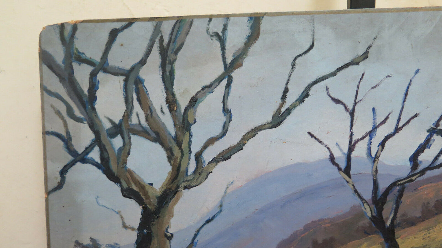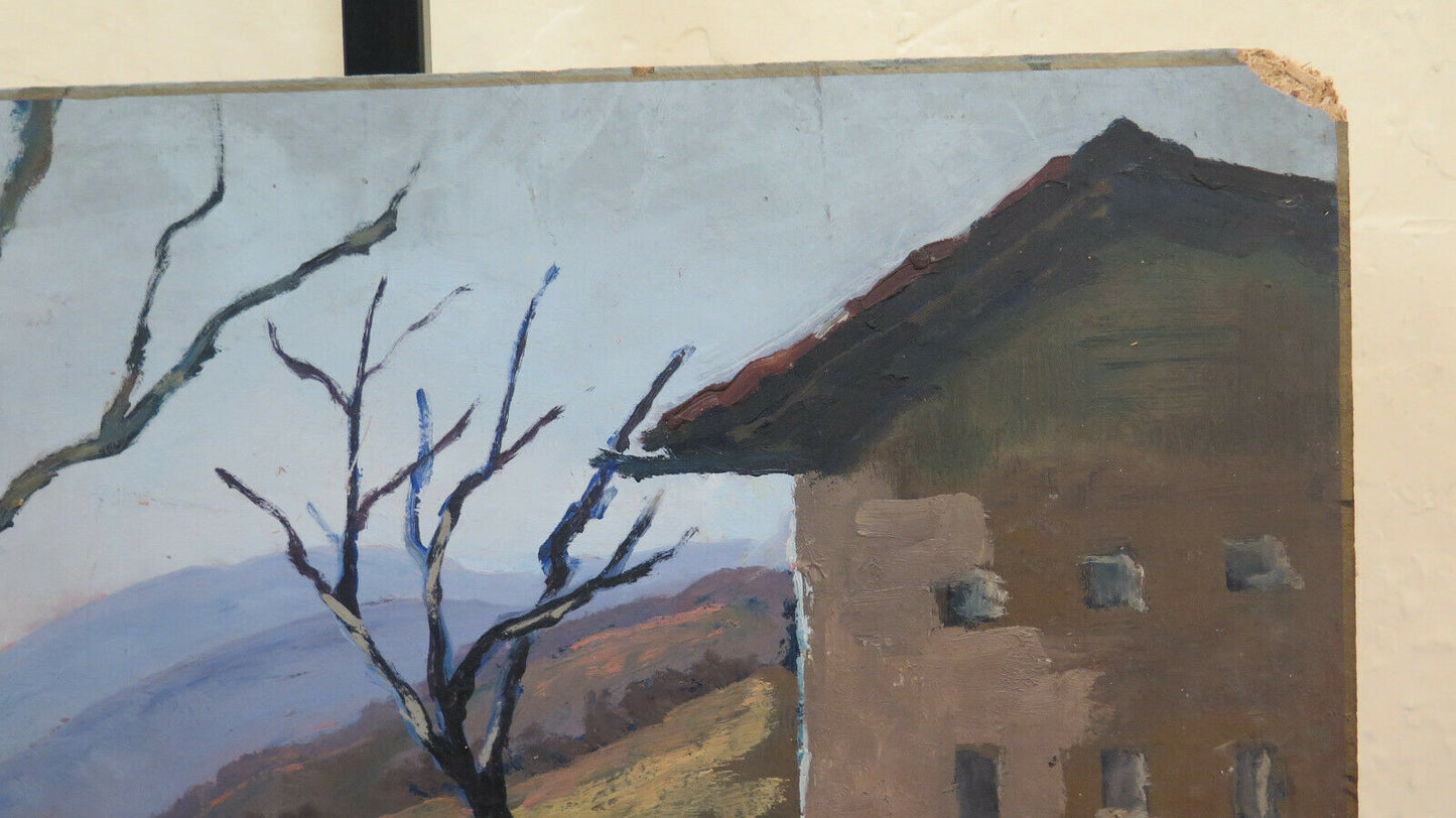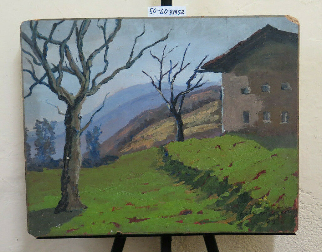 QUADRO AD OLIO SU TAVOLA VINTAGE PAESAGGIO DI CAMPAGNA ALPINO FIRMATO BM52