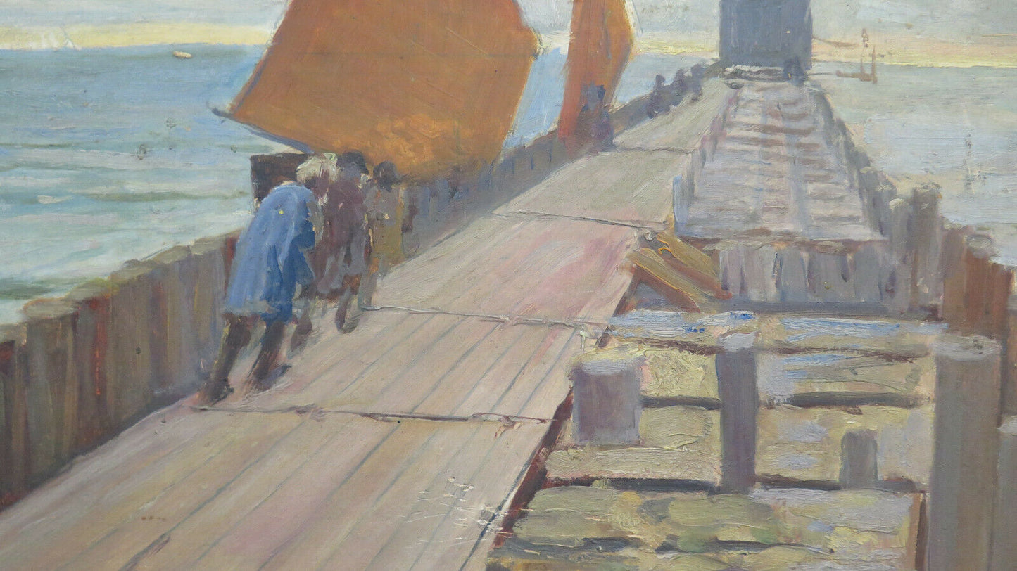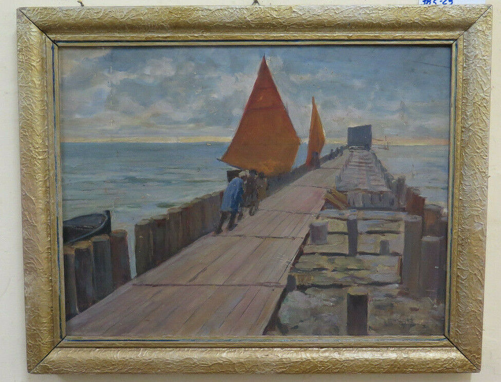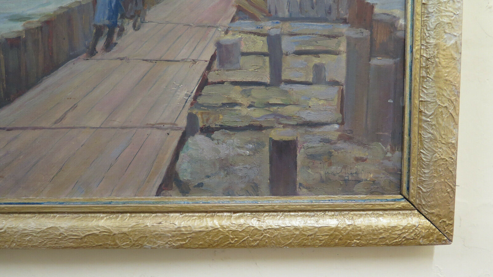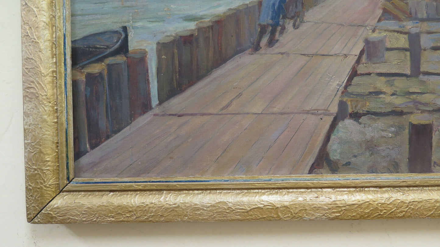 Veduta di un lungo molo con barche a vela ormeggiate e personaggi, completo di cornice in legno dorato coeva. Firma in basso a destra difficilmente leggibile.