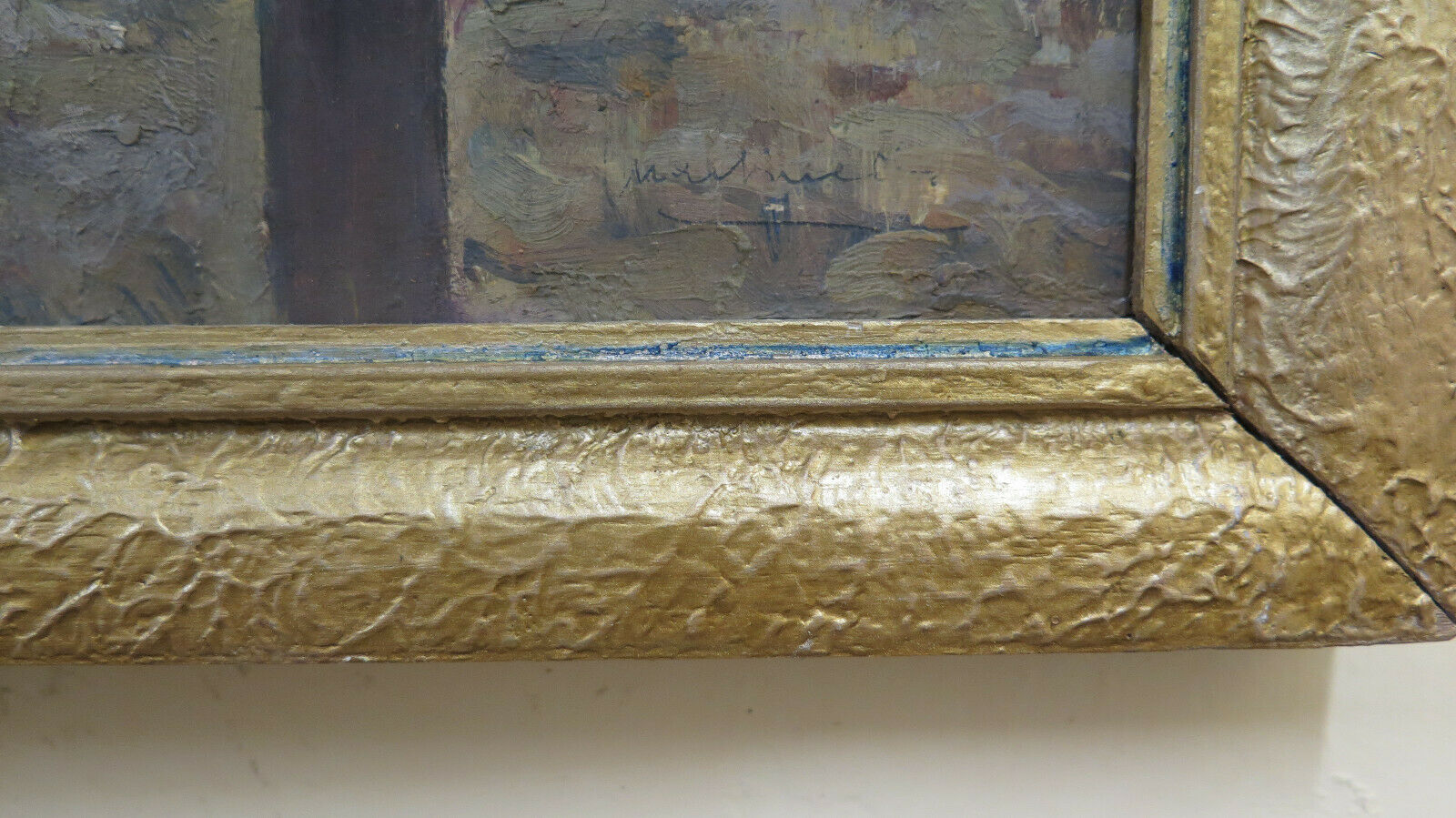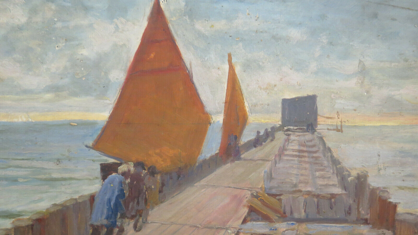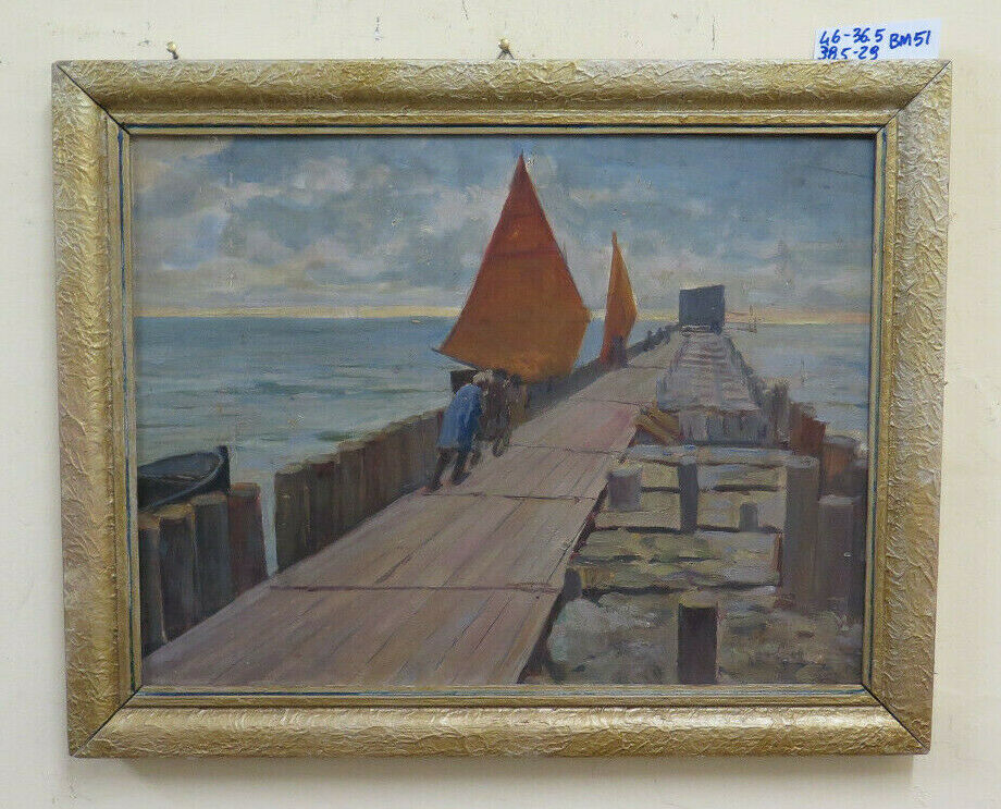 Veduta di un lungo molo con barche a vela ormeggiate e personaggi, completo di cornice in legno dorato coeva. Firma in basso a destra difficilmente leggibile.