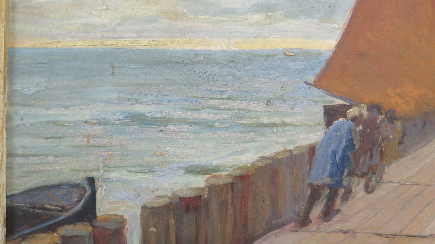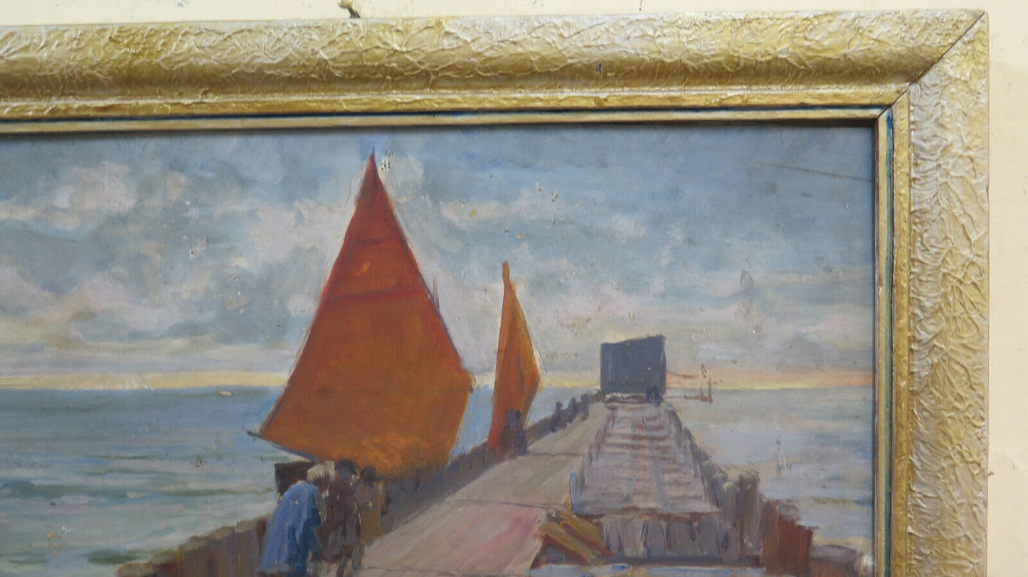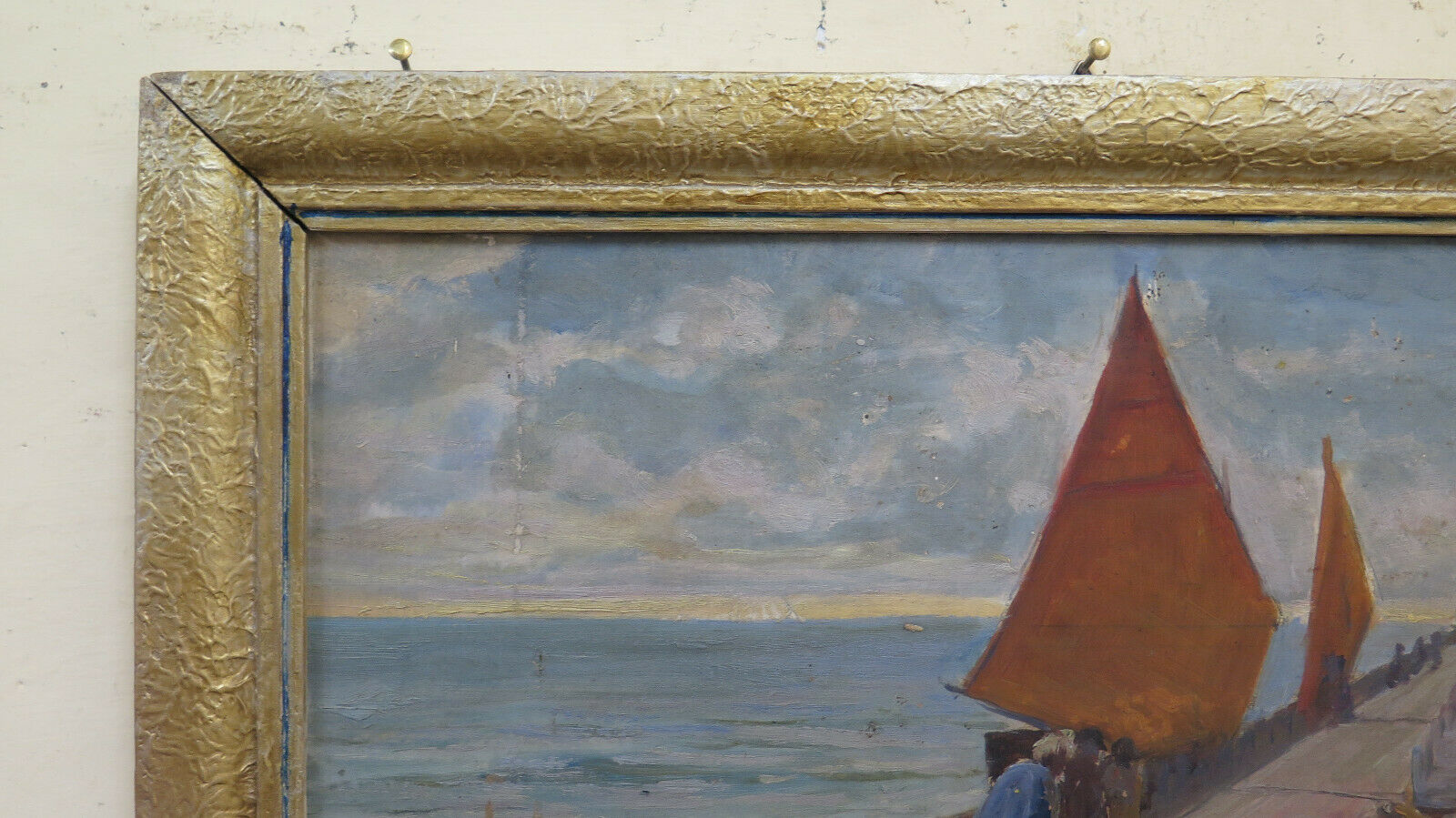 QUADRO ANTICO AD OLIO SU TAVOLA VEDUTA MARE MARINA PERSONAGGI BARCA VELA BM51