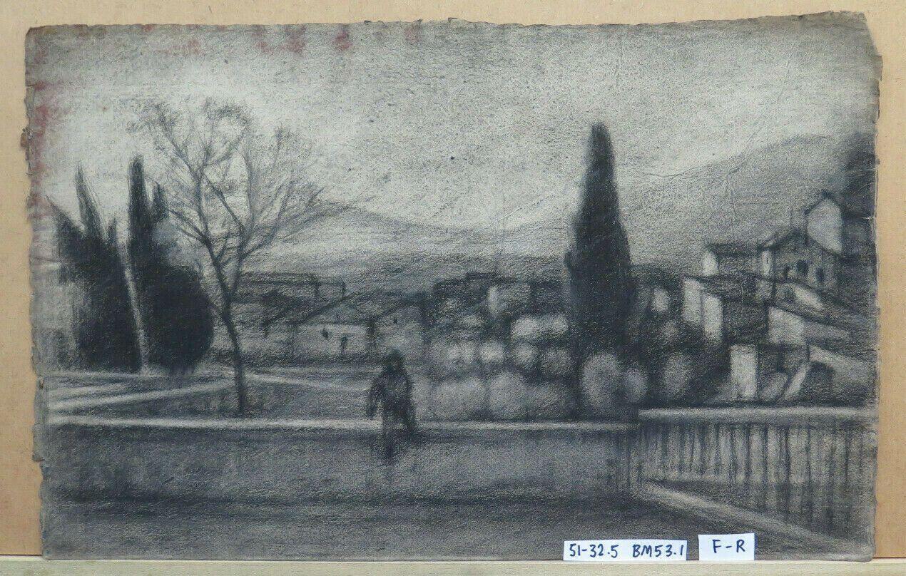 Grande disegno fronte retro con veduta di campagna ed interno chiesa al retro, probabilmente uno studio realizzato in età giovanile ispirato ad un dipinto antico.
