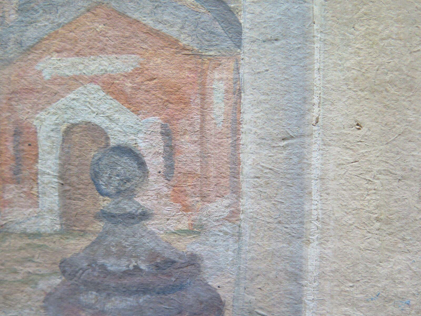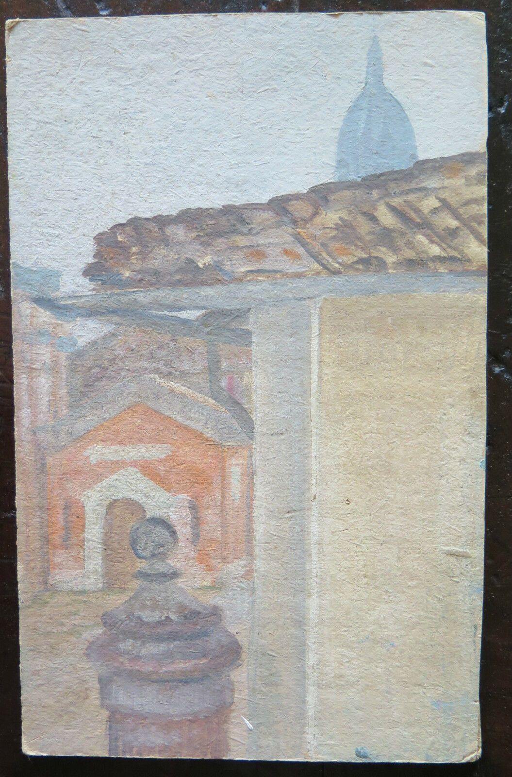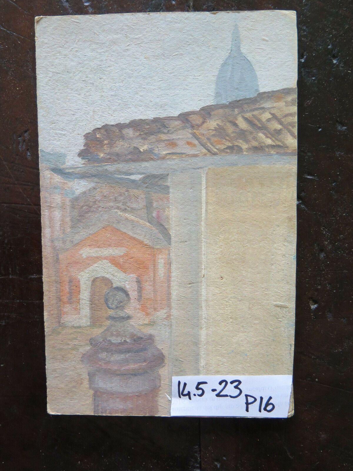 QUADRO ANTICO DIPINTO AD ACQUERELLO SU TAVOLA PAESAGGIO VEDUTA CITTADINA p16