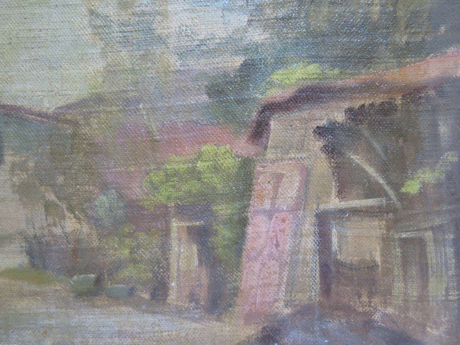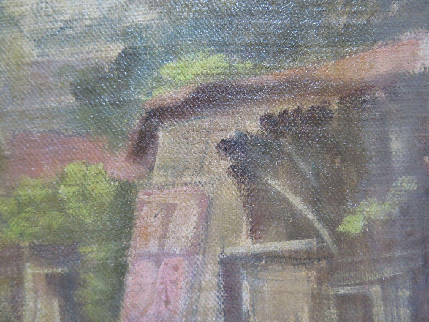 Particolare dipinto ad olio su tavola, romantica veduta di campagna, opera dell'artista Gaetano Pancaldi (1922-2014).