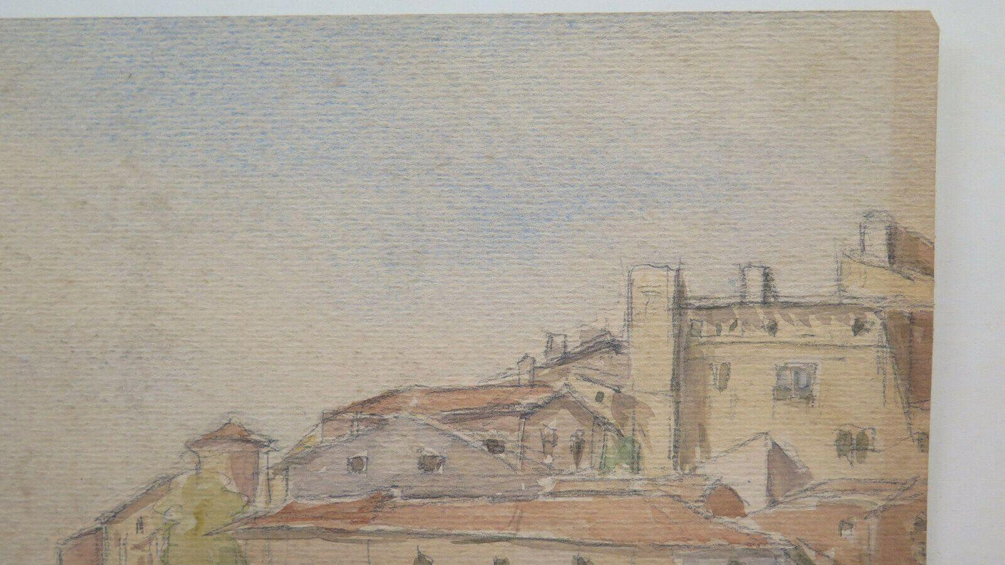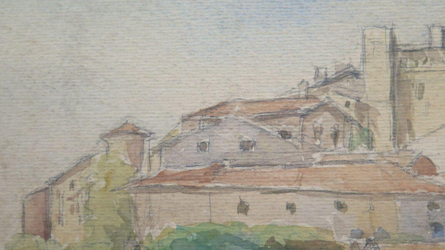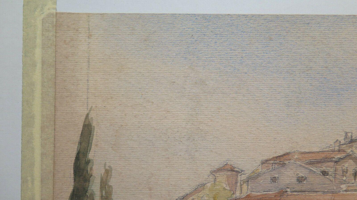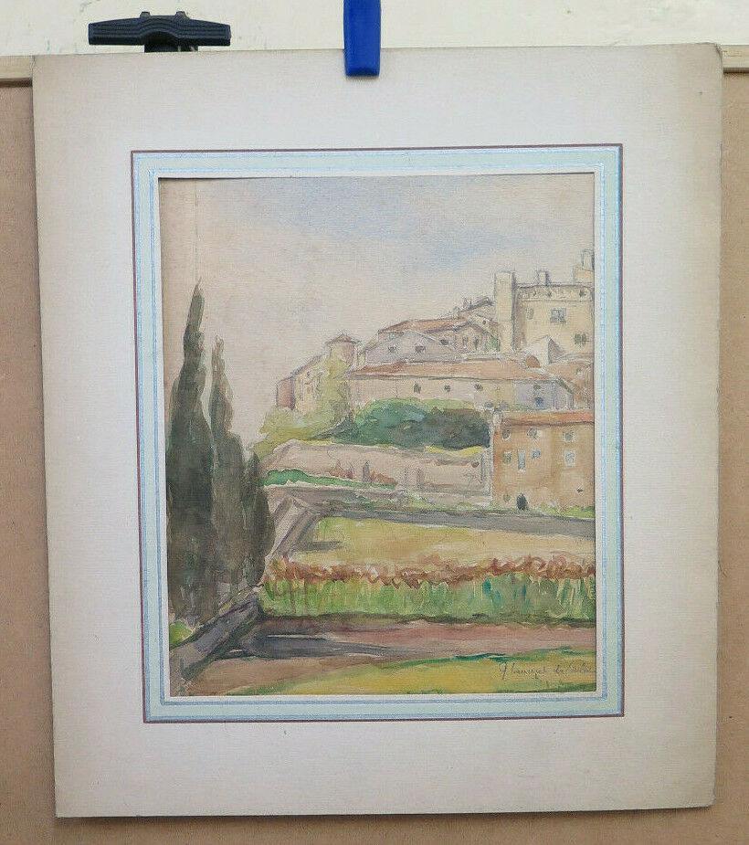 QUADRO ANTICO FIRMATO PAESAGGIO VEDUTA PAESE FRANCIA ACQUERELLO SU CARTA BM53.2