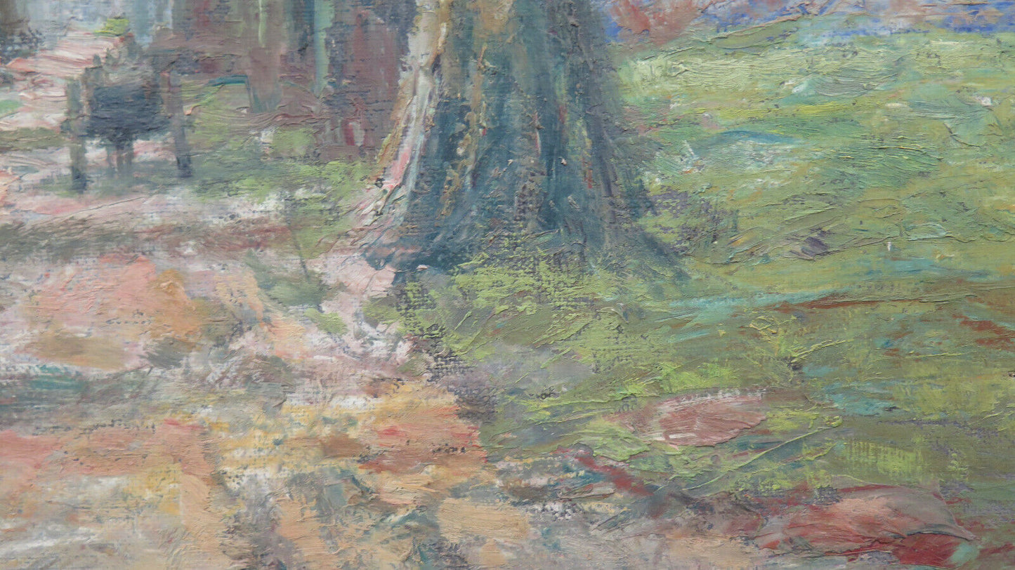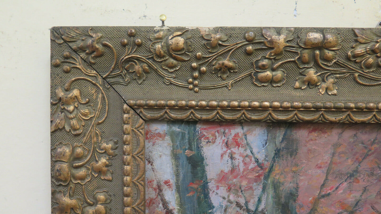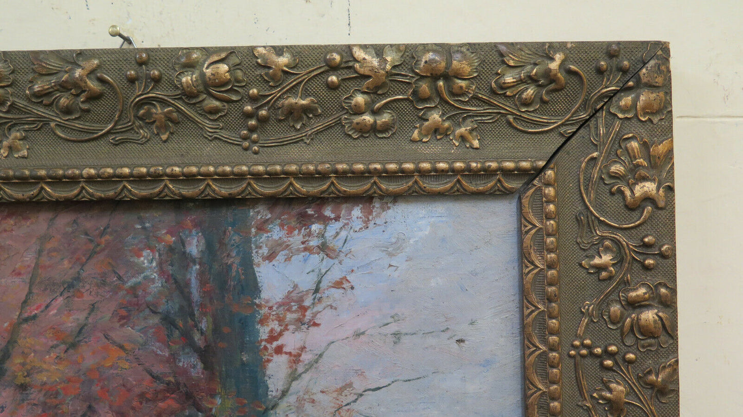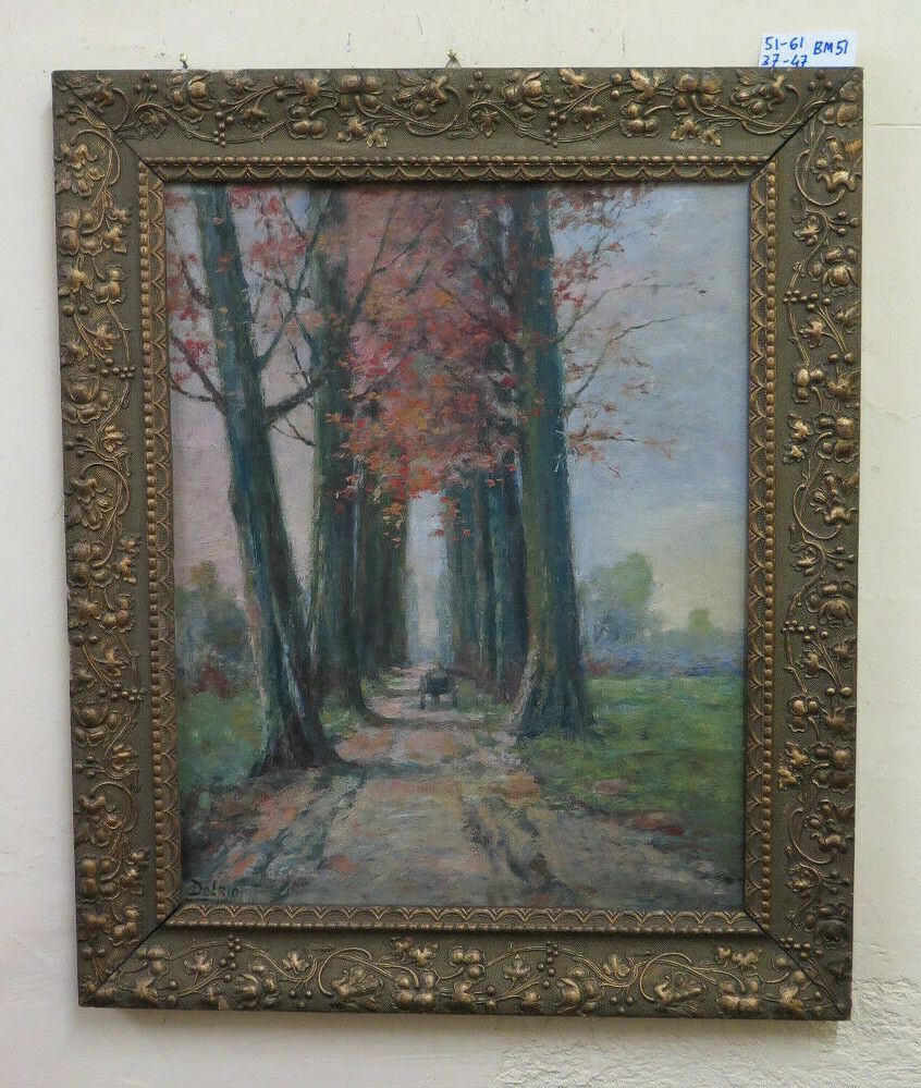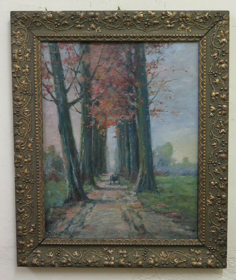 Finissimo paesaggio di campagna di gusto impressionista e dai colori autunnali con una carrozza che percorre un lungo viale alberato. Completo di cornice in legno art nouveau.