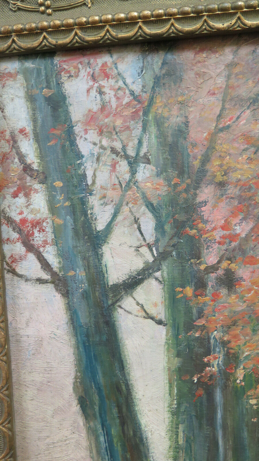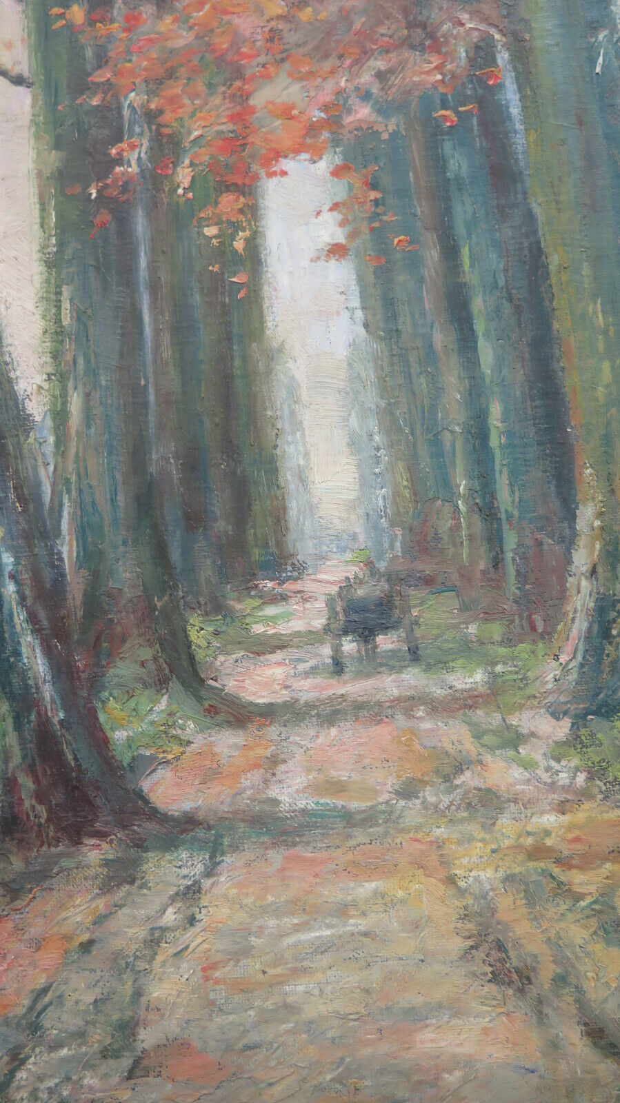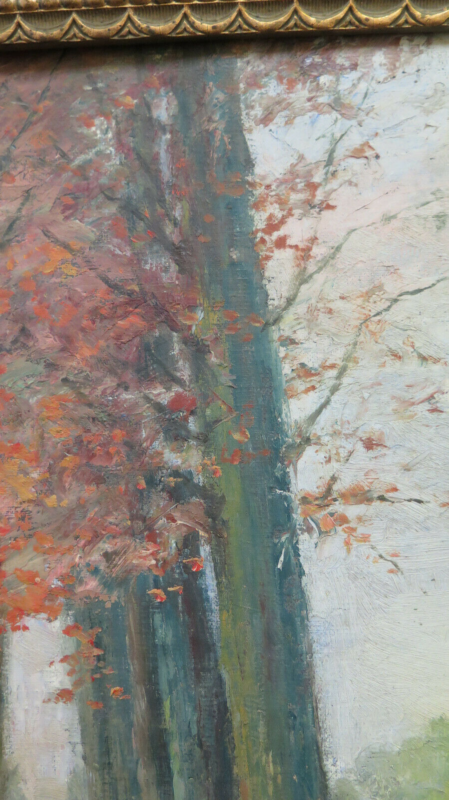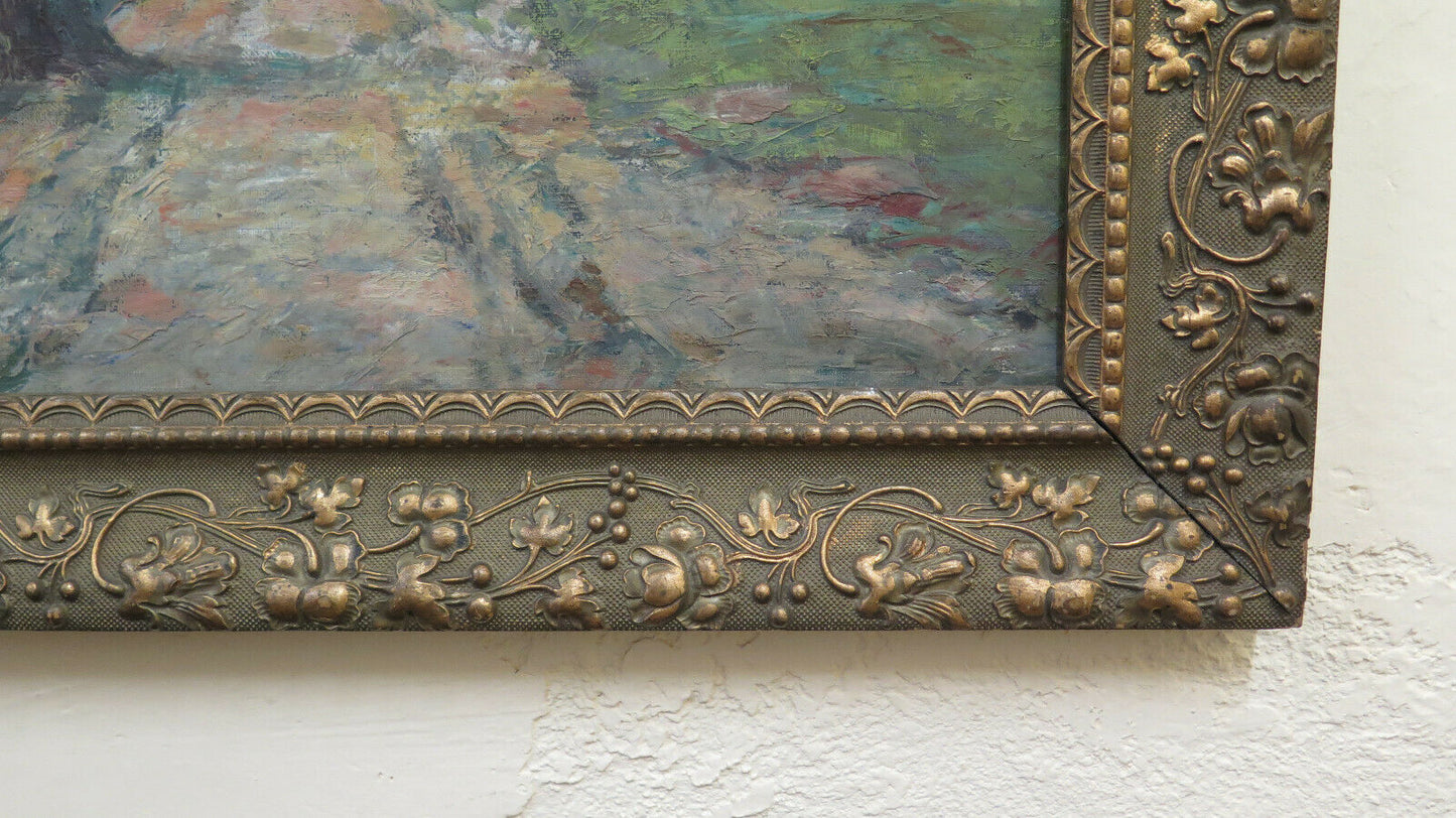Finissimo paesaggio di campagna di gusto impressionista e dai colori autunnali con una carrozza che percorre un lungo viale alberato. Completo di cornice in legno art nouveau.