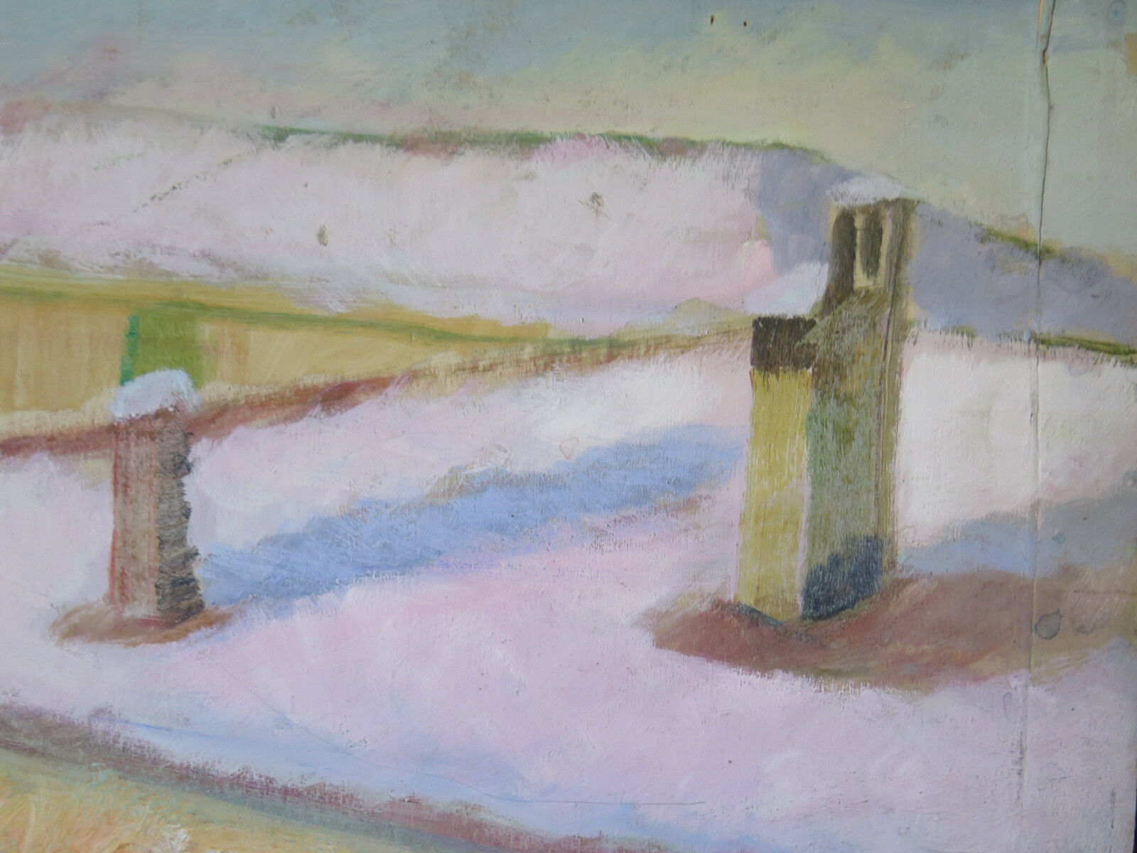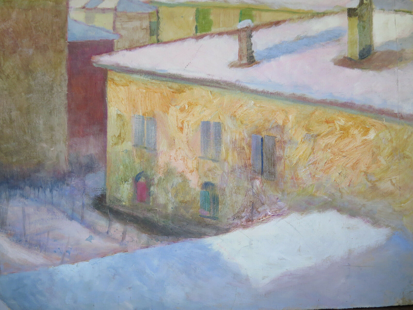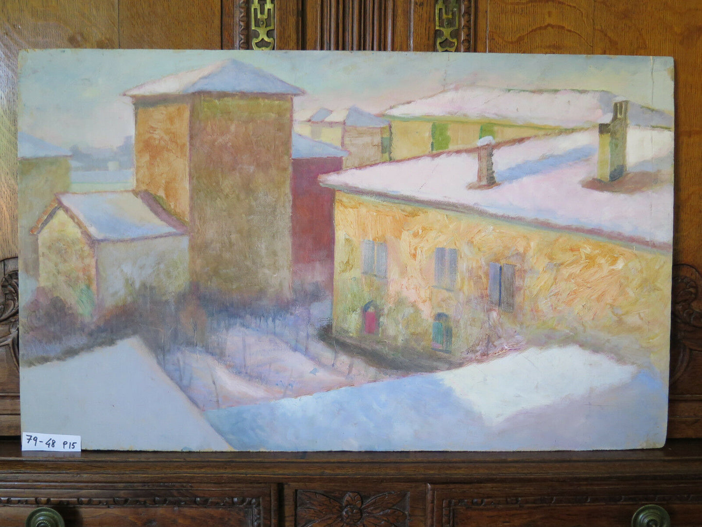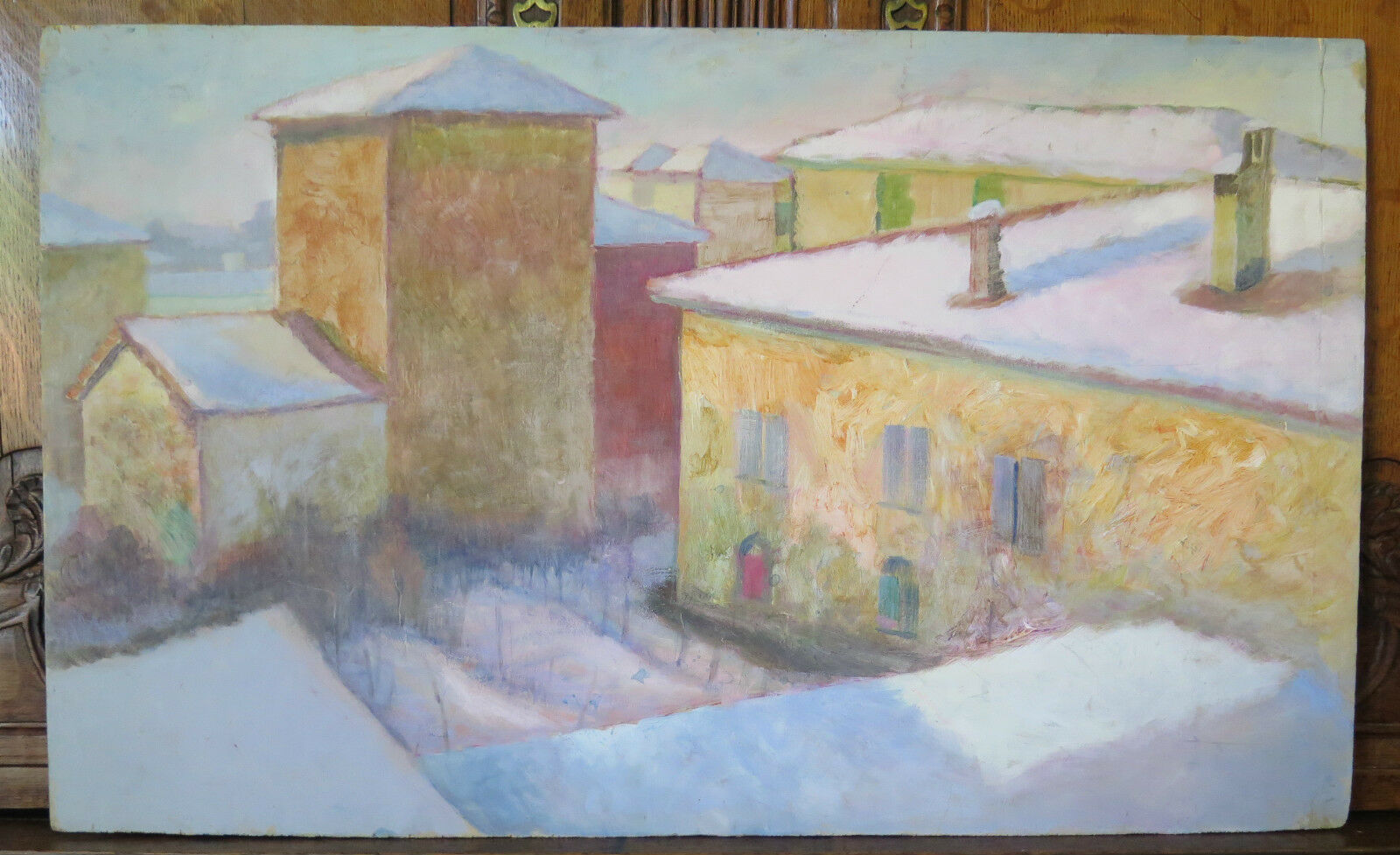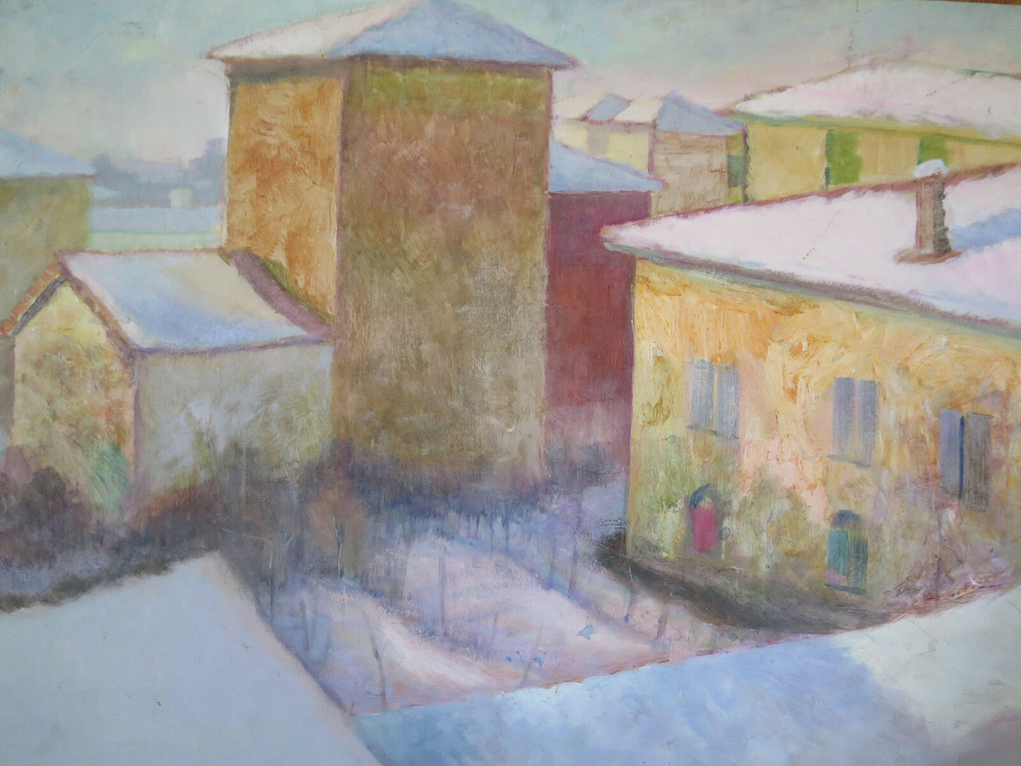 Dipinto ad olio su tavola realizzato dal pittore modenese Gaetano Pancaldi (1922-2014) verso la metà del Novecento, suggestiva veduta del paese natale dell'artista in inverno.