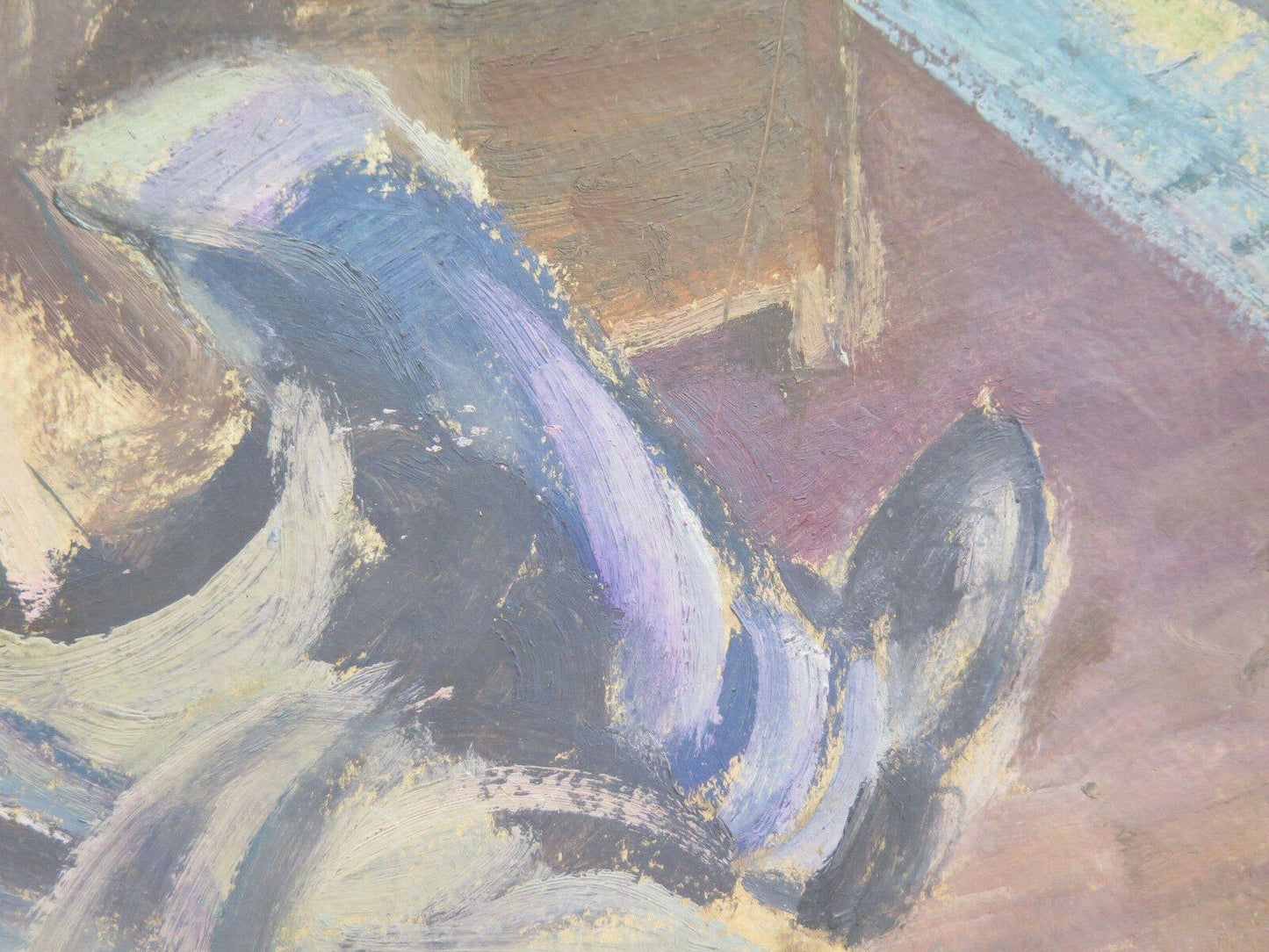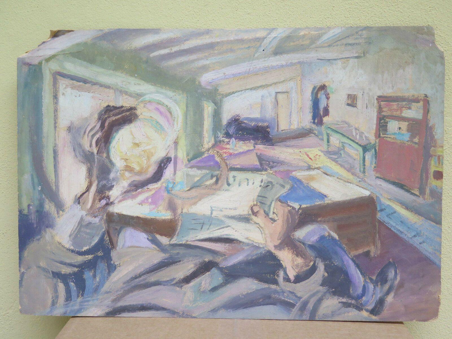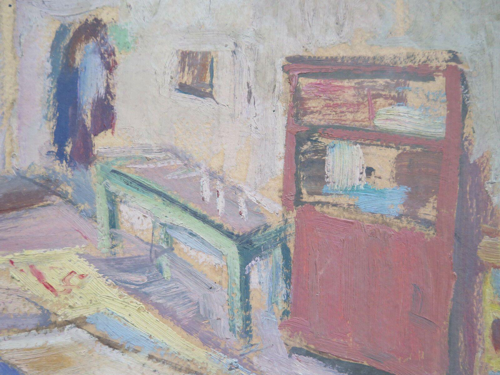 Bellissimo dipinto ad olio su tavola realizzato dal pittore modendese Gaetano Pancaldi durante la seconda metà del novecento che rappresenta la veduta dello studio dell'artista in soggettiva, soggetto caro all'autore che amava dipingere la vita quotidiana. Colori tenui e tratto di gusto impressionista.
