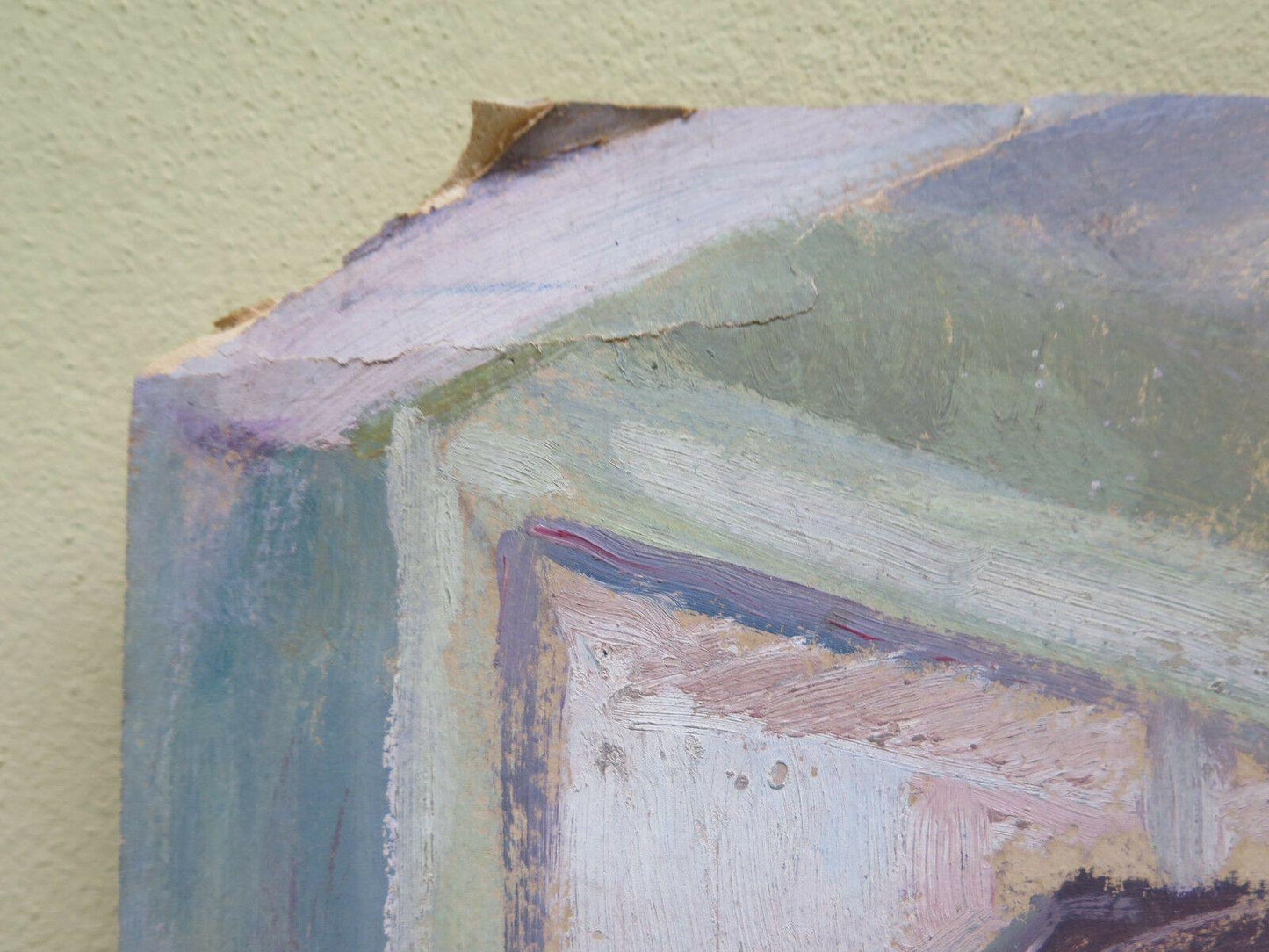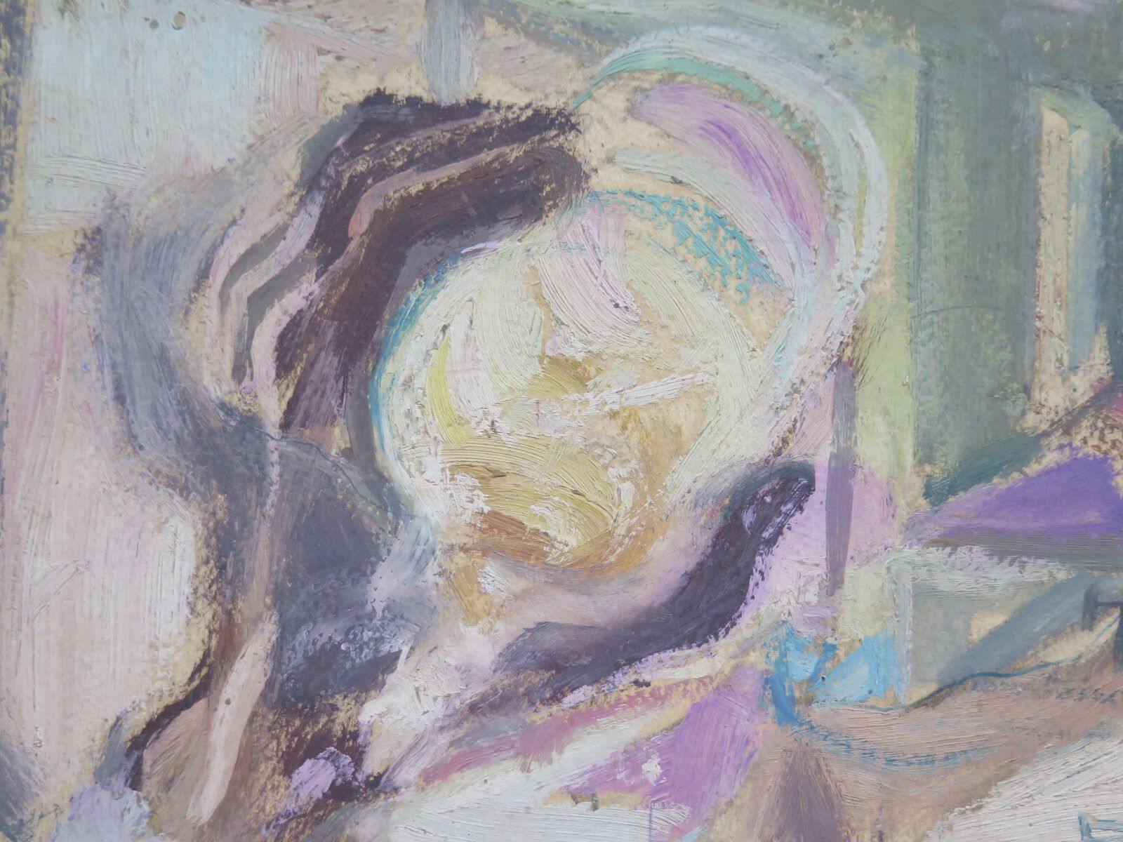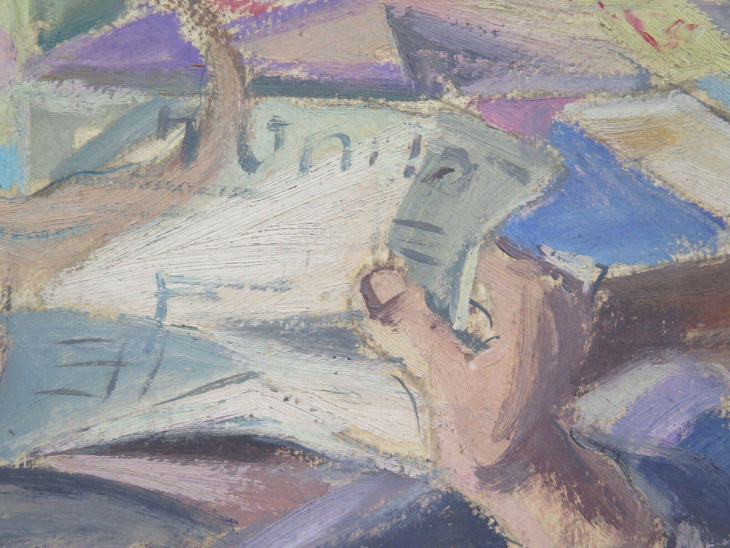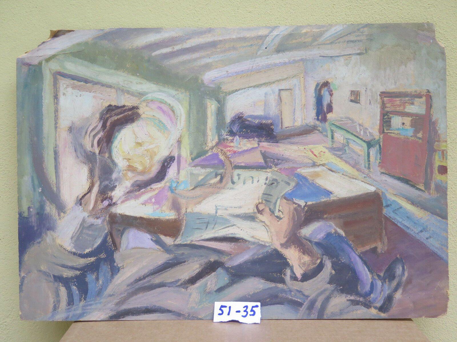 Bellissimo dipinto ad olio su tavola realizzato dal pittore modendese Gaetano Pancaldi durante la seconda metà del novecento che rappresenta la veduta dello studio dell'artista in soggettiva, soggetto caro all'autore che amava dipingere la vita quotidiana. Colori tenui e tratto di gusto impressionista.