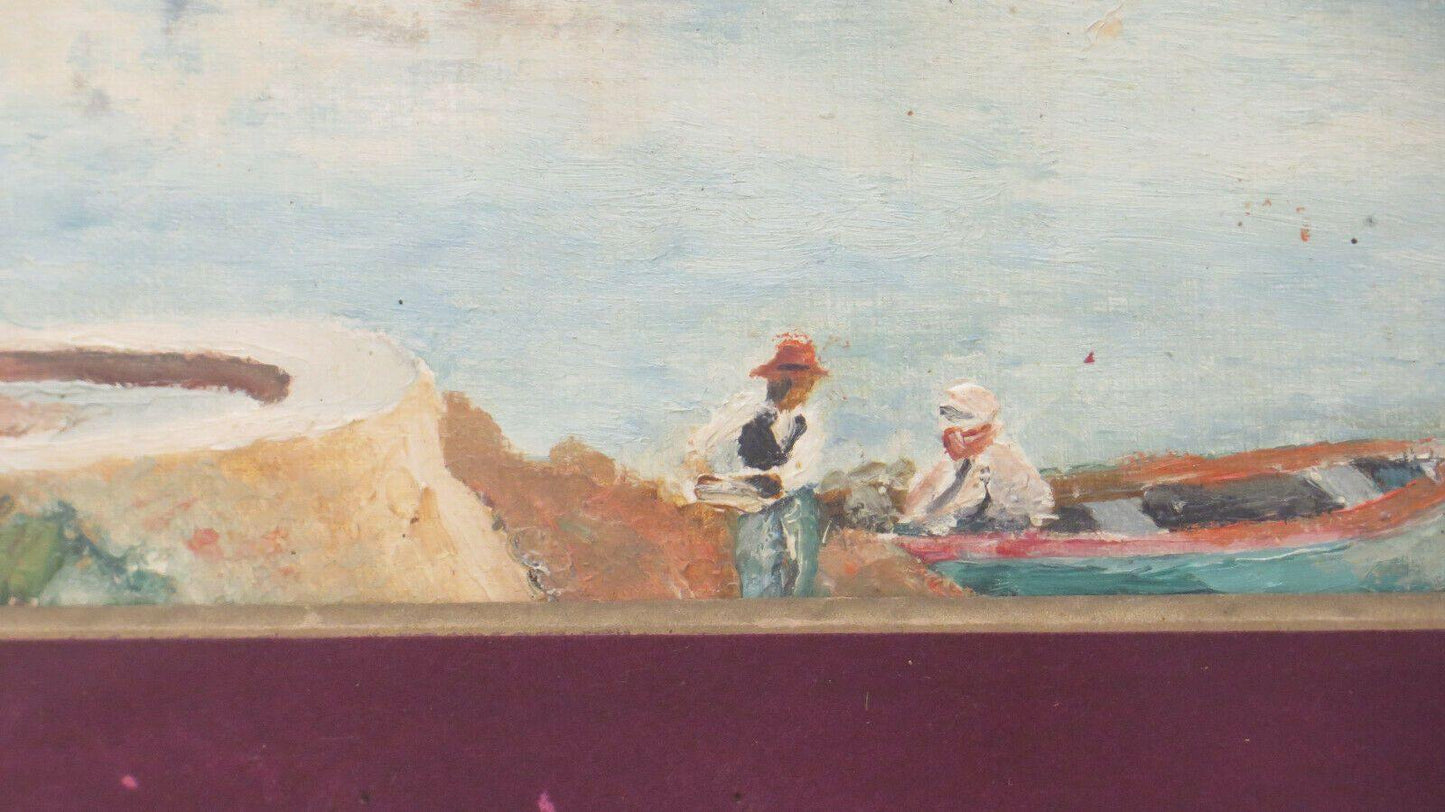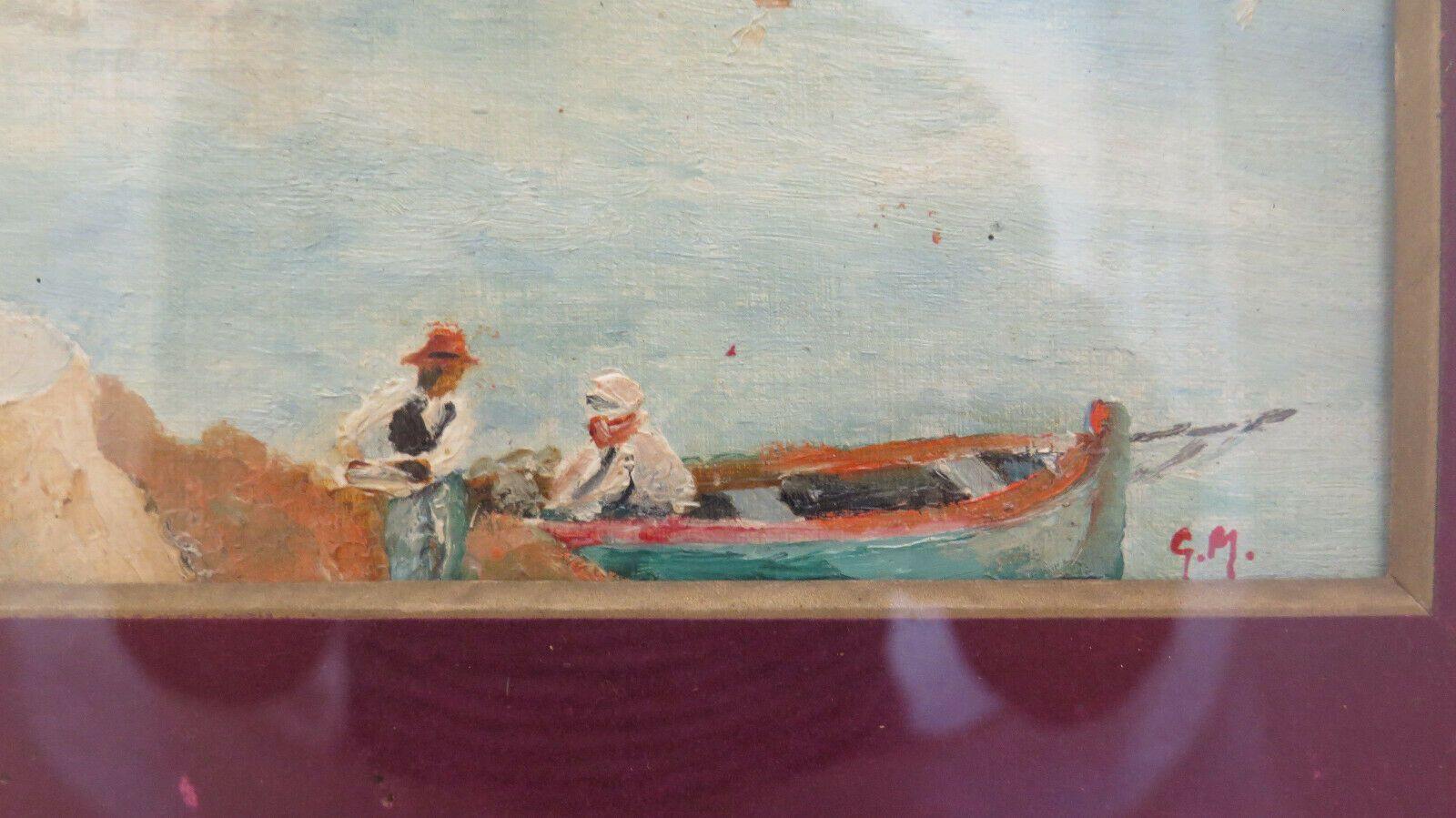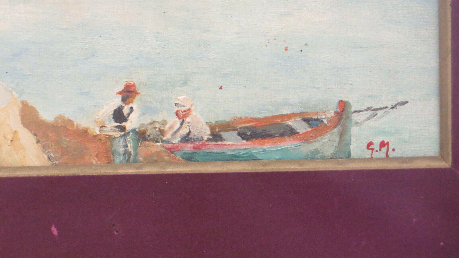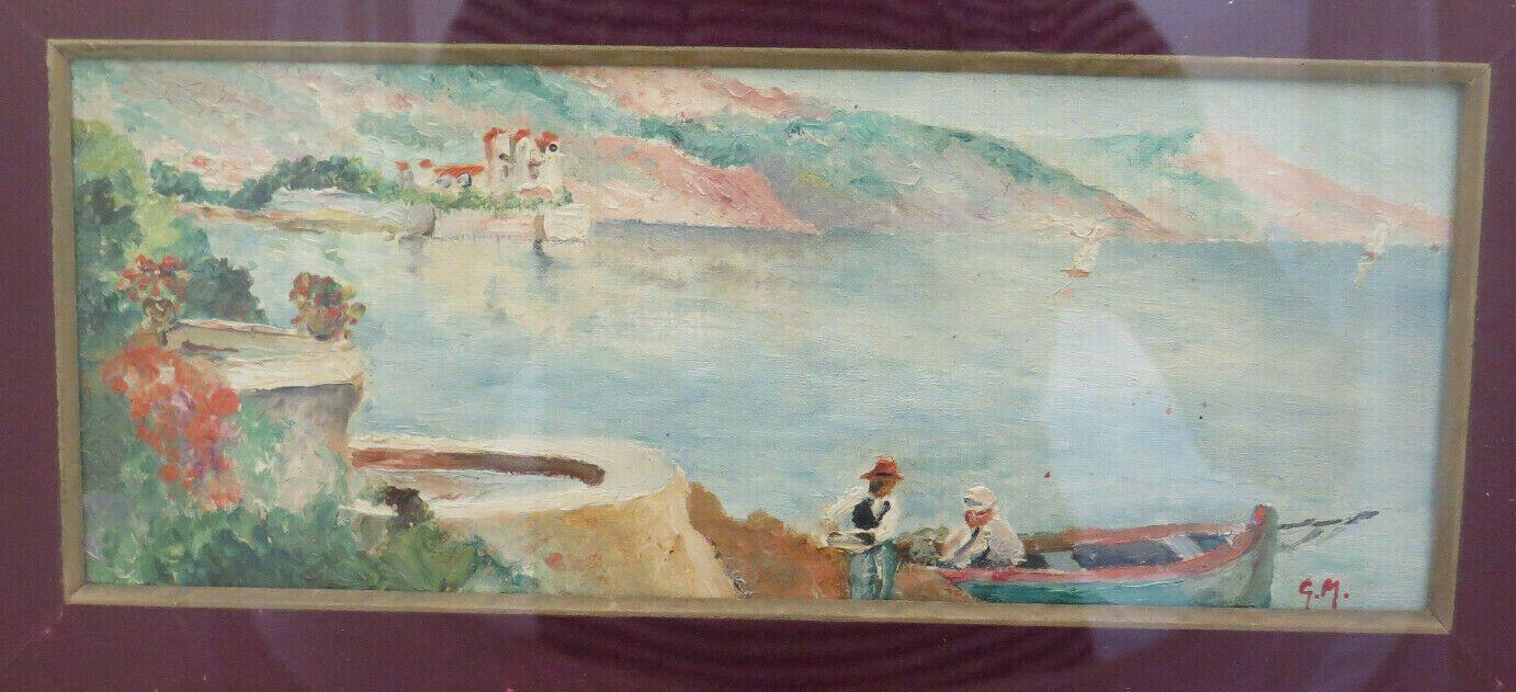 Suggestivo scorcio della riviera francese con barche e pescatori, siglato G.M. in basso a destra e completo di cornice di legno dorato coeva.