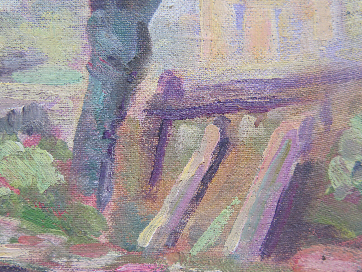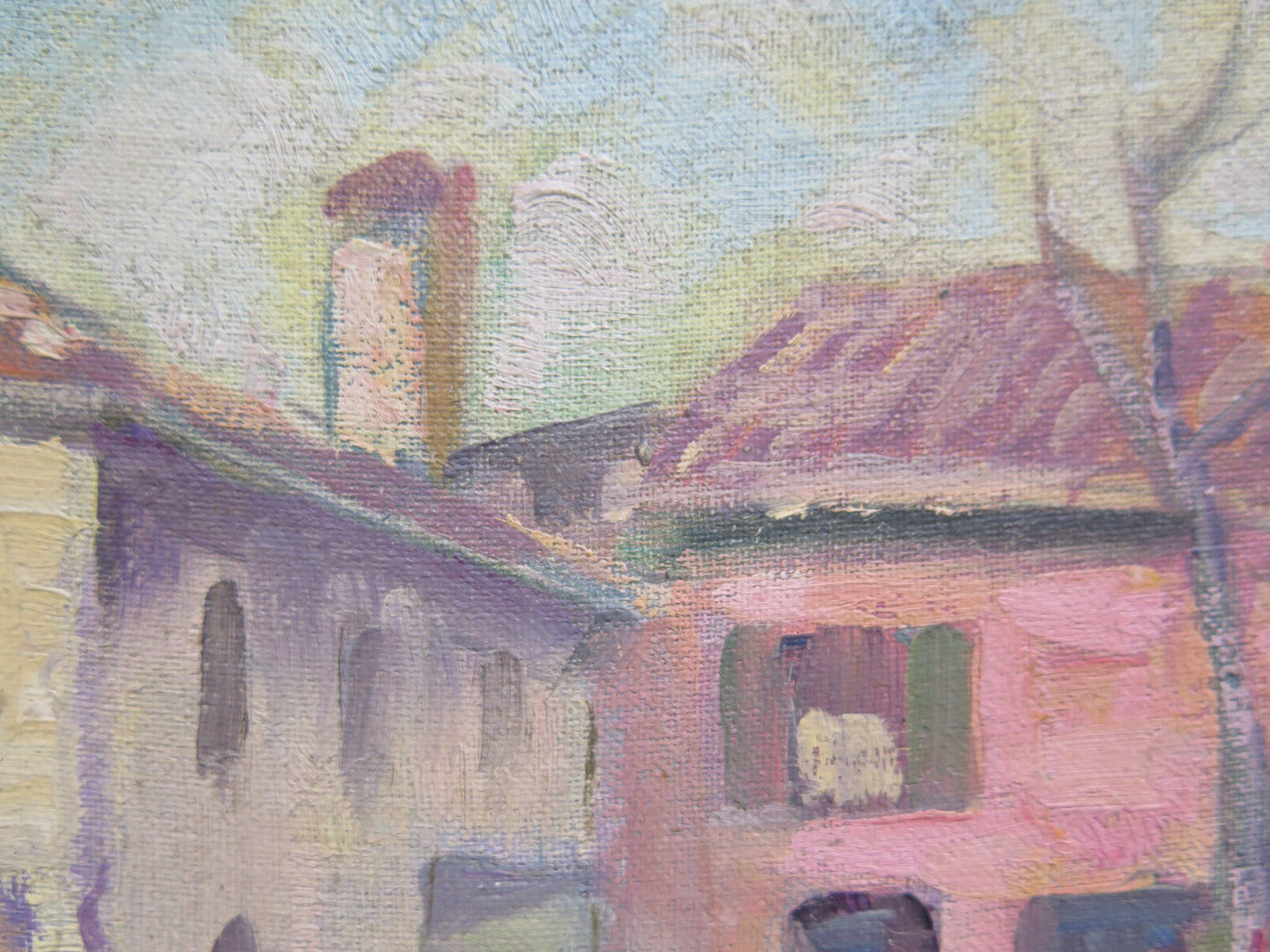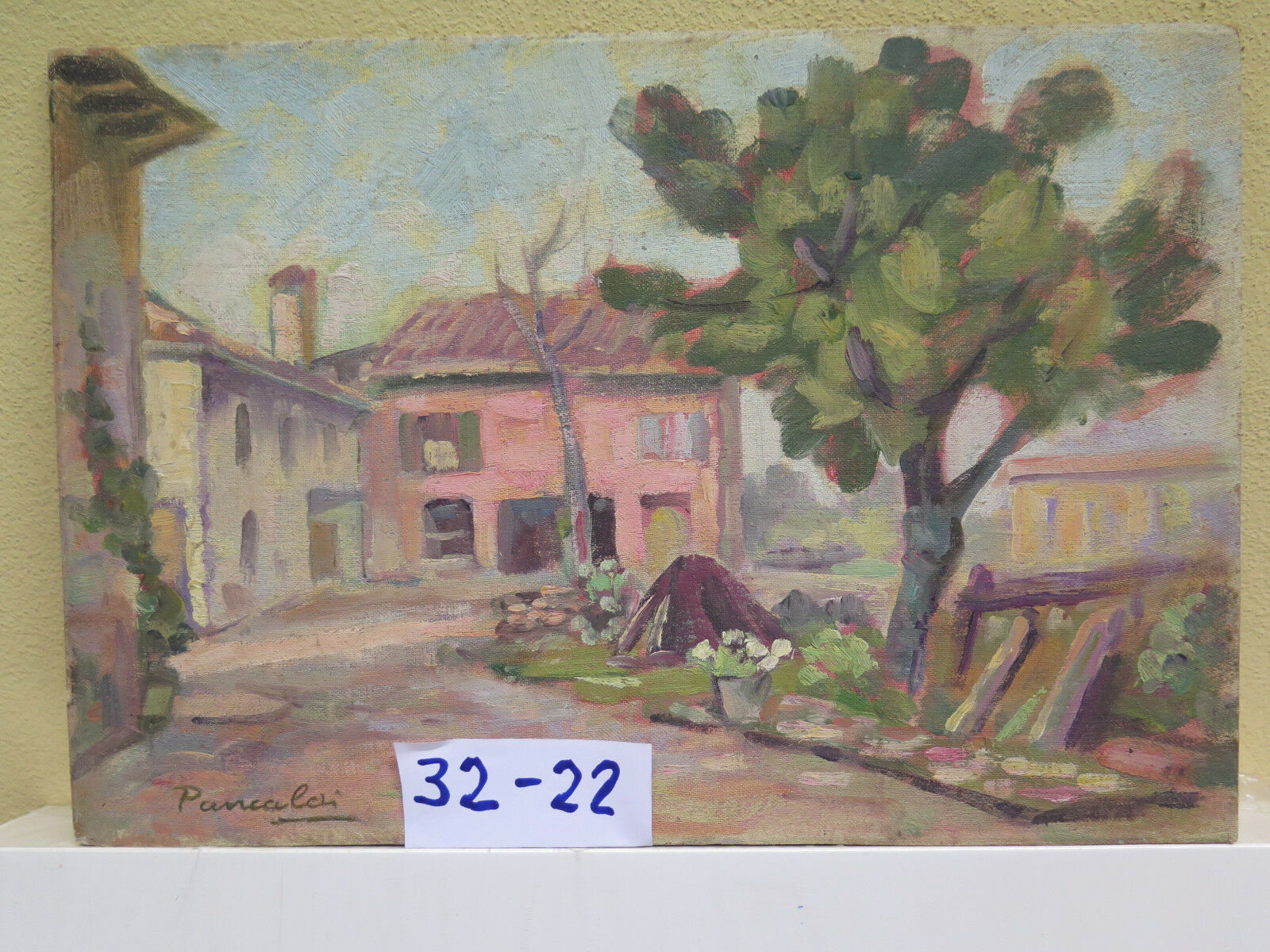 Elegante dipinto ad olio su tavola, veduta di una cascina emiliana con l'aia.