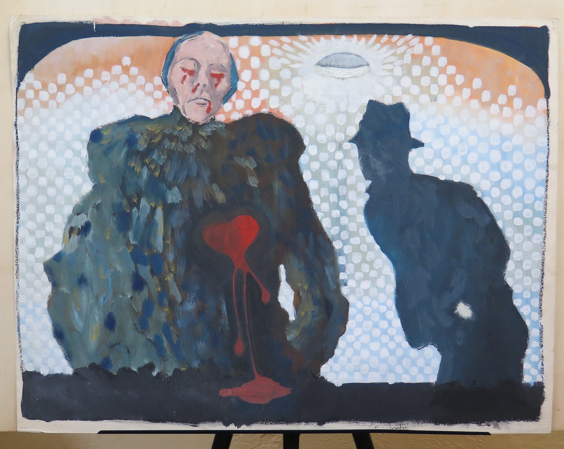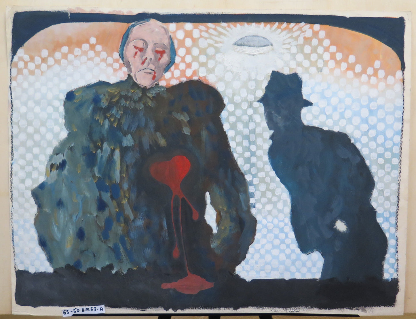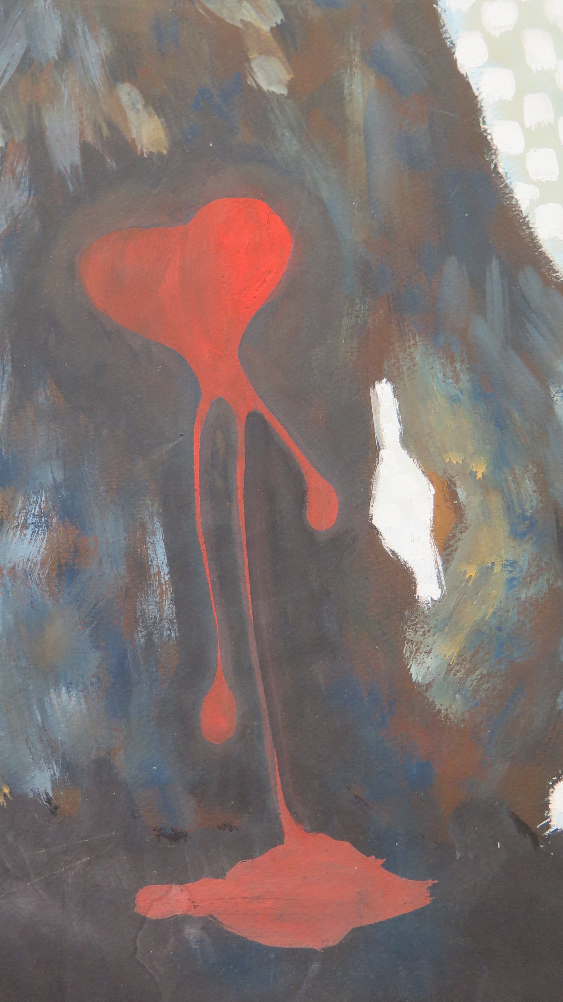 Particolare dipinto dove una sagoma maschile osserva una donna con il cuore sanguinante.