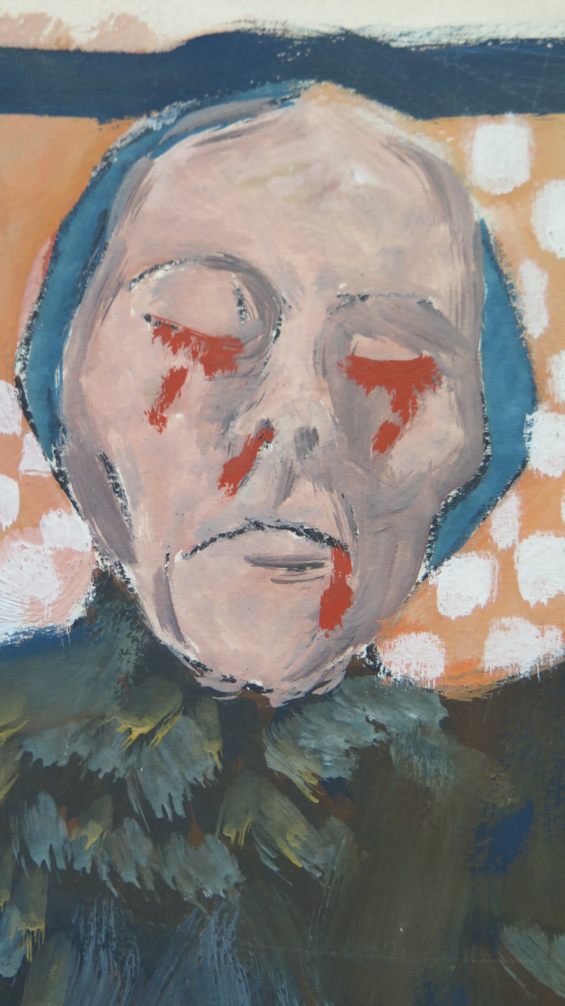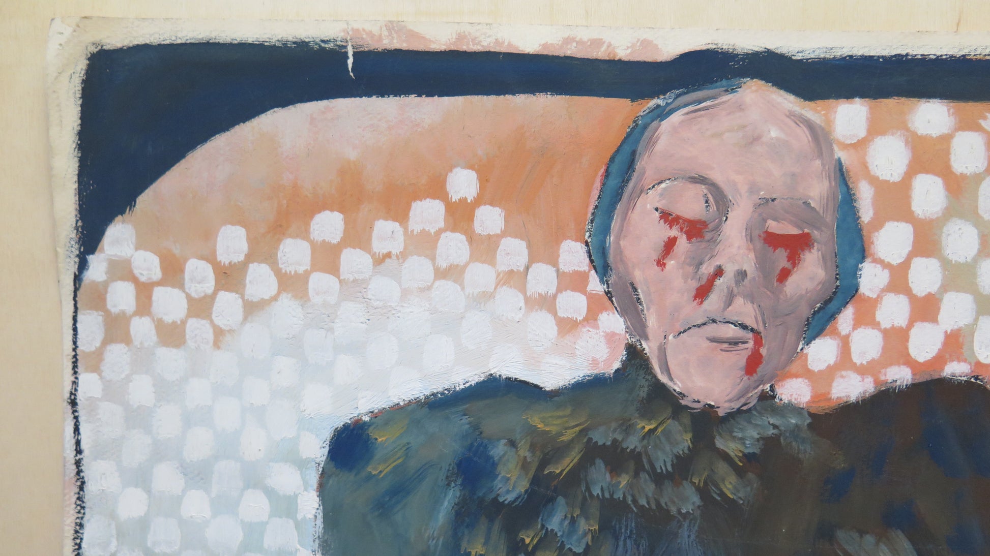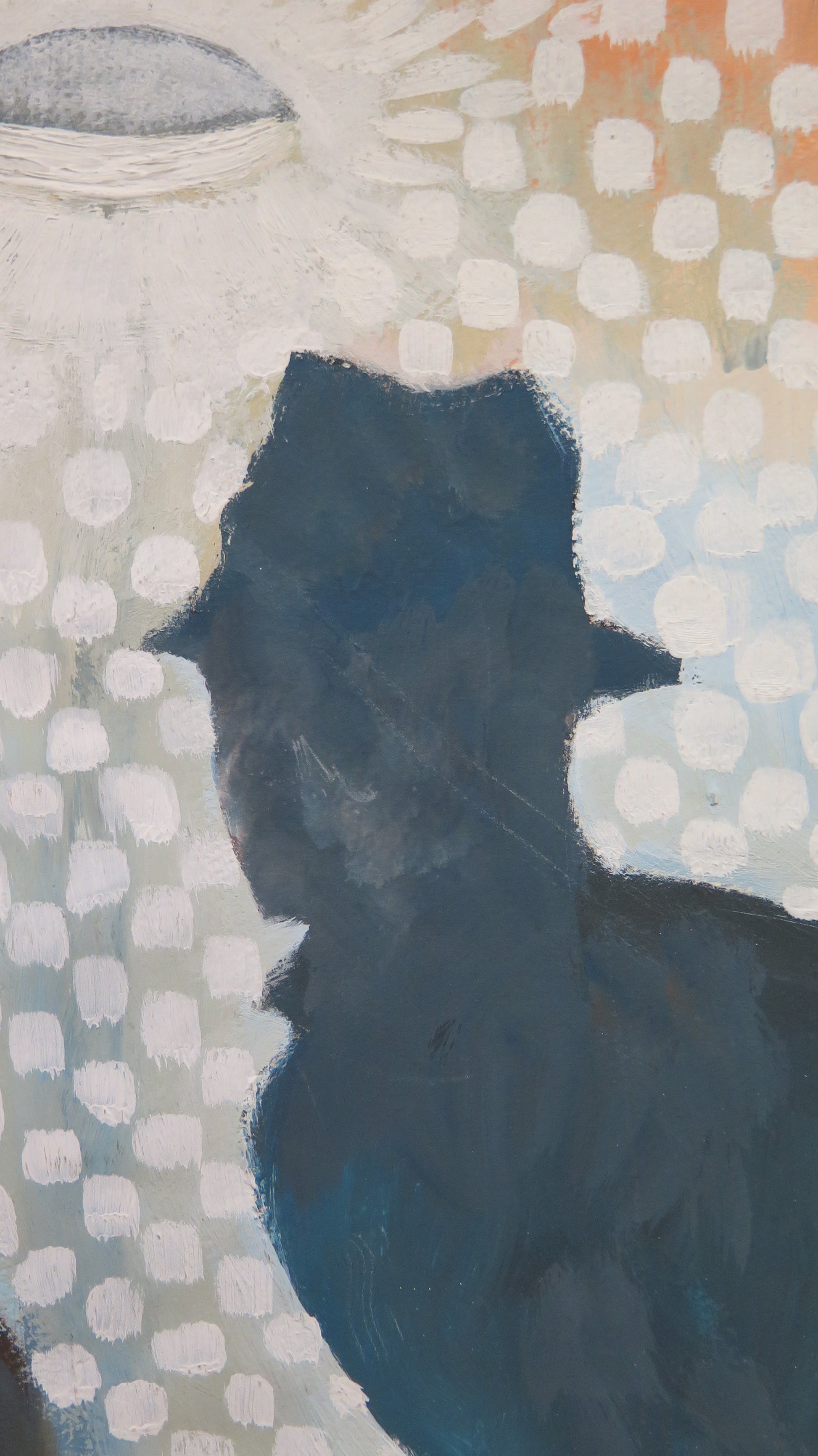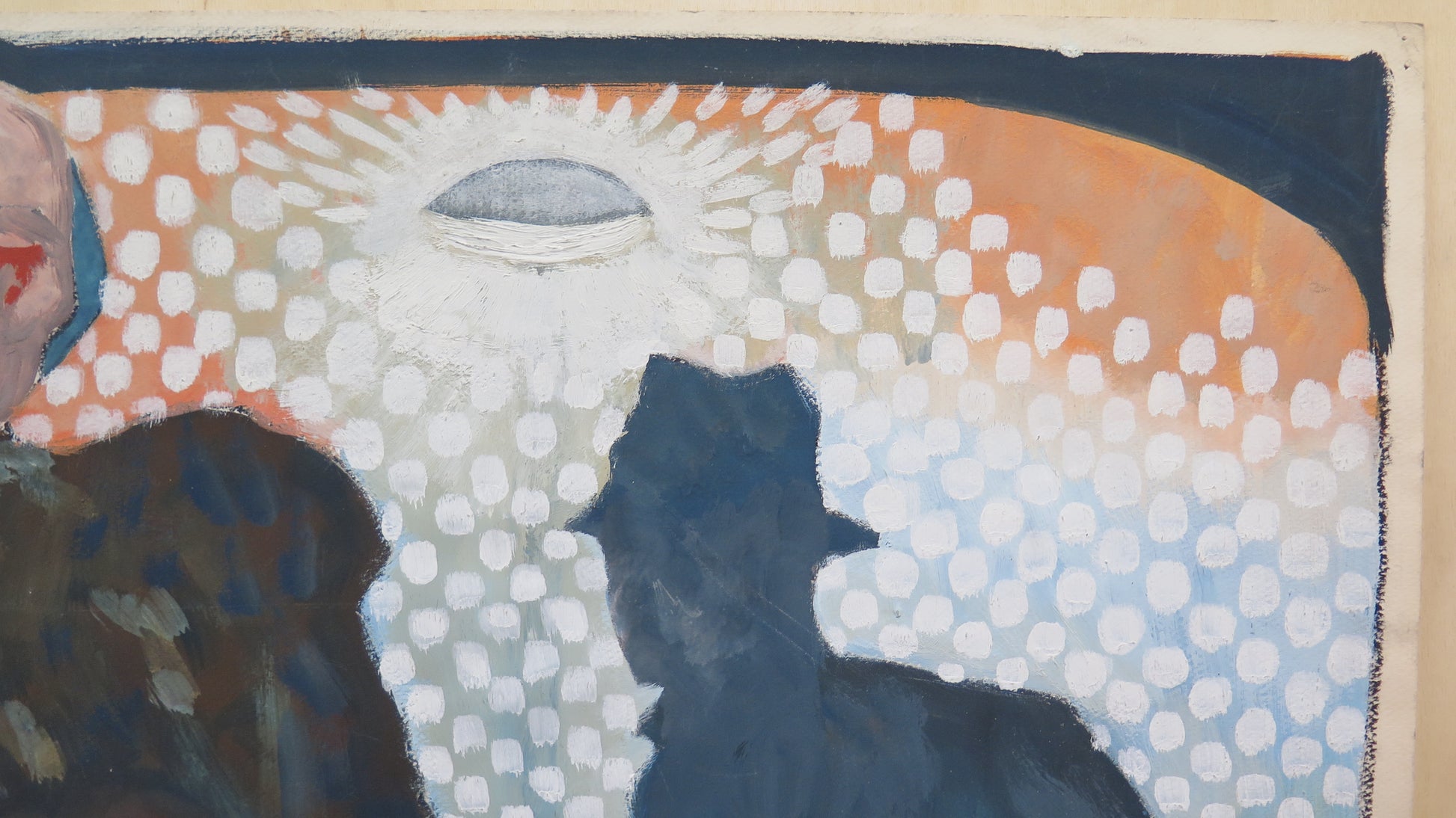 Particolare dipinto dove una sagoma maschile osserva una donna con il cuore sanguinante.