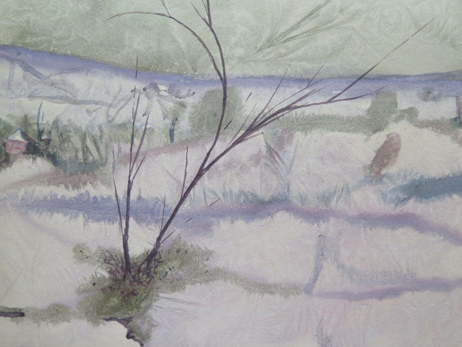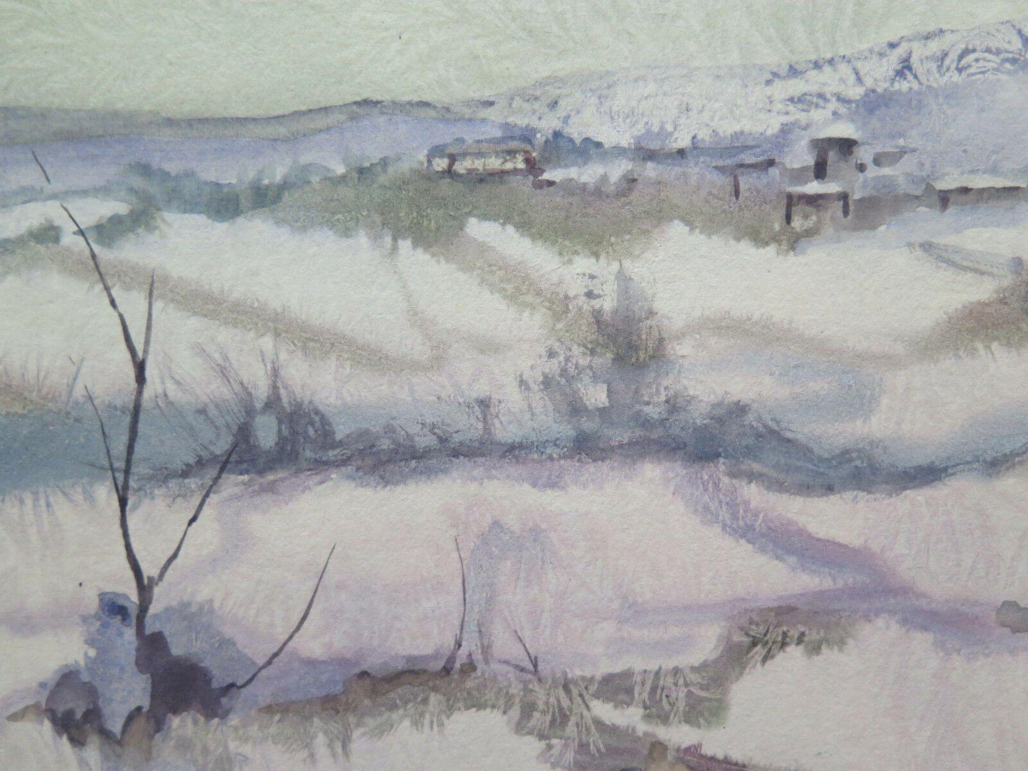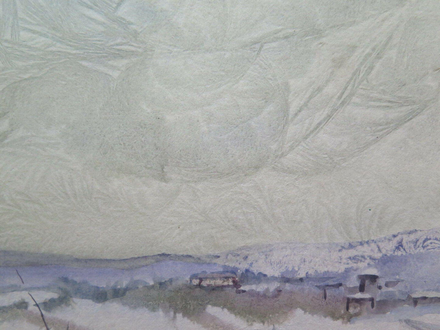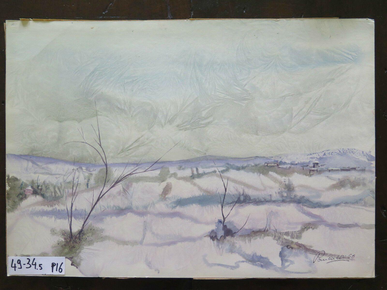 Particolare dipinto su tavola opera del pittore Gaetano Pancaldi (1922-2014) di Piumazzo di Castelfranco Emilia in cui viene raffigurato un paesaggio invernale con la tecnica del "gelo" elaborata dal pittore stesso e che consisteva nel collocare al freddo il dipinto appena realizzato in modo da ottenere un effetto simile al ghiaccio sulla superficie pittorica.