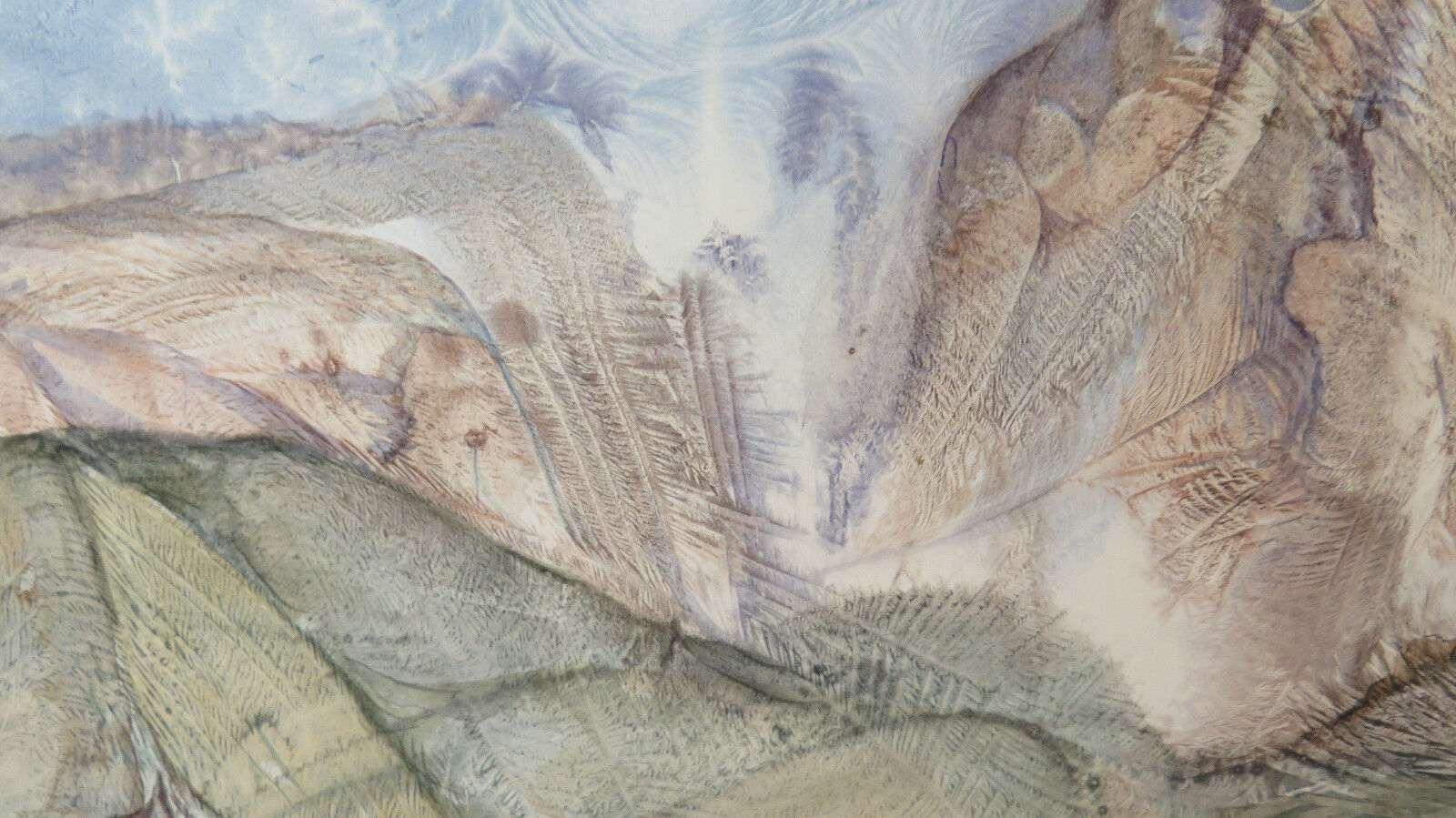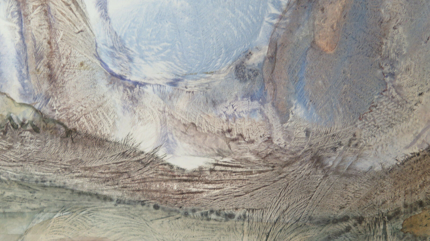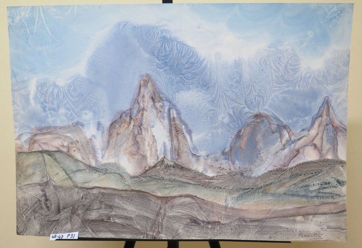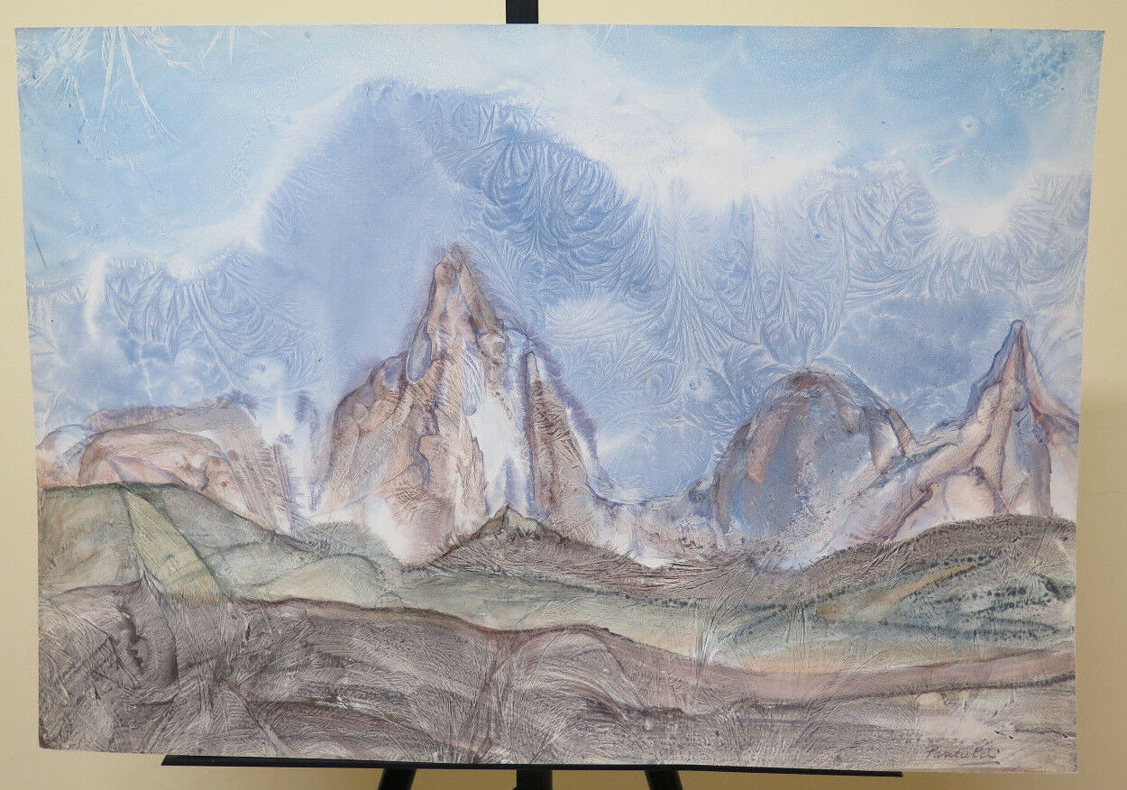Particolare dipinto ad acquerello su cartoncino eseguito dal pittore Gaetano Pancaldi (1922-1014) di Piumazzo di Castelfranco Emilia, il lavoro in questione è una originale visione delle Dolomiti, luogo di villeggiatura dell'autore.