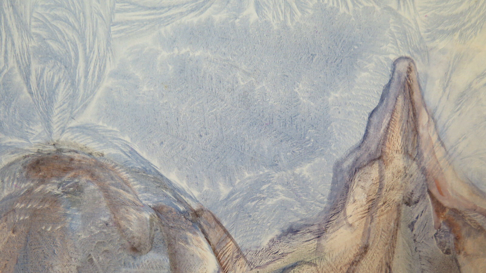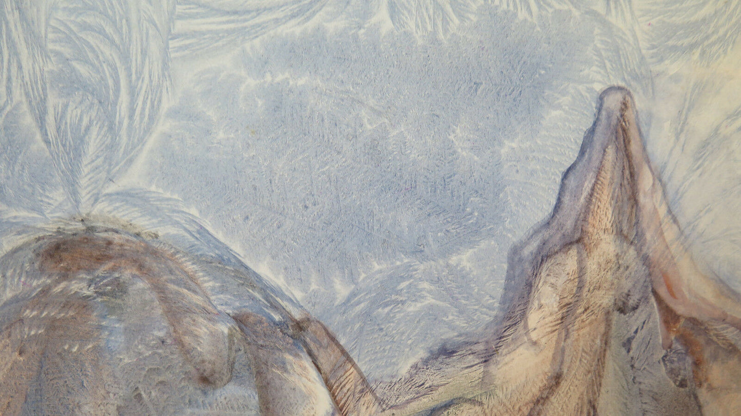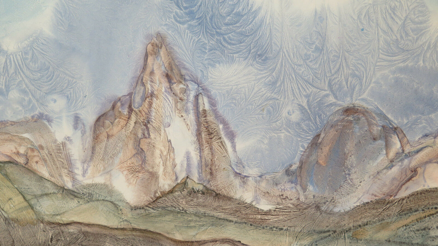 Particolare dipinto ad acquerello su cartoncino eseguito dal pittore Gaetano Pancaldi (1922-1014) di Piumazzo di Castelfranco Emilia, il lavoro in questione è una originale visione delle Dolomiti, luogo di villeggiatura dell'autore.