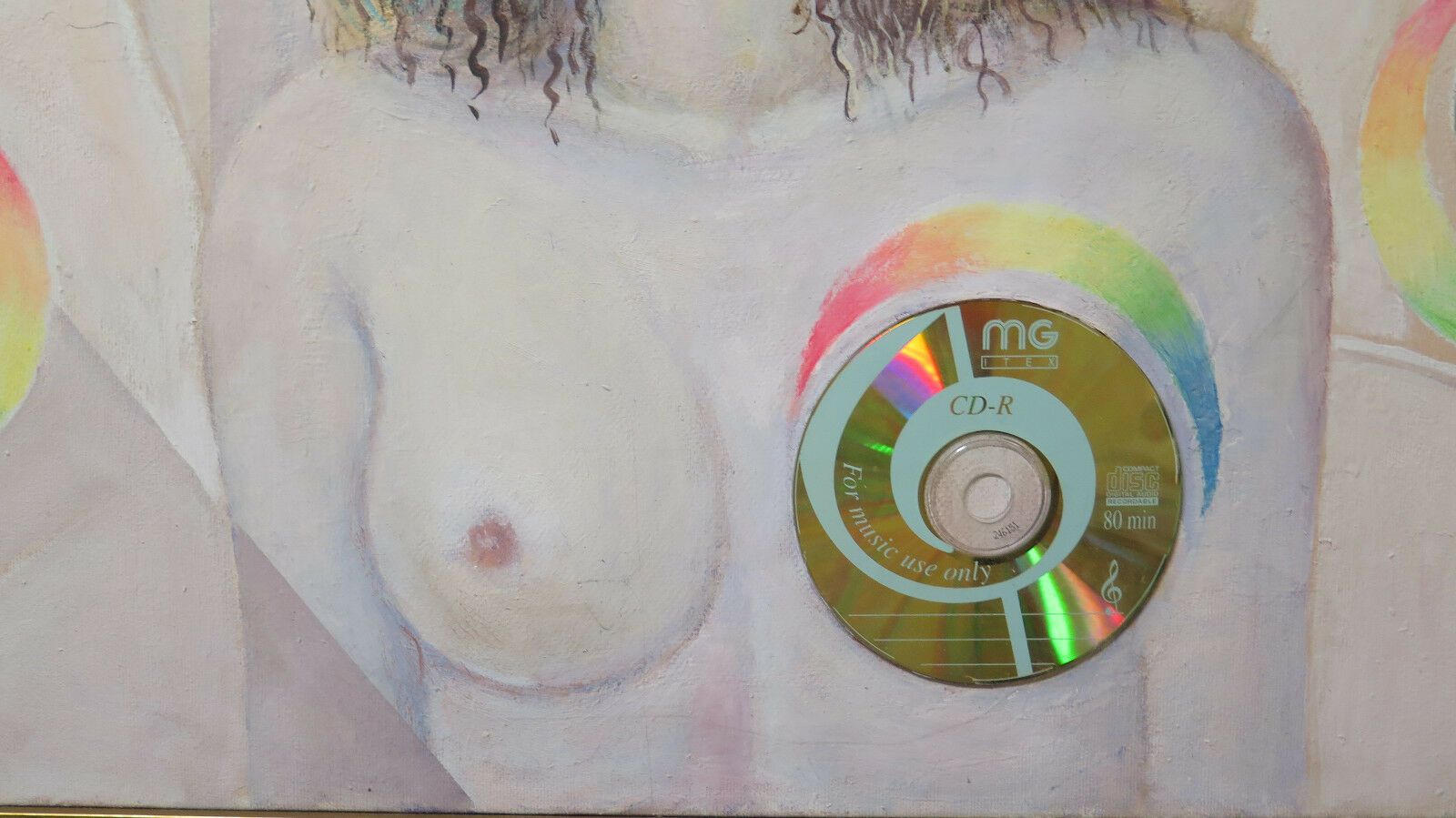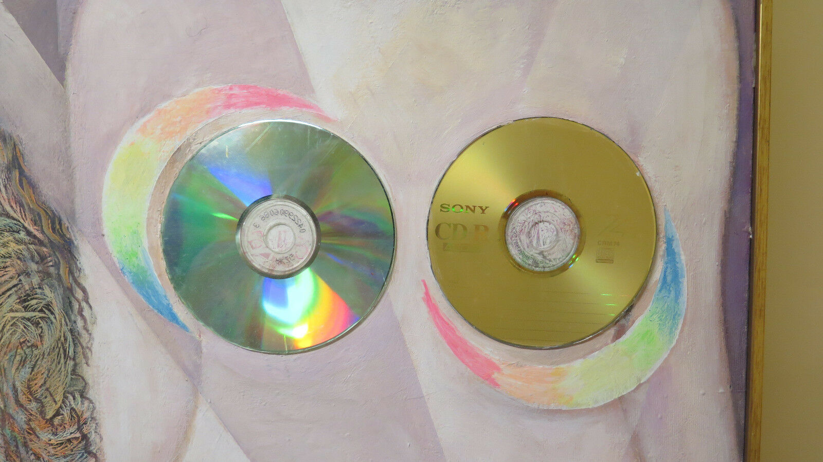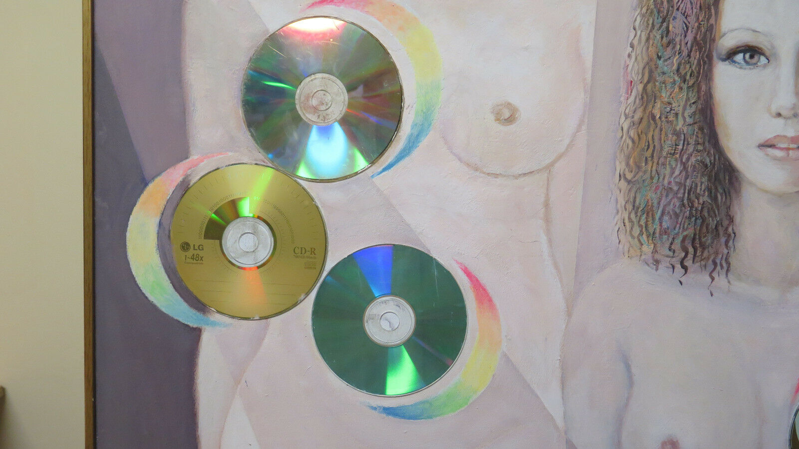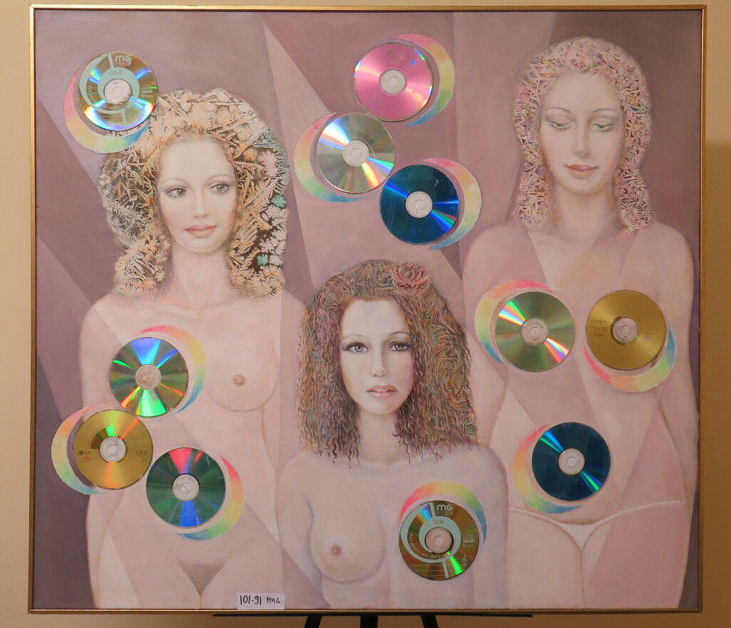 Soggetto: nudi femminili di gusto classico con compact disc applicati sulla superficie pittorica.
