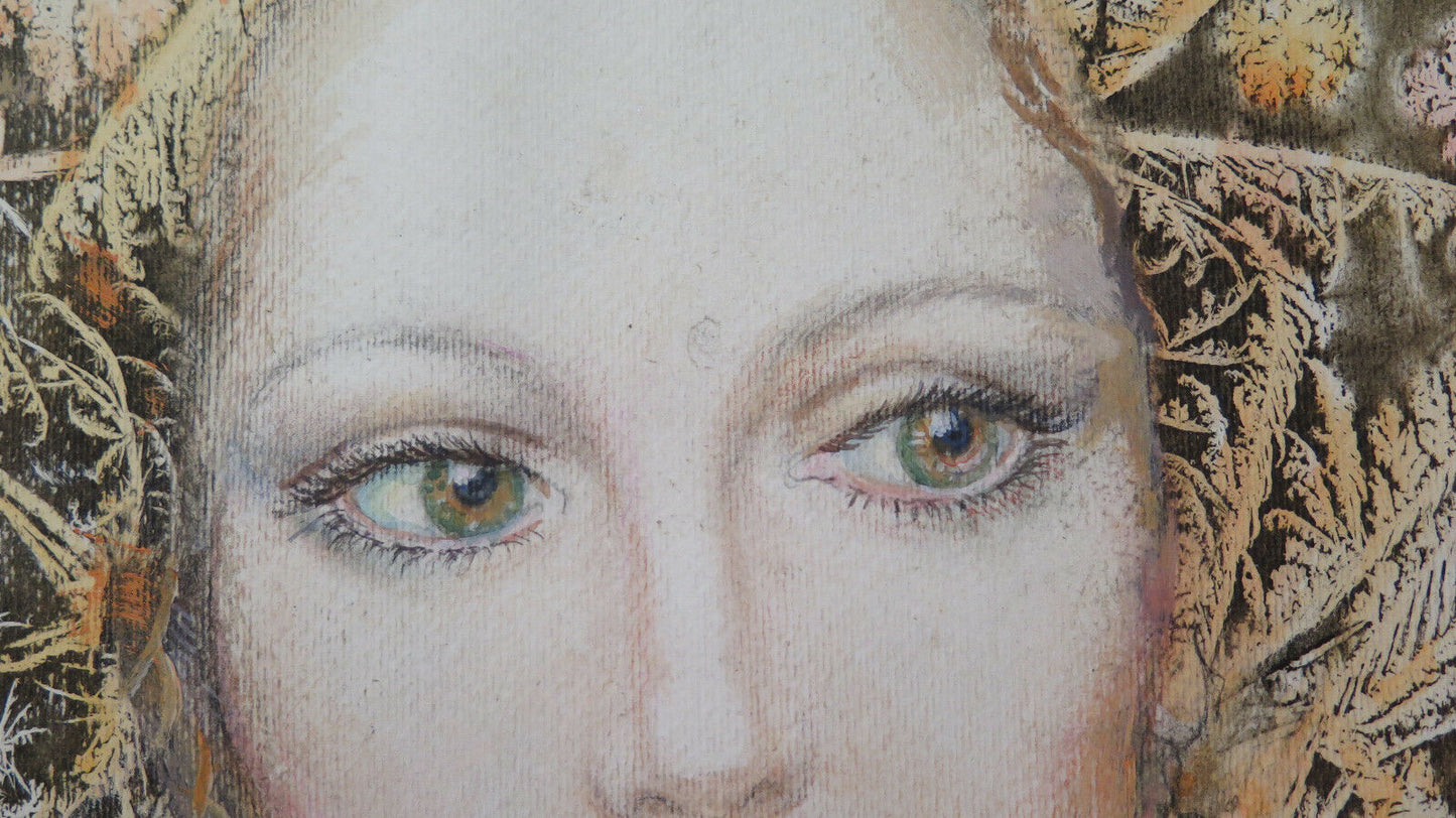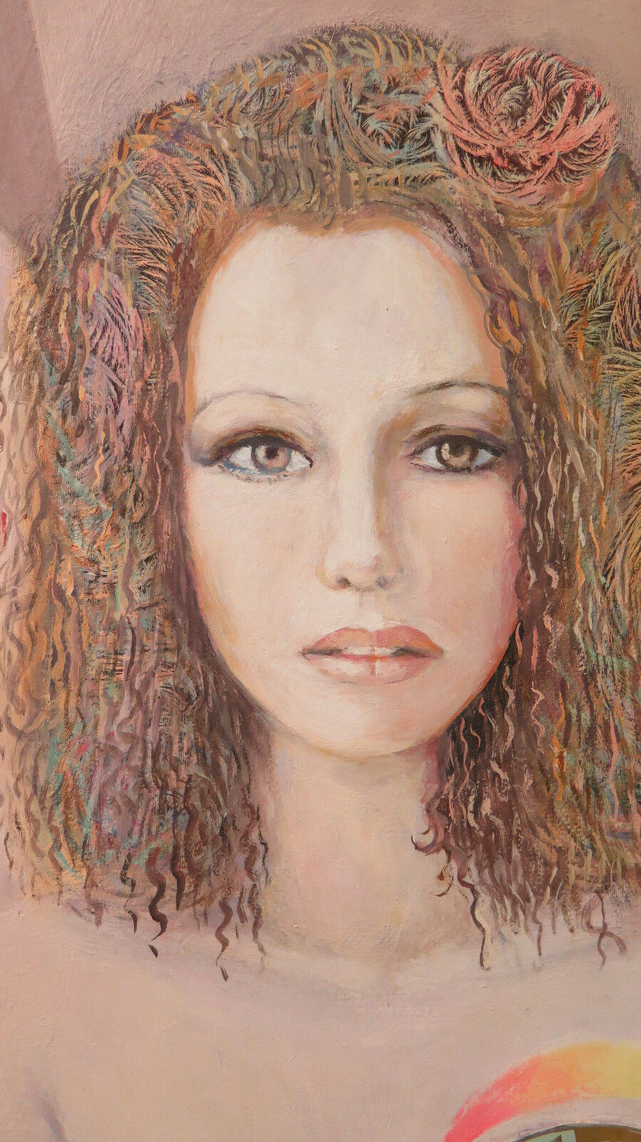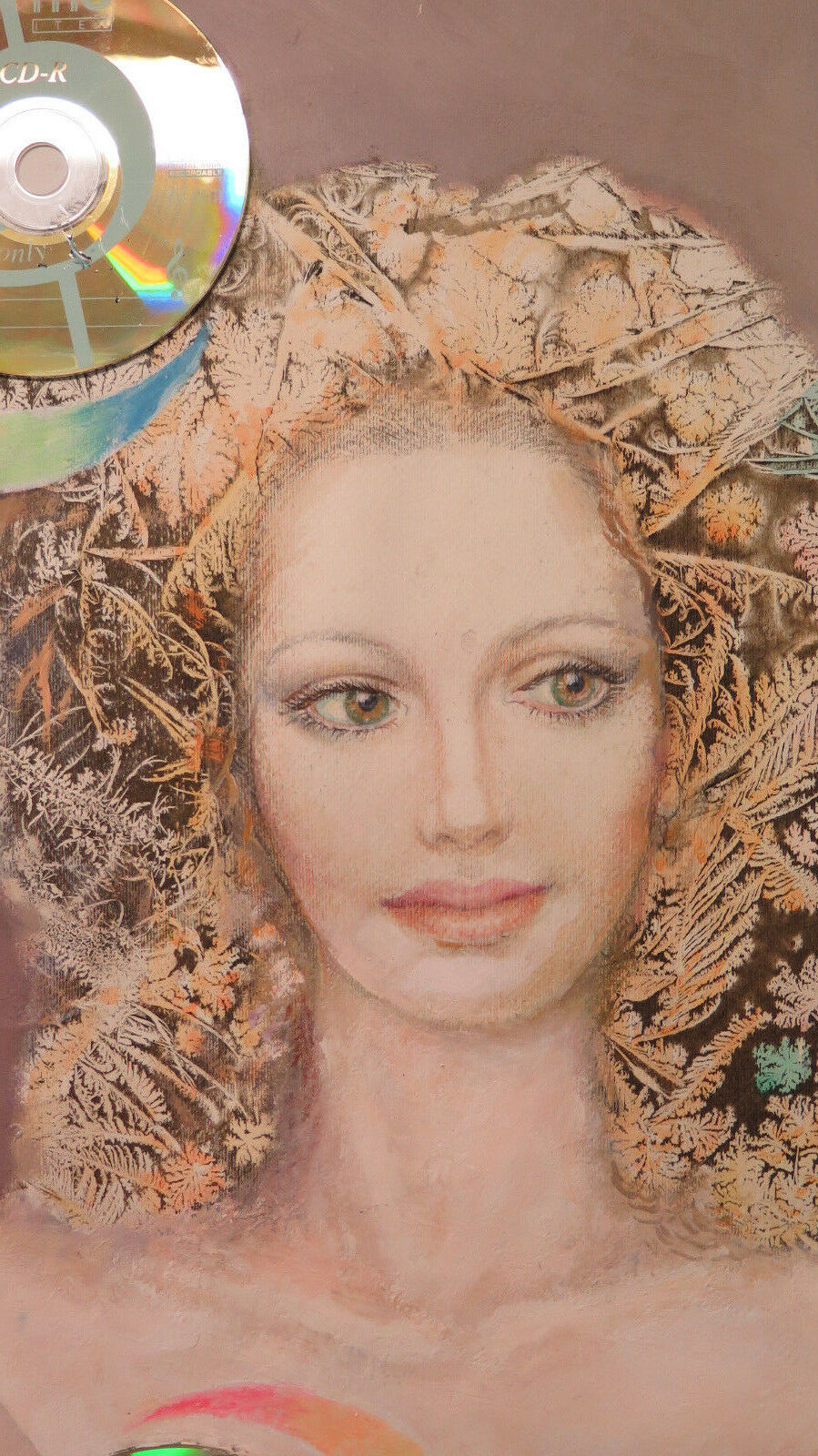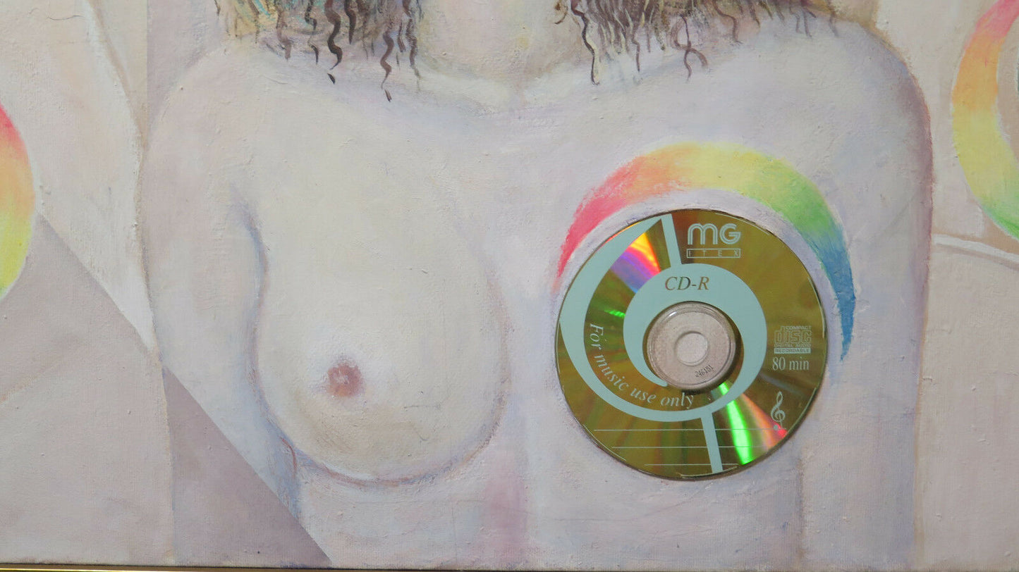 Soggetto: nudi femminili di gusto classico con compact disc applicati sulla superficie pittorica.