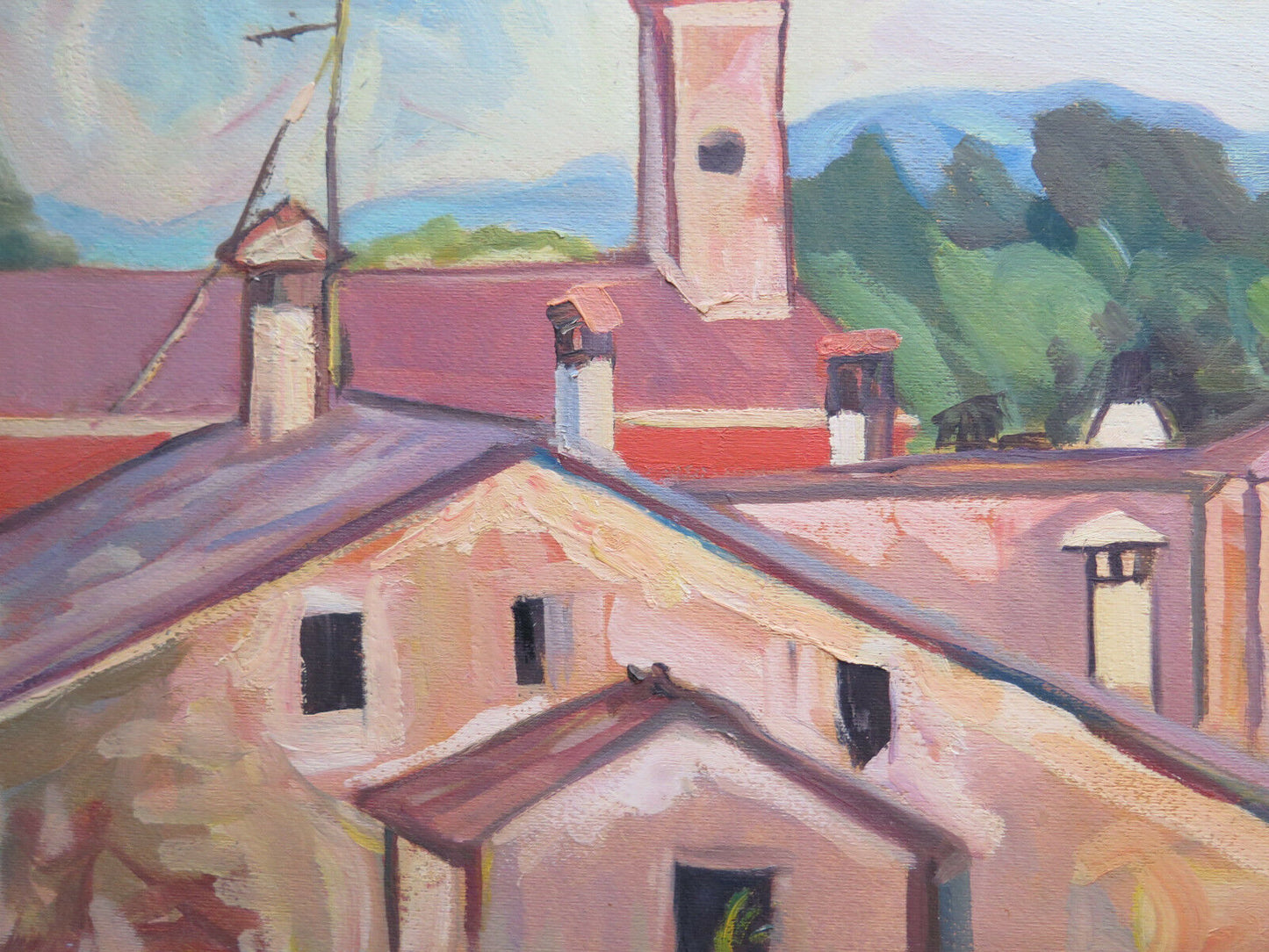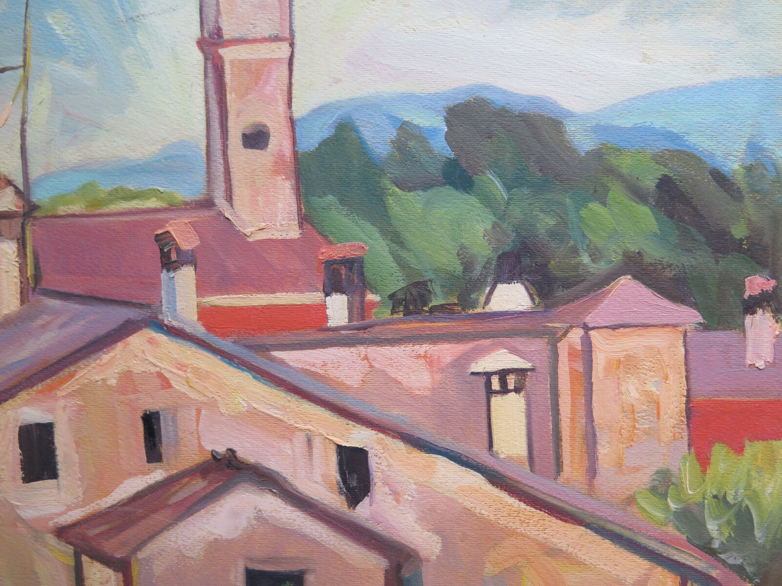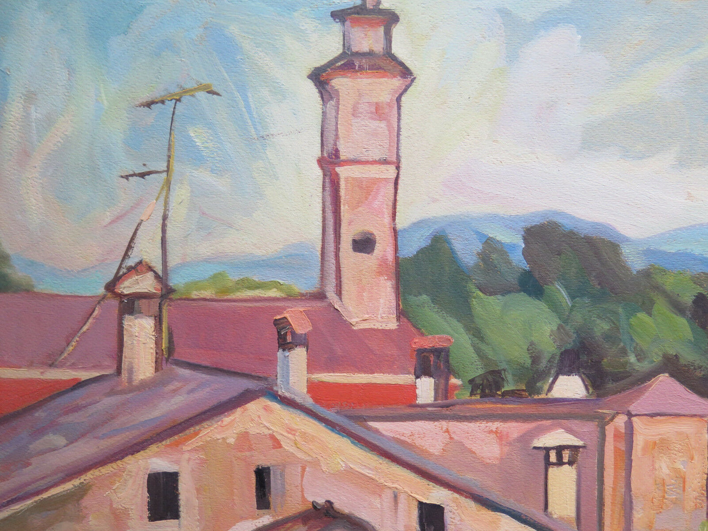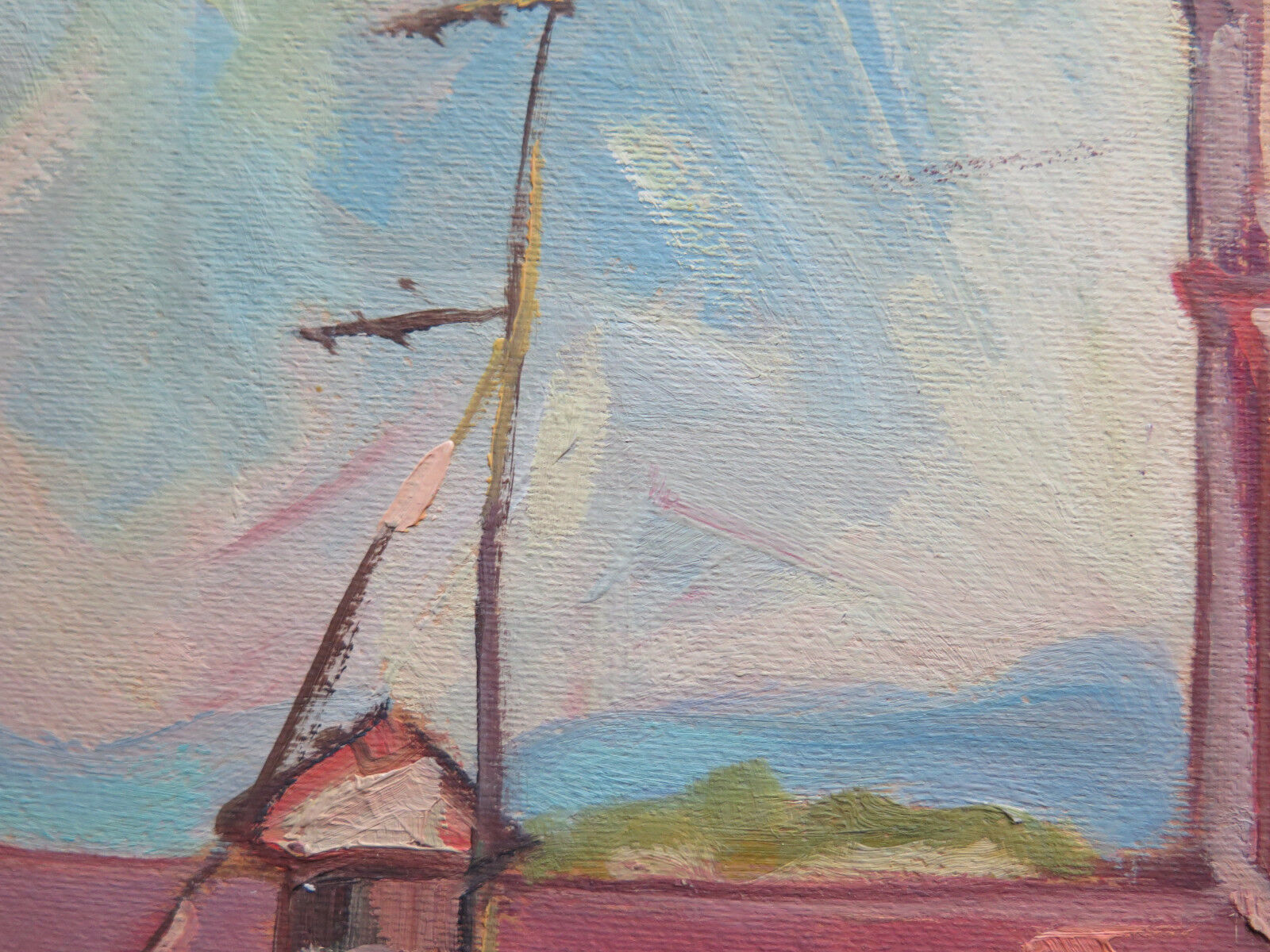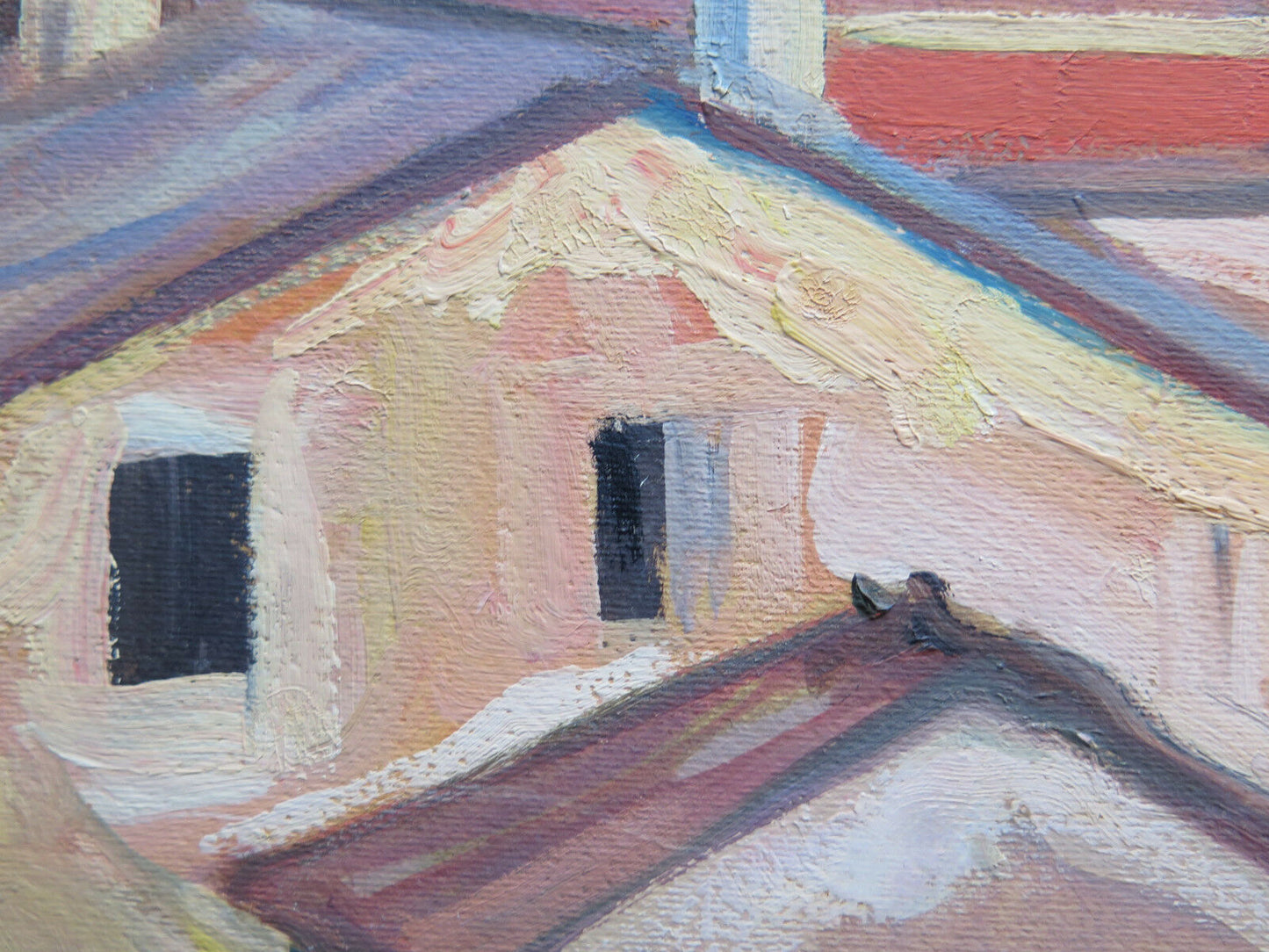 Particolare dipinto ad olio su tavola realizzato dal pittore modenese Gaetano Pancaldi (1922-2014), veduta del paese di Piumazzo in estate.
