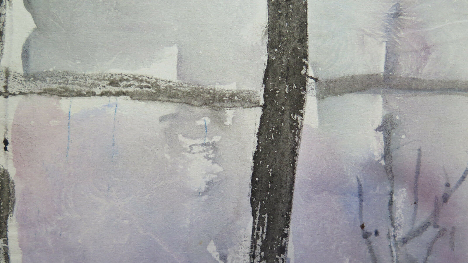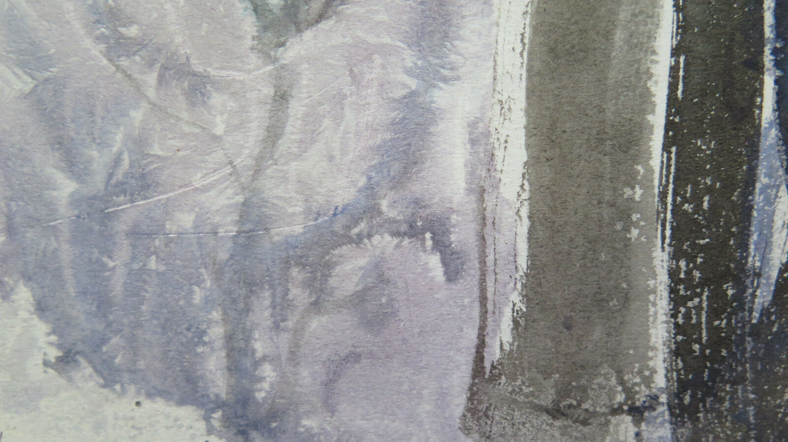 Particolare dipinto ad acquerello su cartoncino eseguito dal pittore Gaetano Pancaldi (1922-1014) di Piumazzo di Castelfranco Emilia, il lavoro in questione è un cupo paesaggio invernale dalla finestra con lo spettatore visto di spalle.