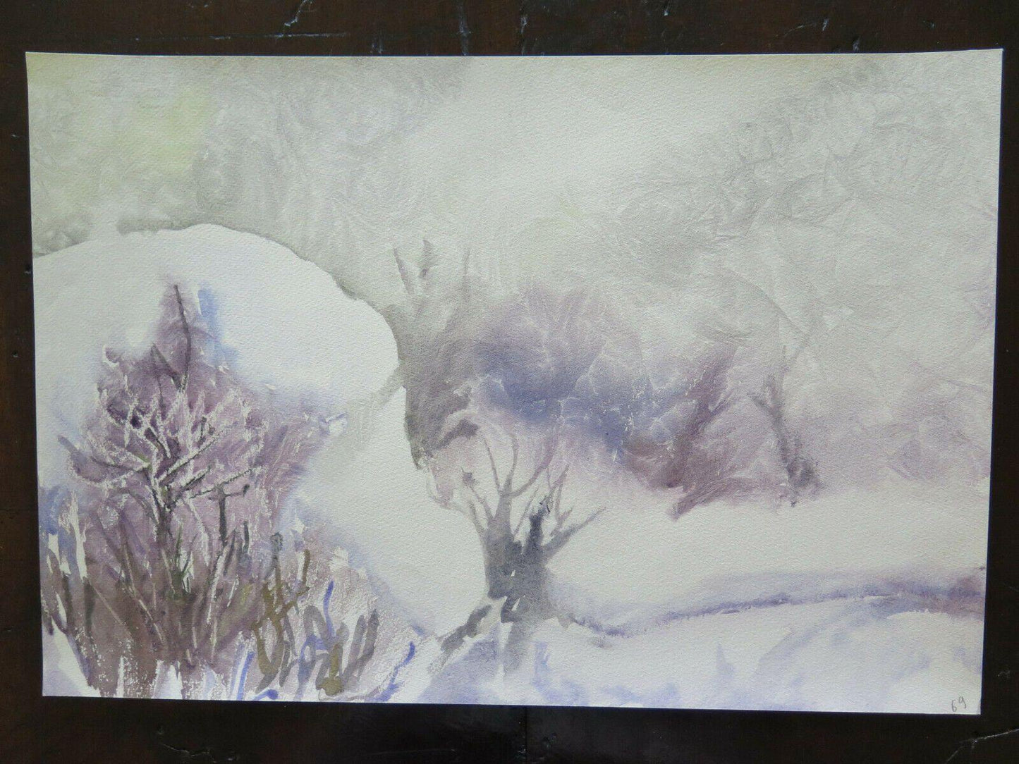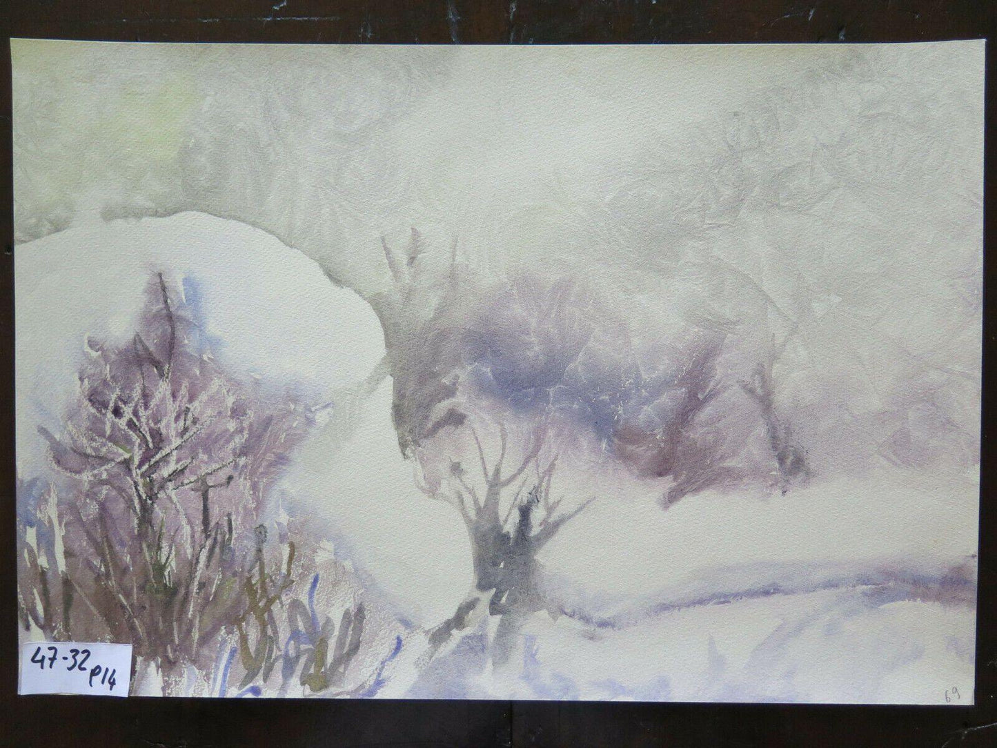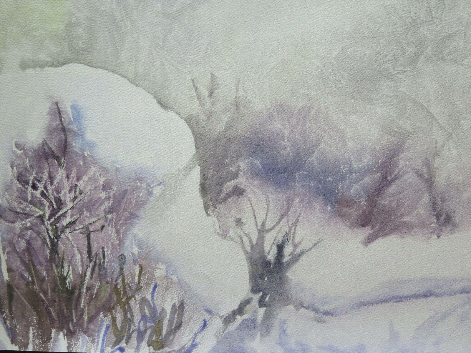 Supporto e tecnica: acquerello su cartoncino. Realizzato con la "tecnica del gelo" per ottenere l'effetto ghiaccio in alcuni aree della superficie pittorica, tale tecnica consisteva nel porre al freddo vero e proprio il dipinto ancora fresco per poi lavorarlo successivamente. Questo effetto è stato creato dal pittore Pancaldi e ricorre in molti suoi lavori soprattutto nella fase della maturità . Autore: Gaetano Pancaldi (Piumazzo di Castelfranco Emilia, 1922-2014).