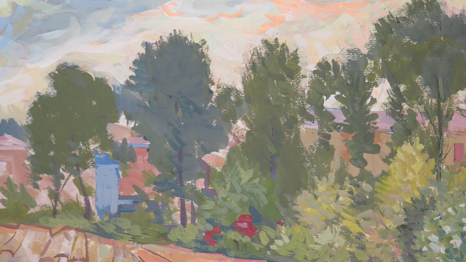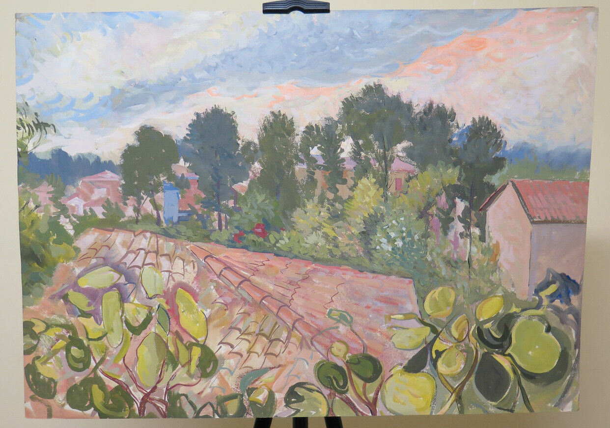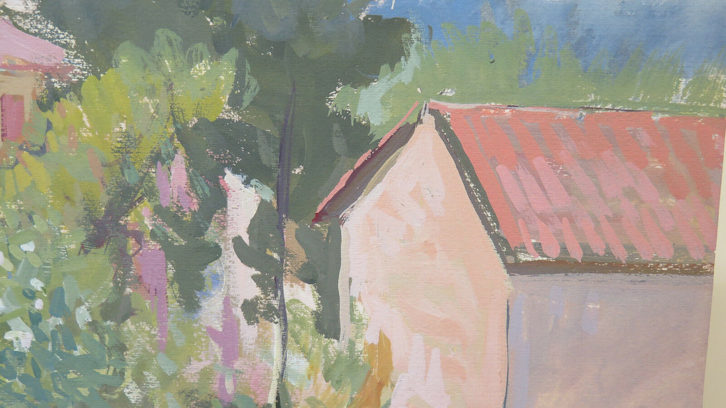 QUADRO VINTAGE DIPINTO OLIO VEDUTA DEI TETTI DI PIUMAZZO IN PROVINCIA MODENA P31