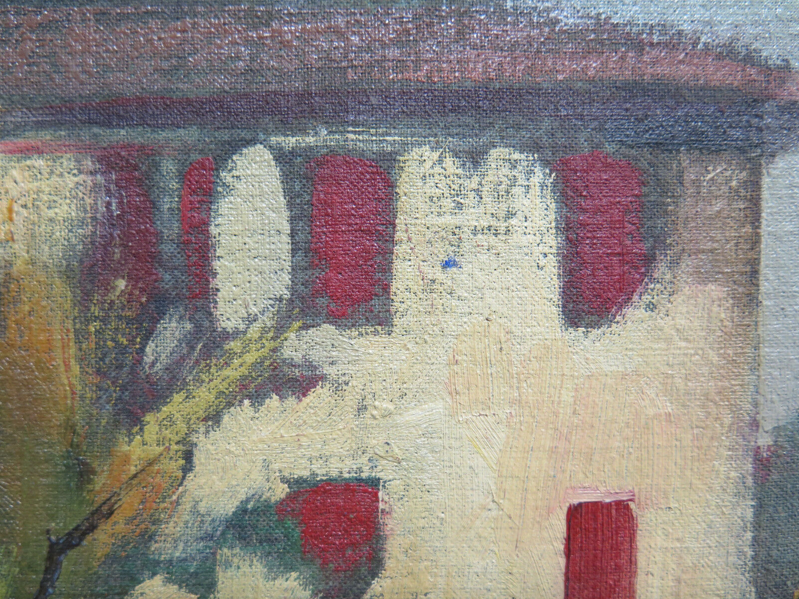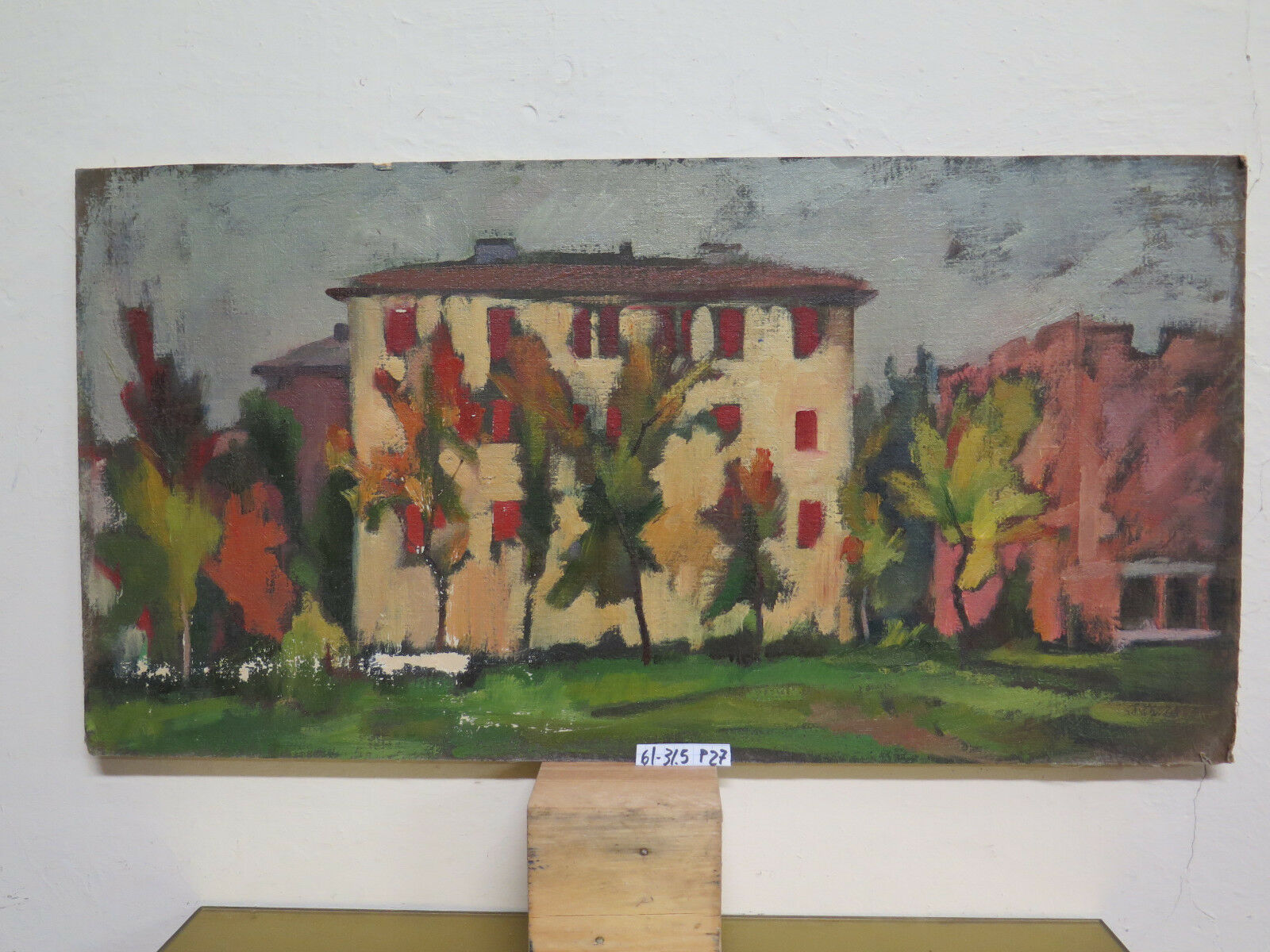 Soggetto: antico dipinto ad olio su tavola opera del Maestro Gaetano Pancaldi (1922-2014) in cui viene raffigurato un casale della campagna emiliana tanto cara al pittore.