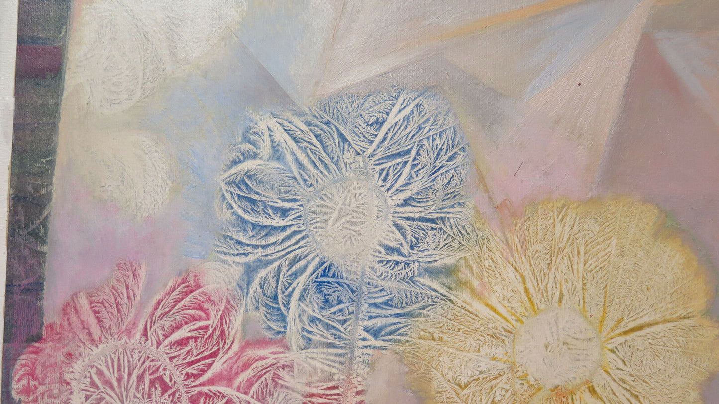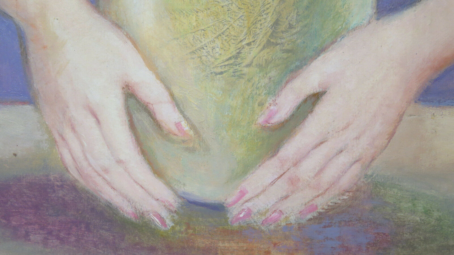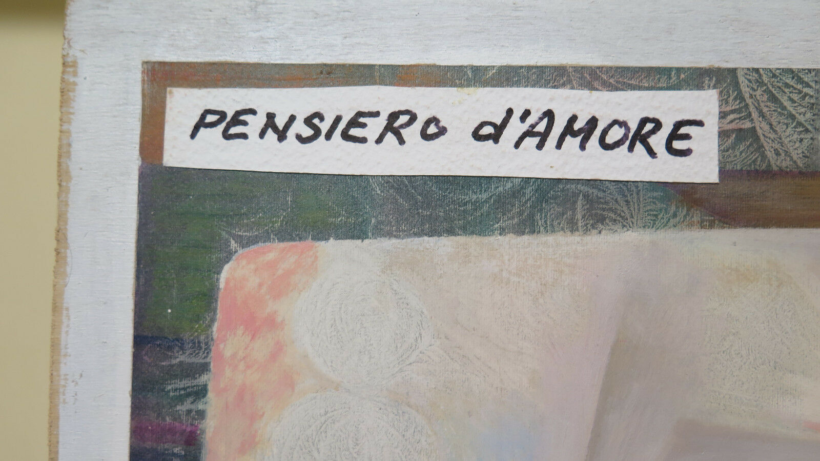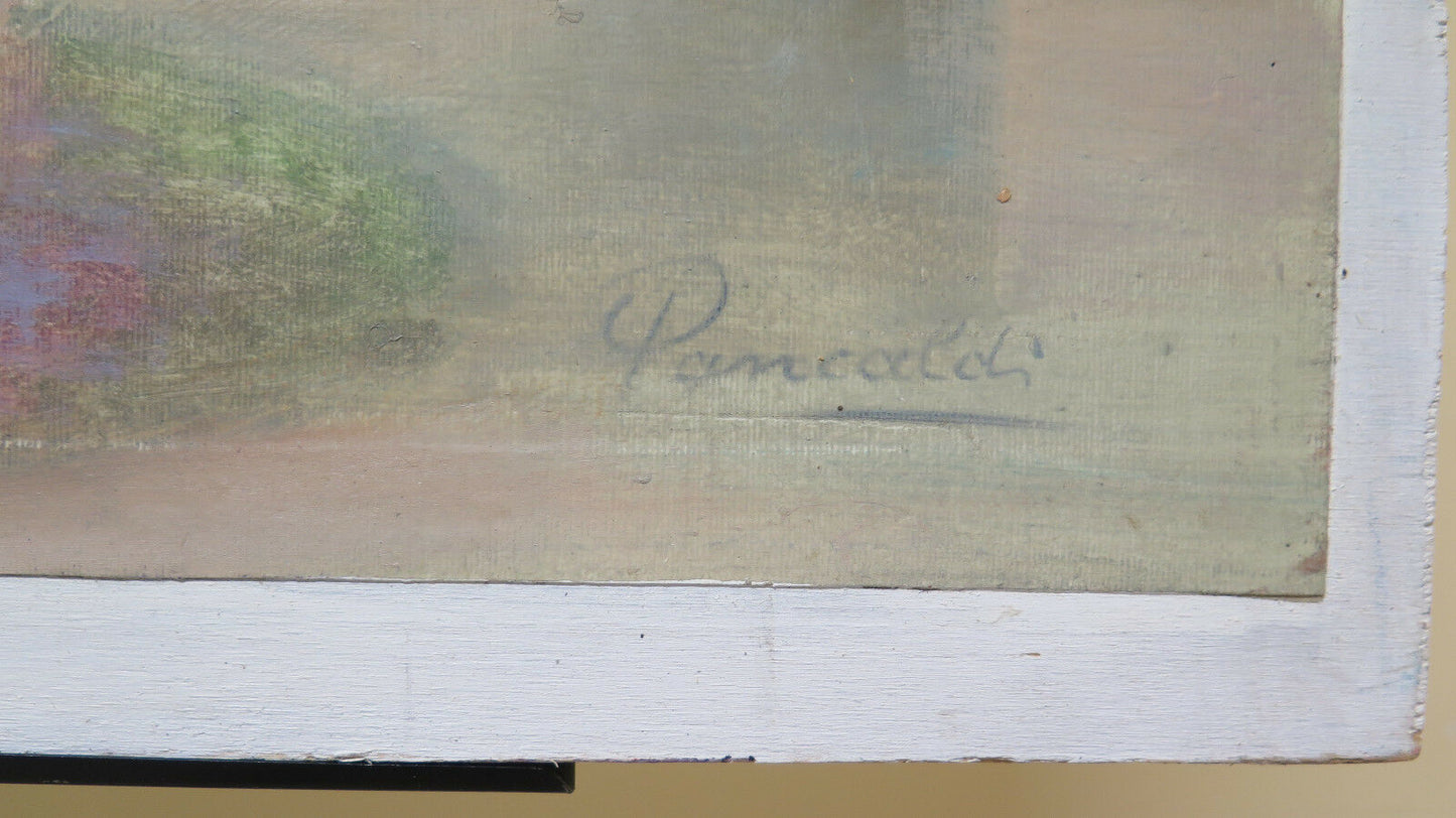 Particolare dipinto ad acquerello tavola opera del Maestro Gaetano Pancaldi di Piumazzo di Castelfranco Emilia (1922-2014) che ritrae una fanciulla circondata da mazzi di fiori.