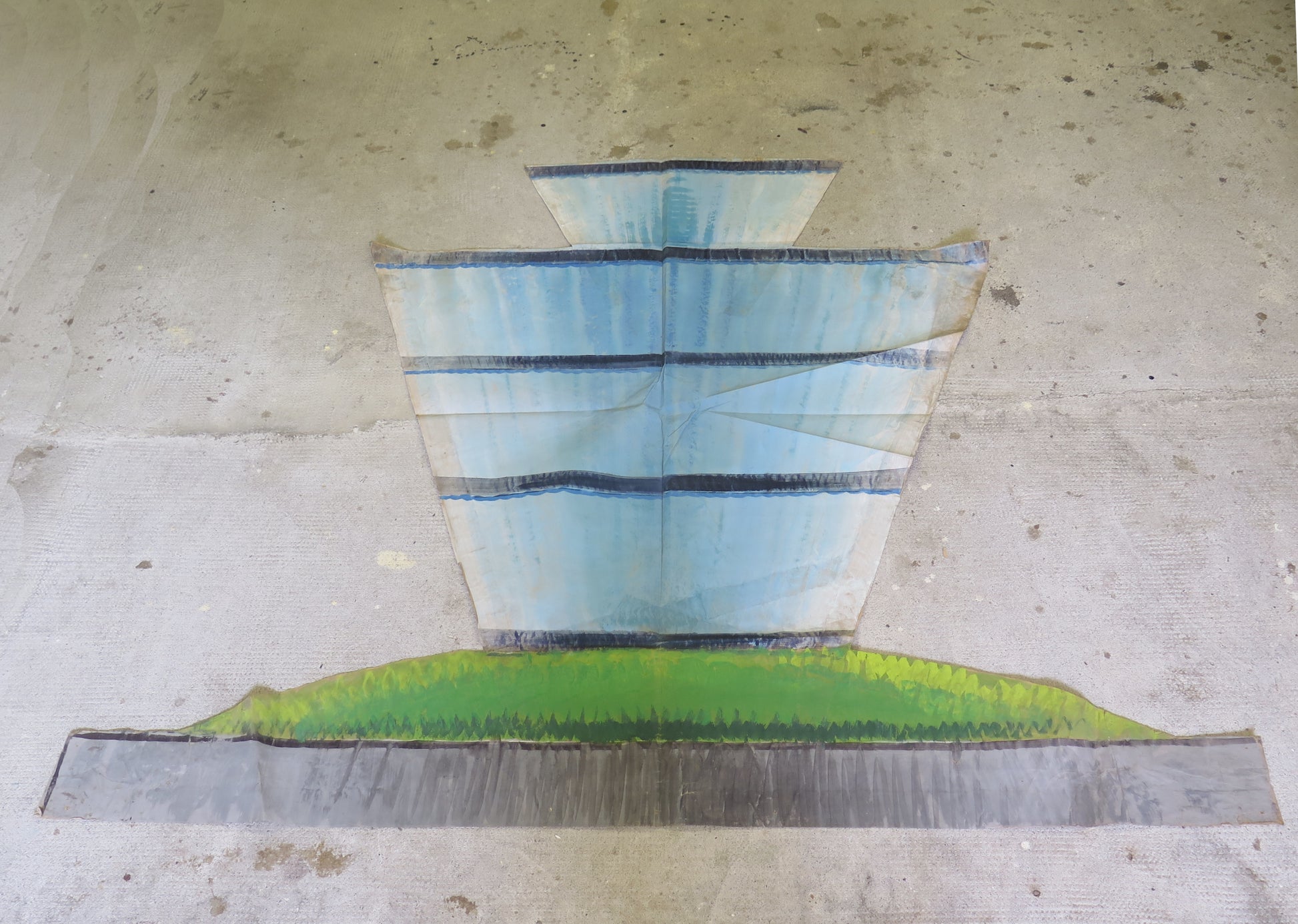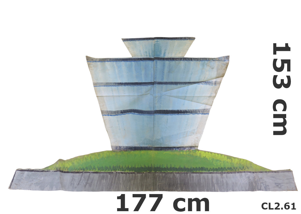 Fondale da teatro in carta dipinta a mano che raffigura un monumento immaginario usato per lo spettacolo "Un torinese a Torino", come indicato al retro.