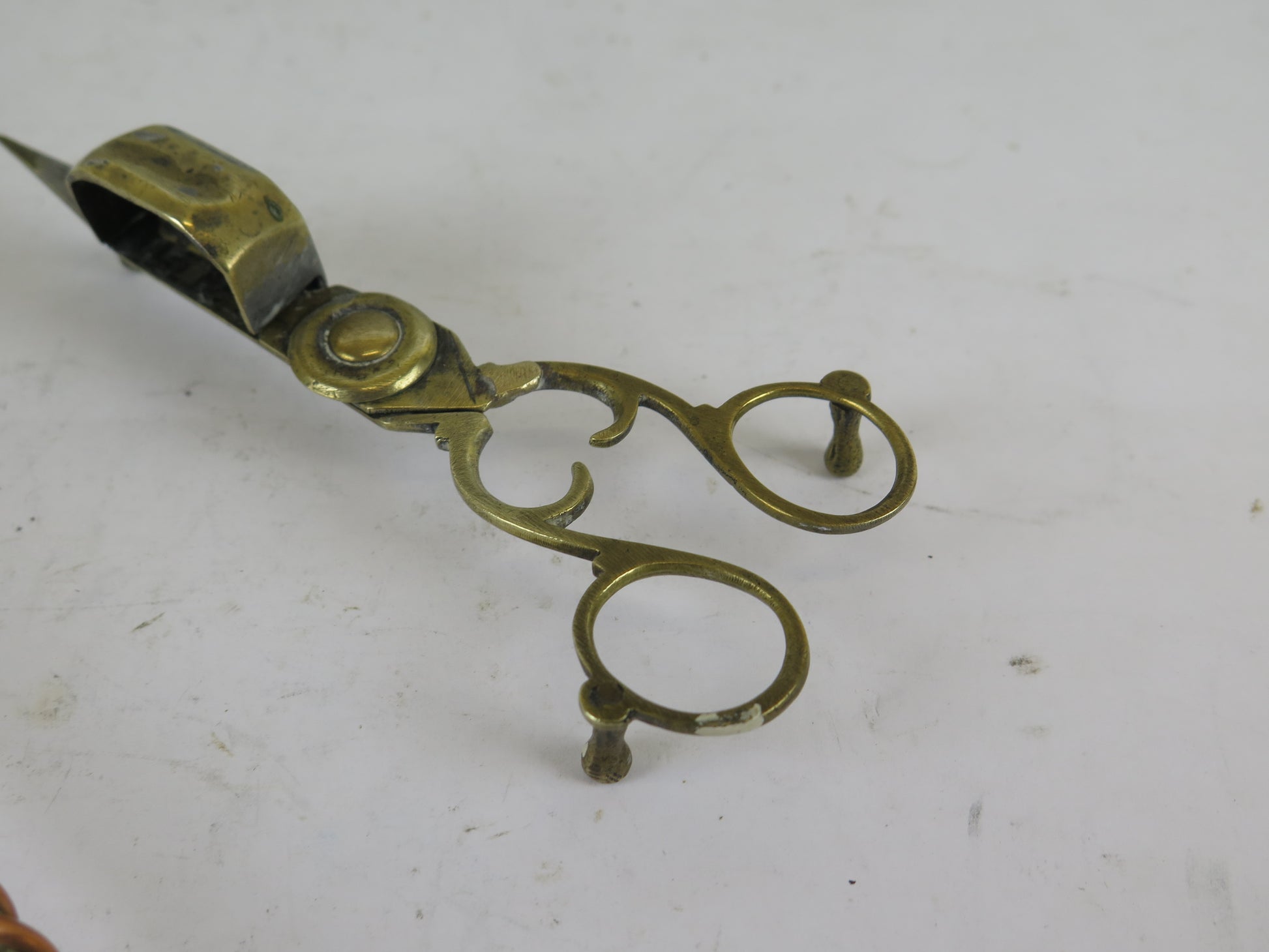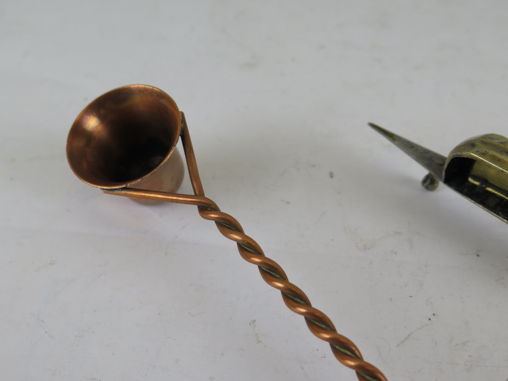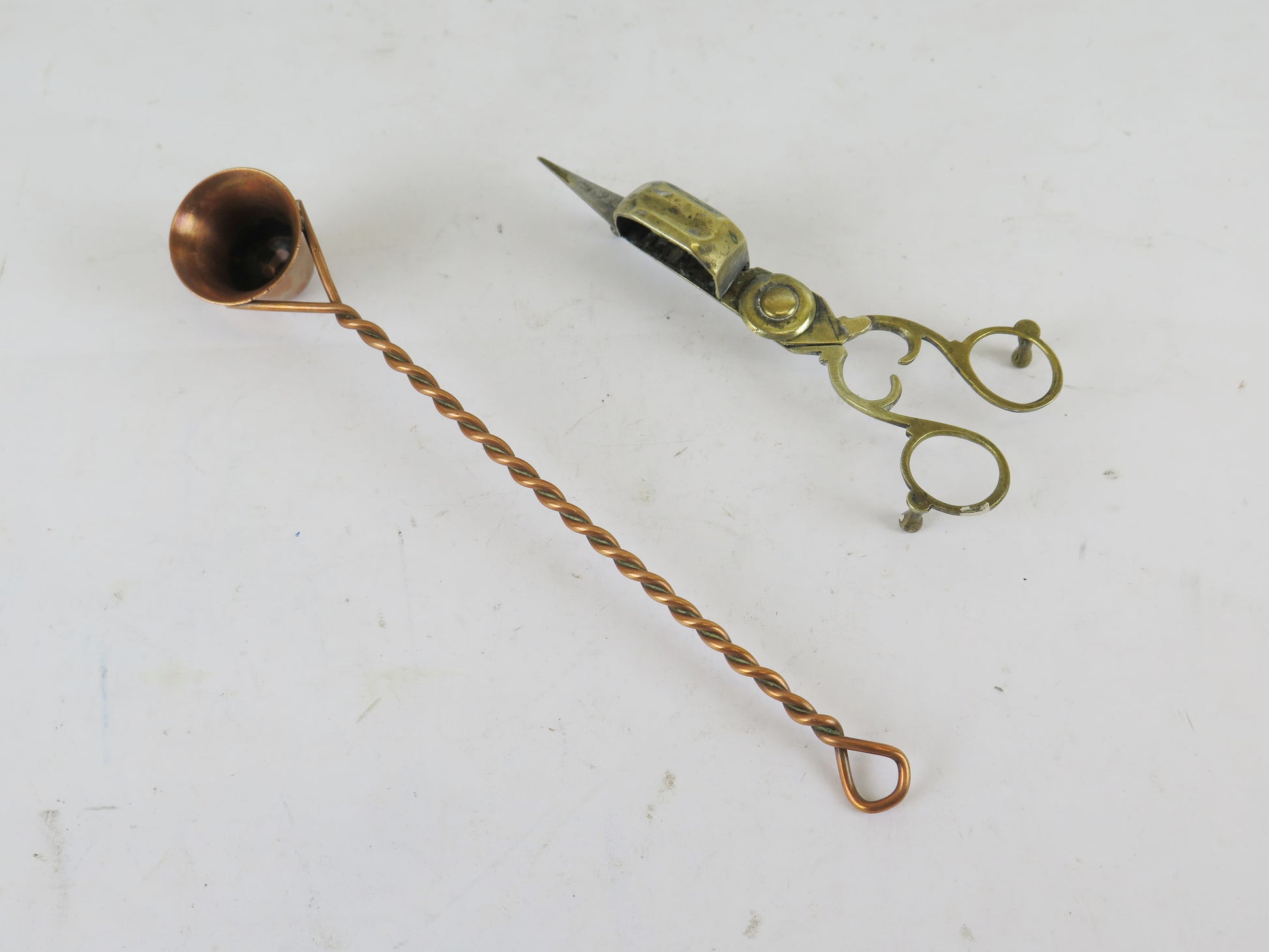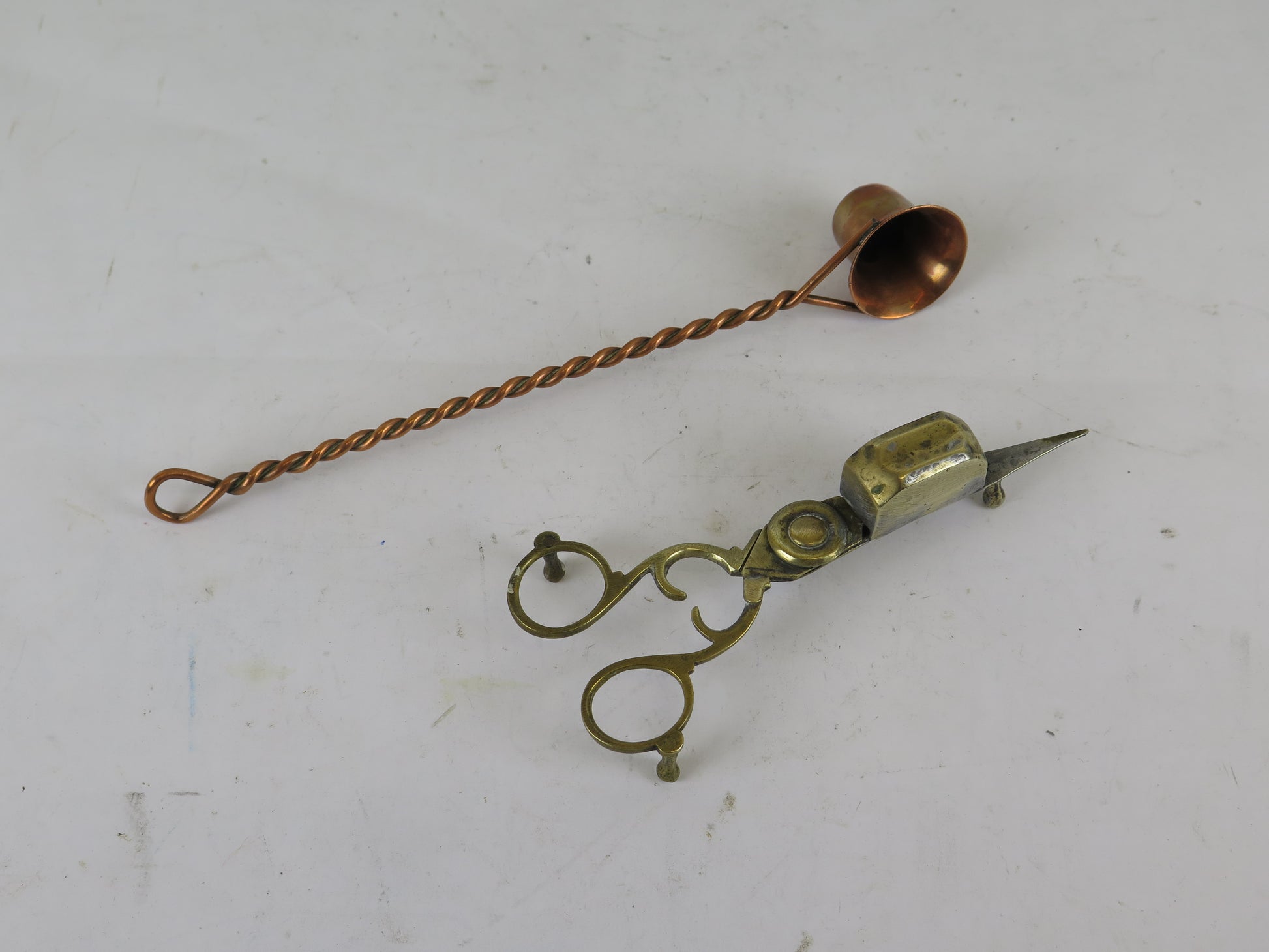 Due antichi spegni candela, uno in rame a testa fissa e l'altro a forbice in ottone.