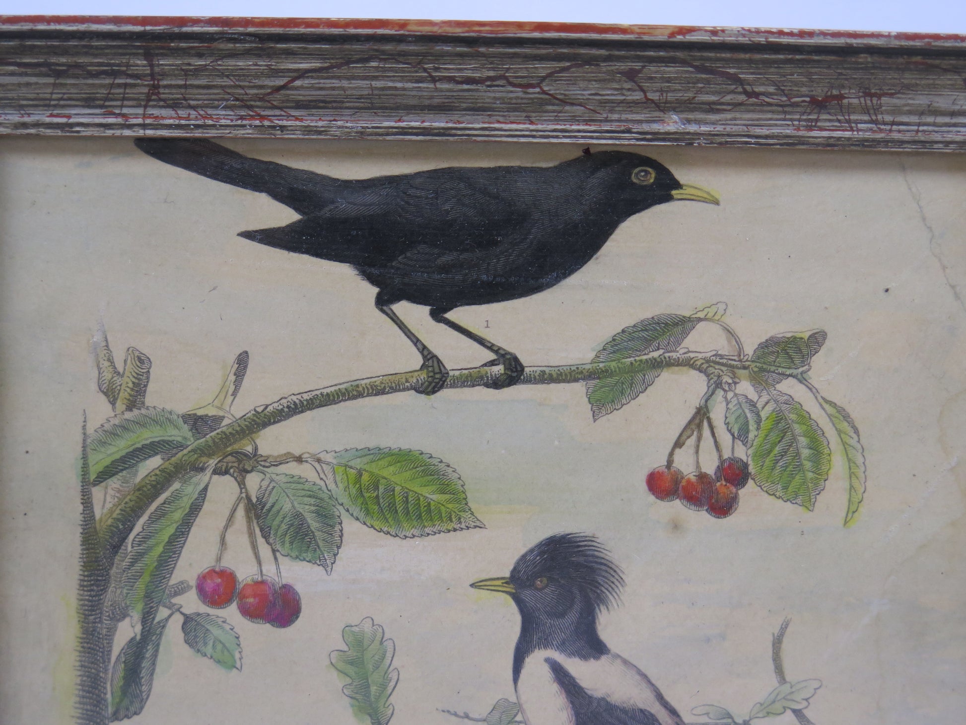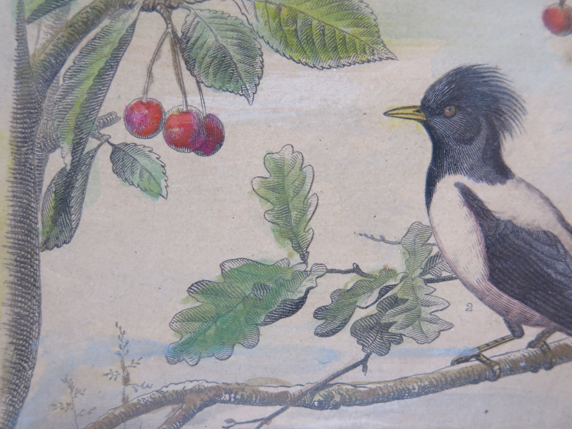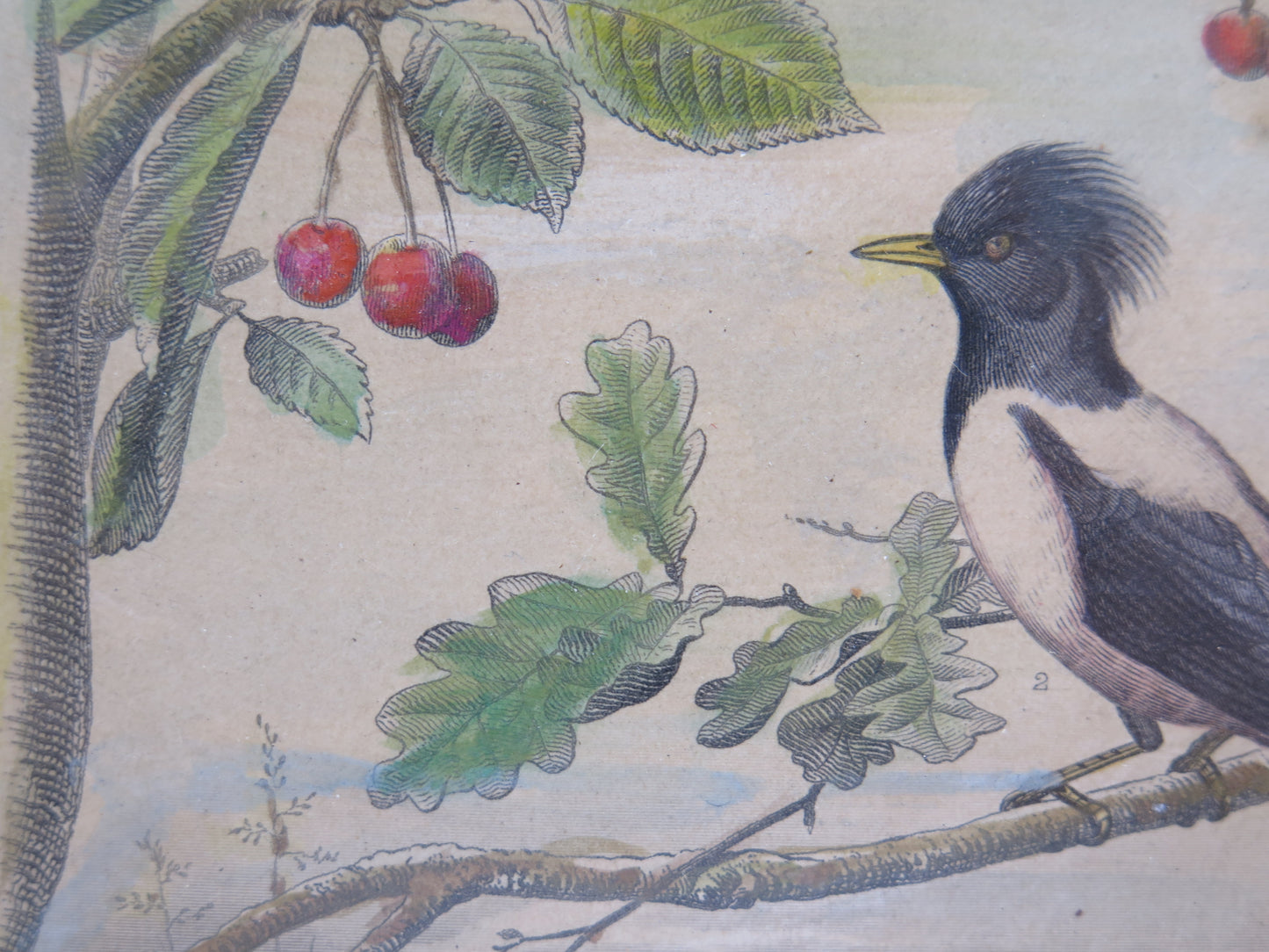 Stampa antica tema naturalistico uccelli animali merlo ciliegie incisione bt4