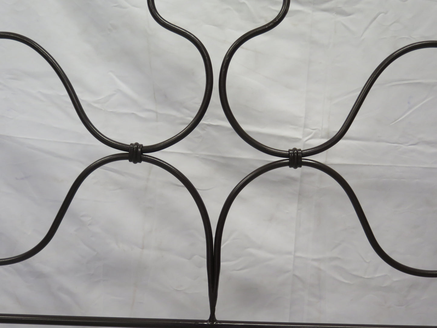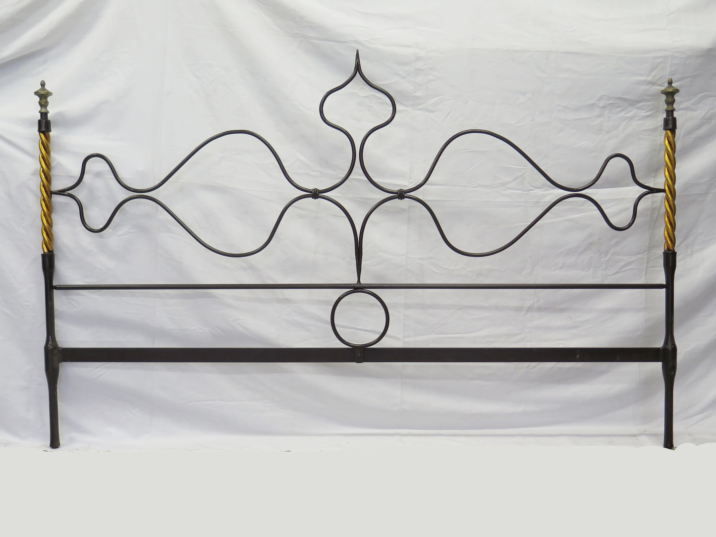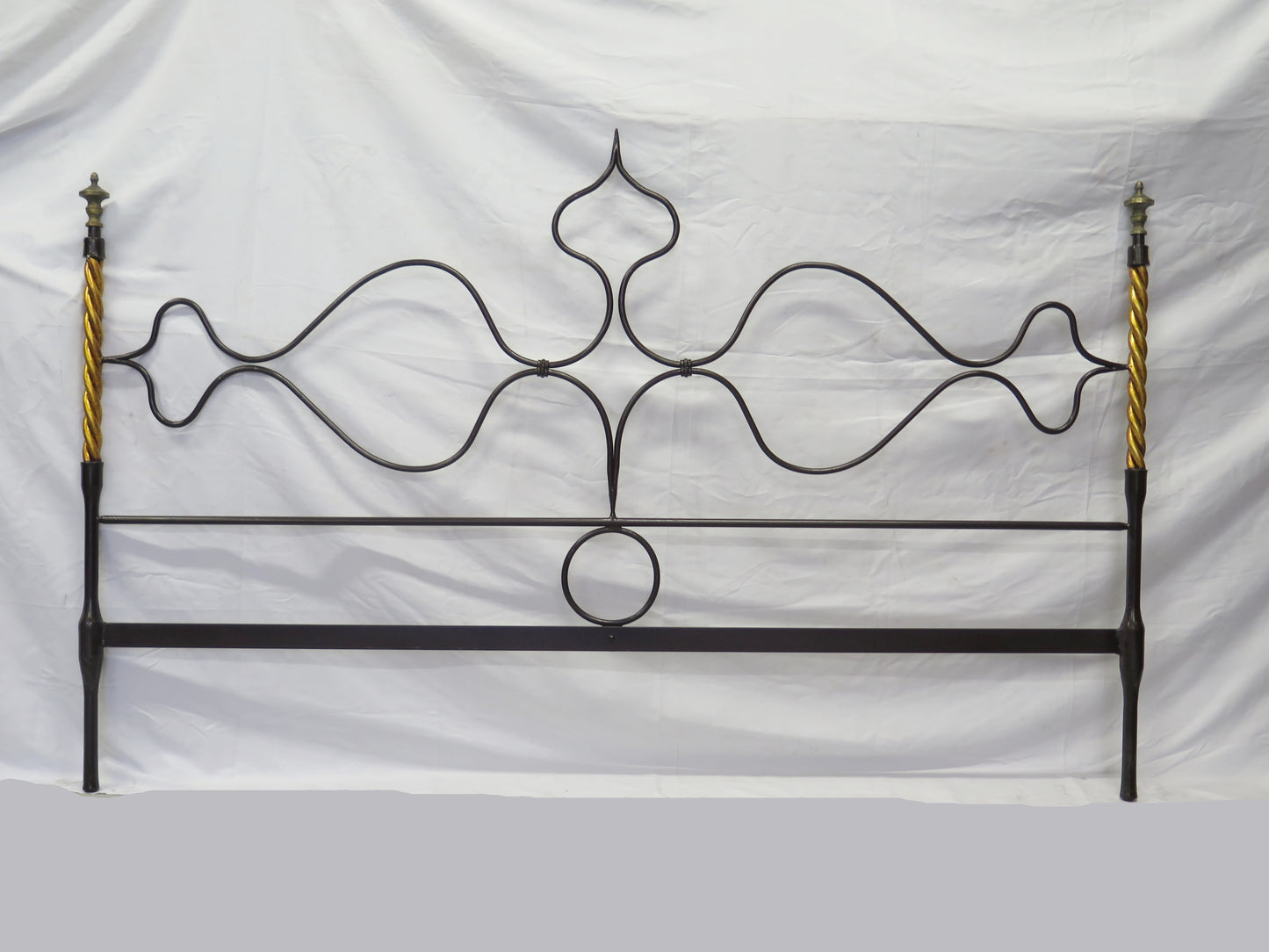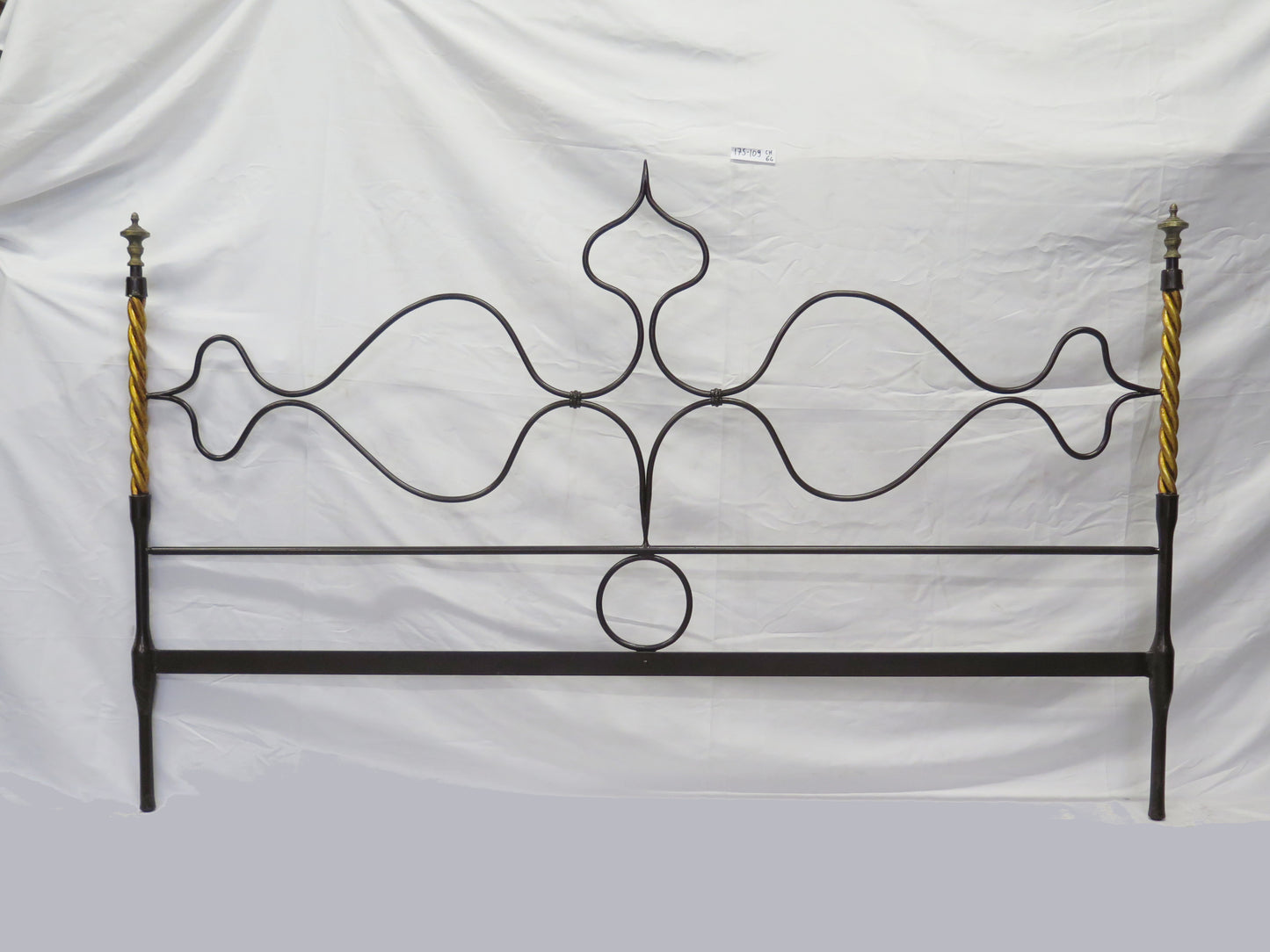 Testiera in ferro battuto forgiato a mano decorata con motivi a volute e colonne tortili.