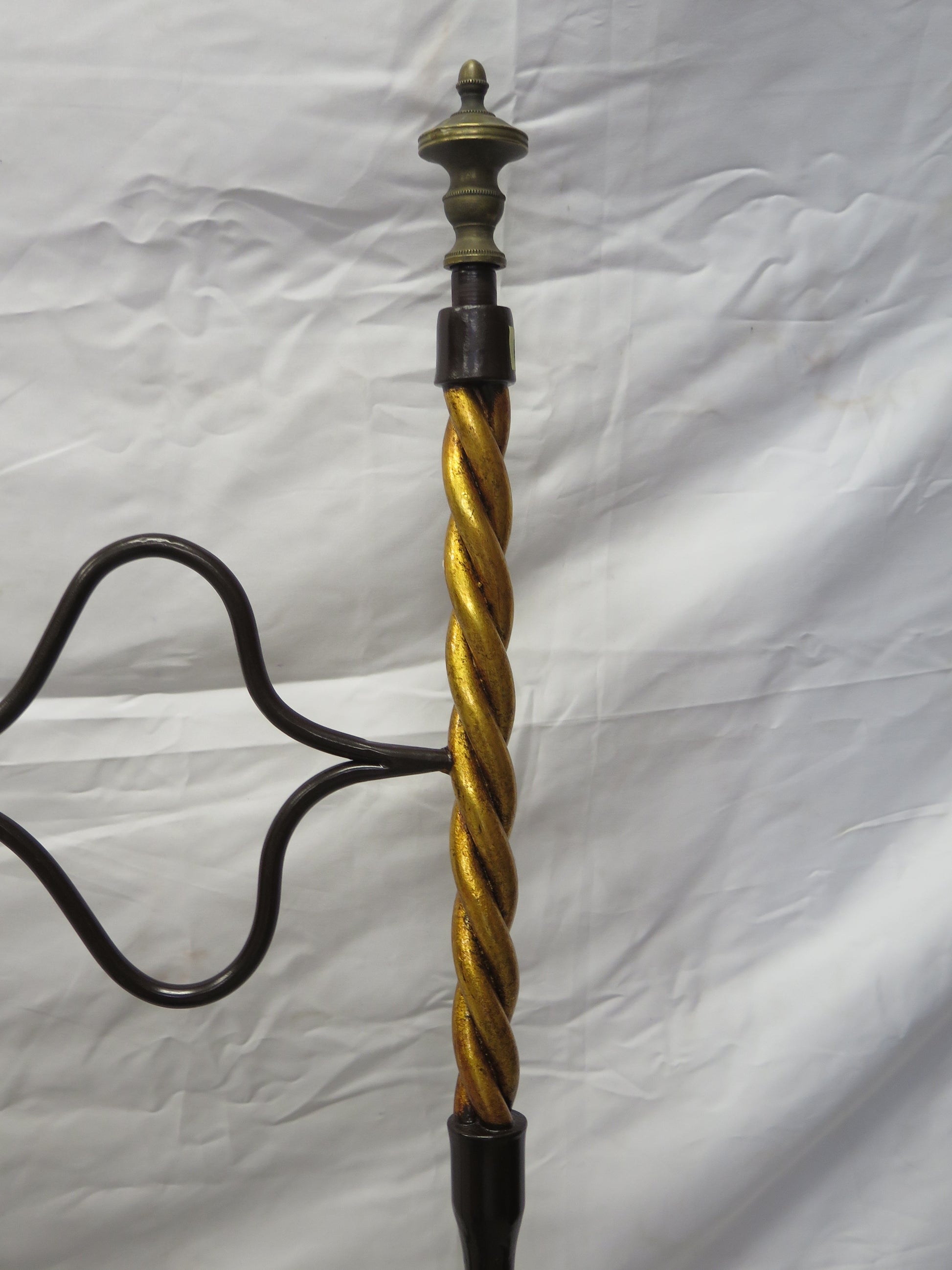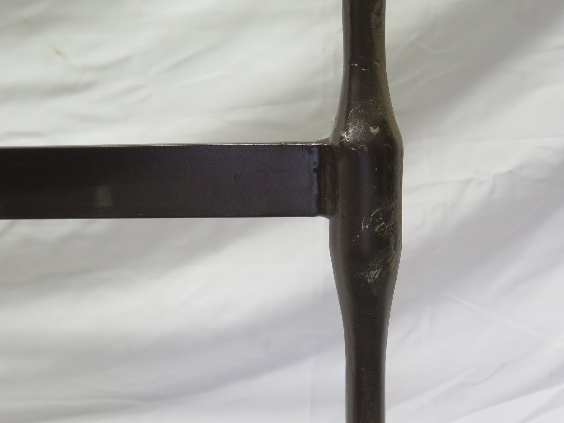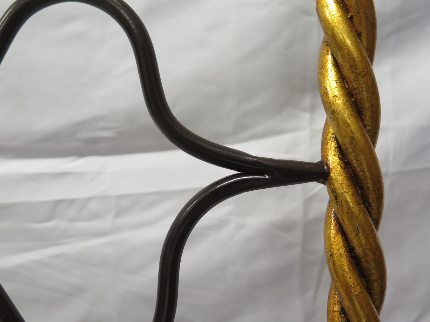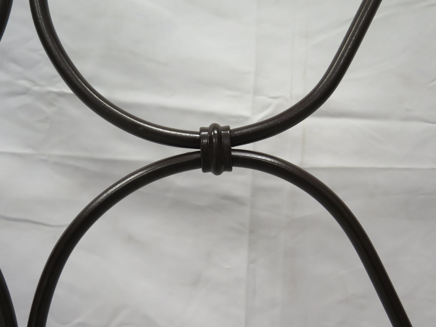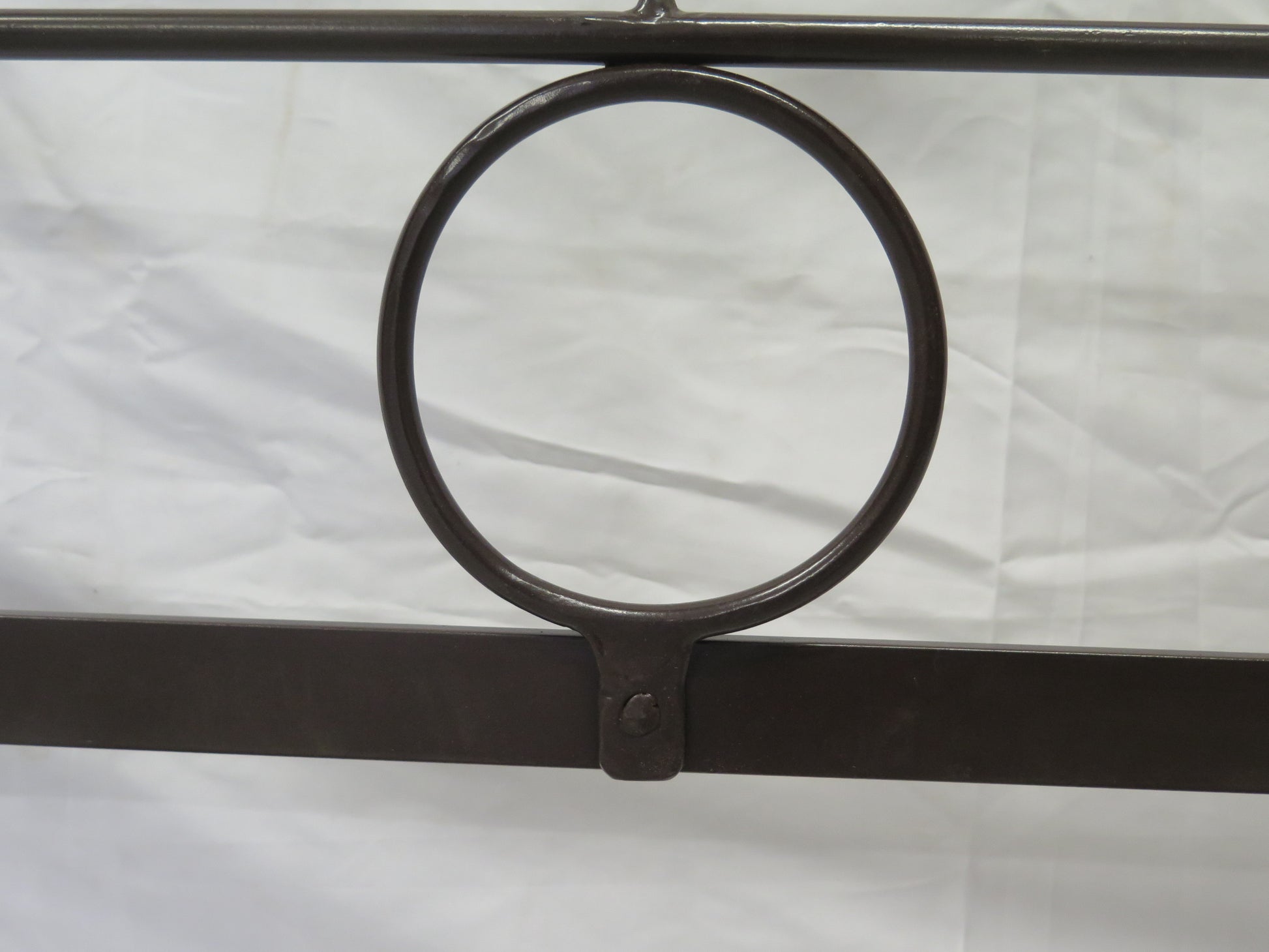 Testiera in ferro battuto forgiato a mano decorata con motivi a volute e colonne tortili.