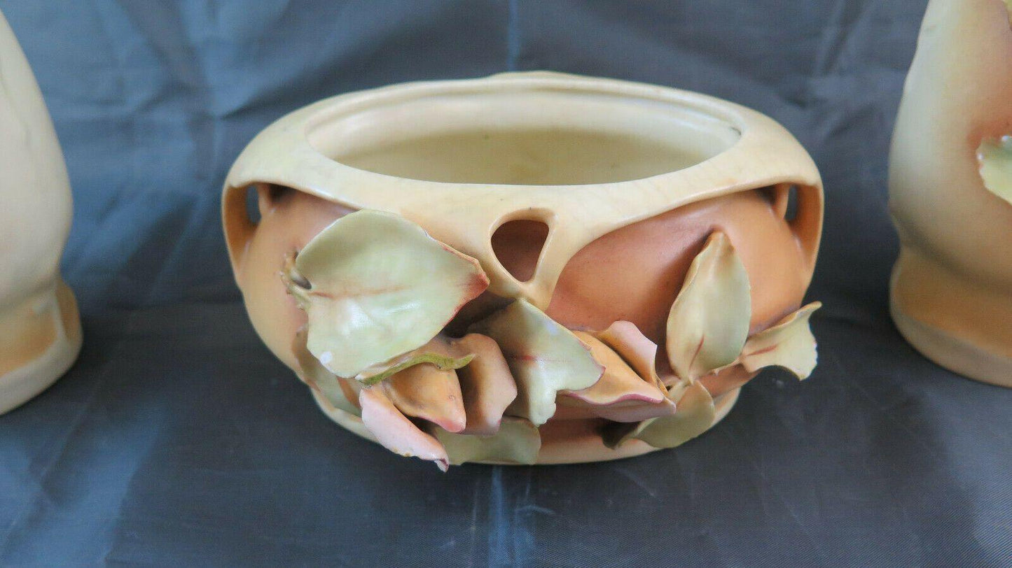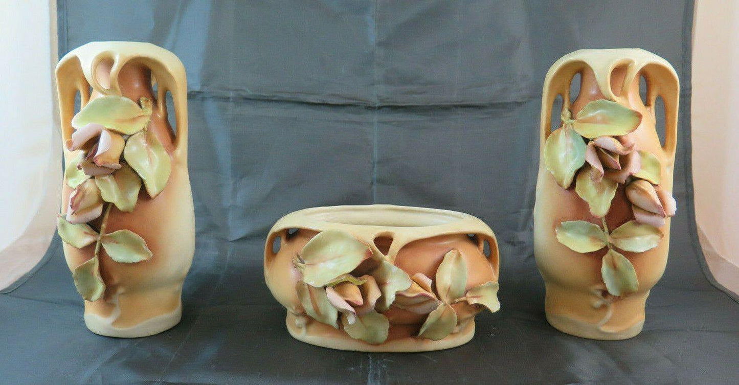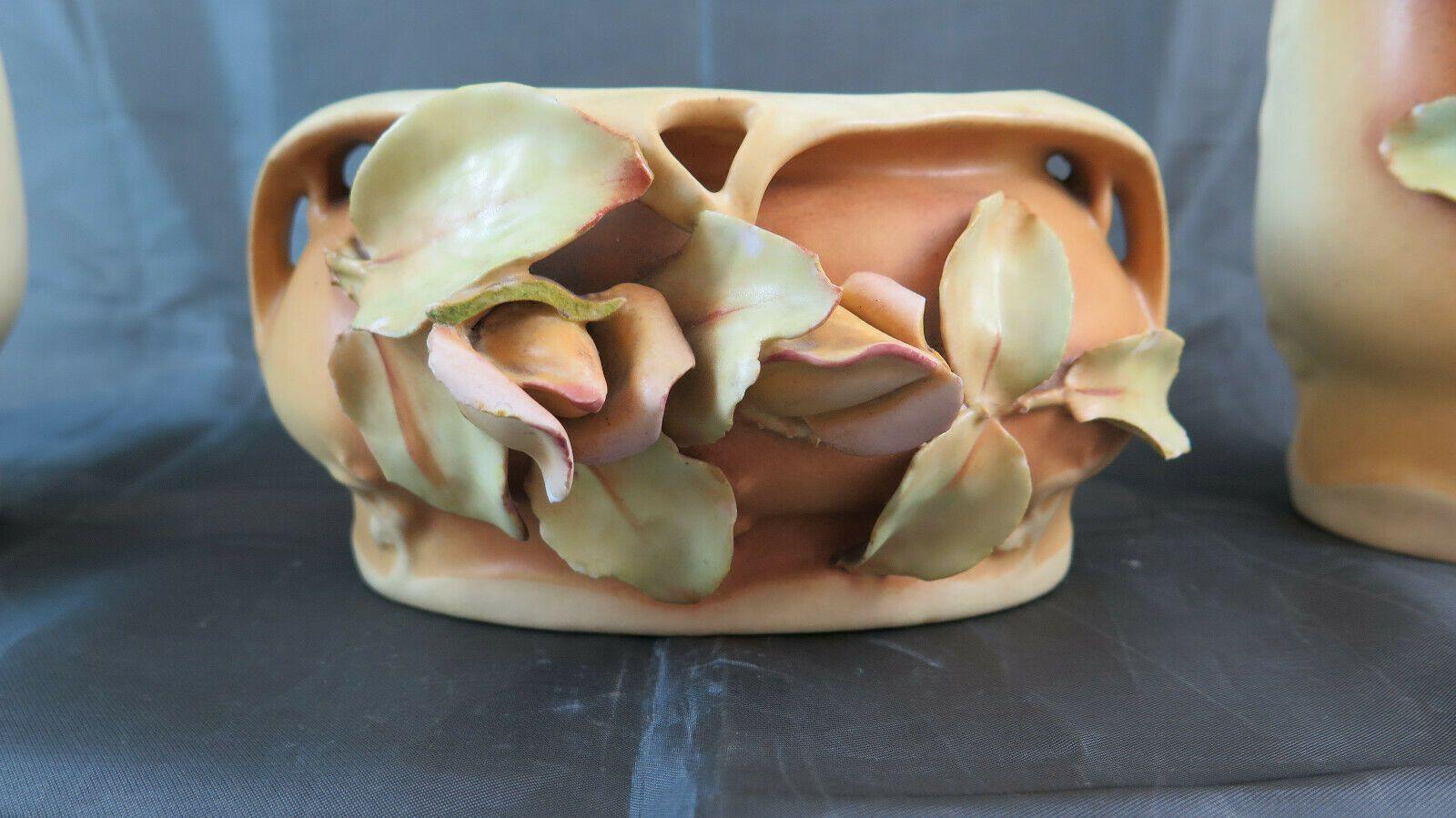 Antico trittico art nouveau composto da due vasi ed una coppa riccamente decorati con fiori in rilievo su base gialla opaca.