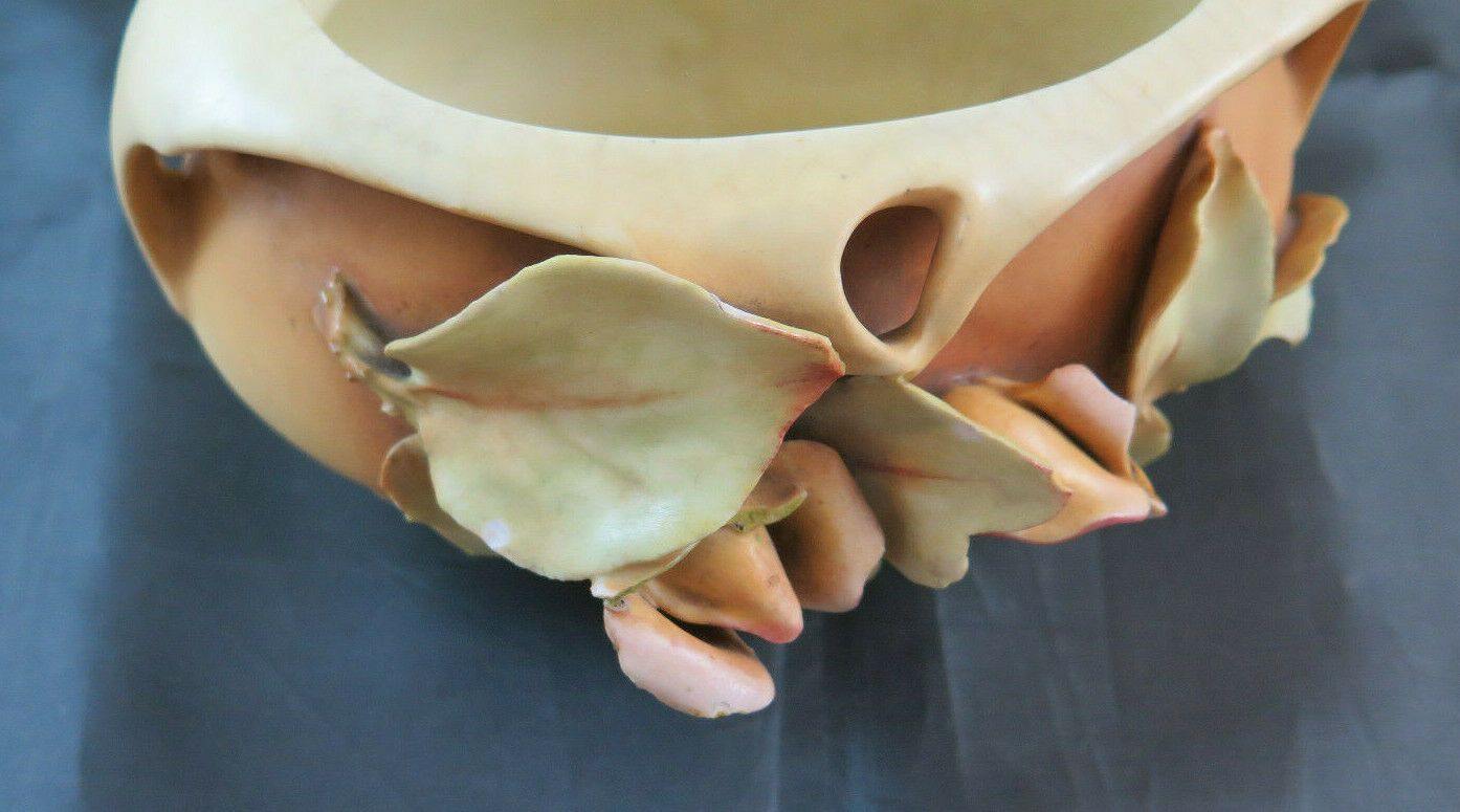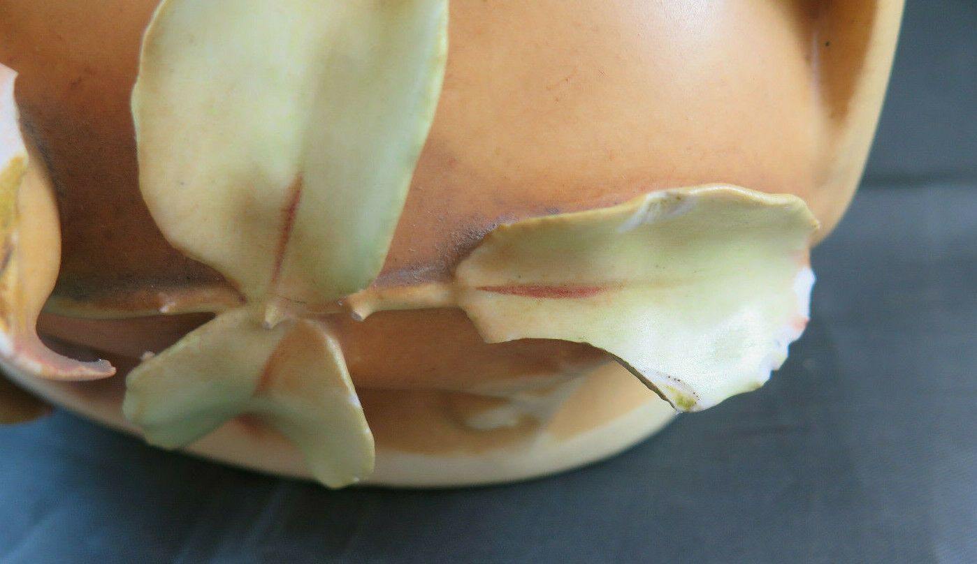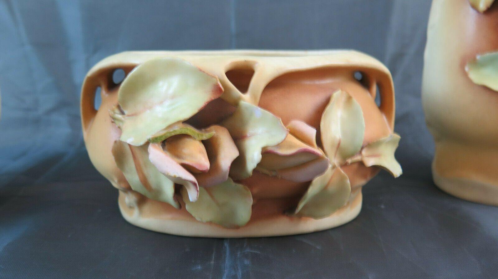 Antico trittico art nouveau composto da due vasi ed una coppa riccamente decorati con fiori in rilievo su base gialla opaca.