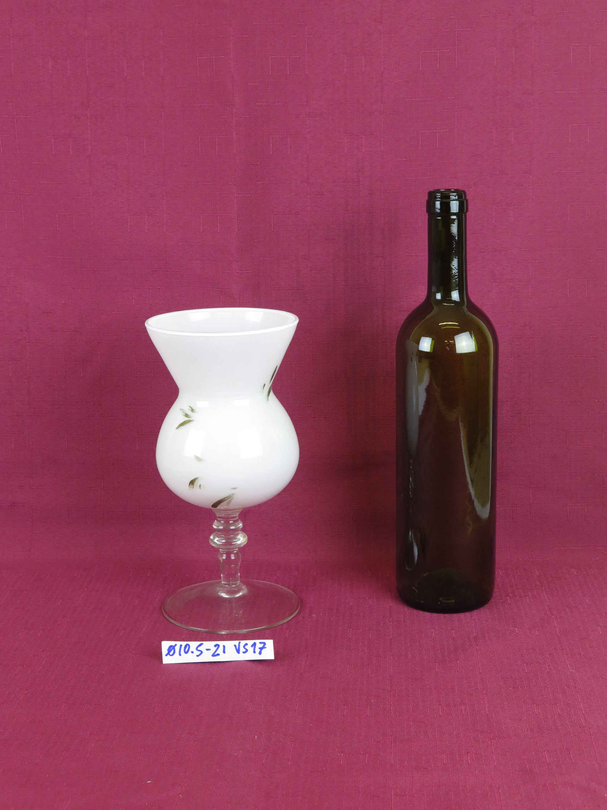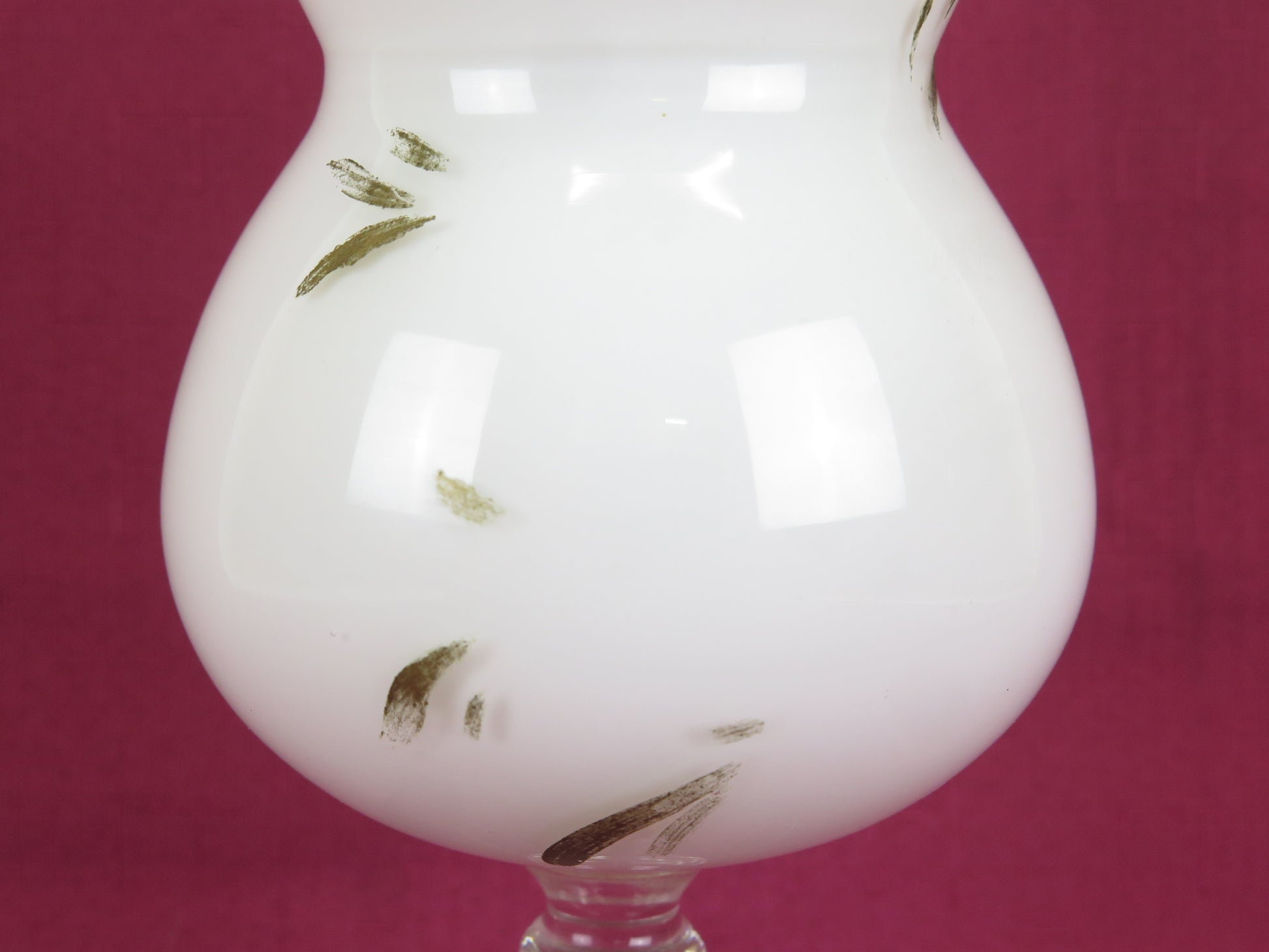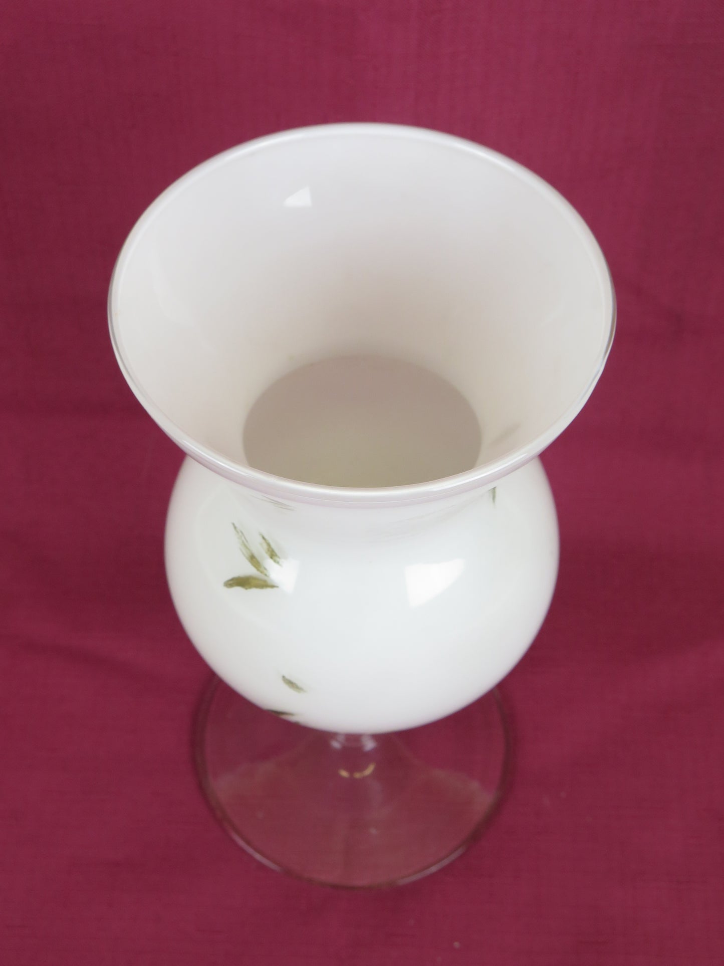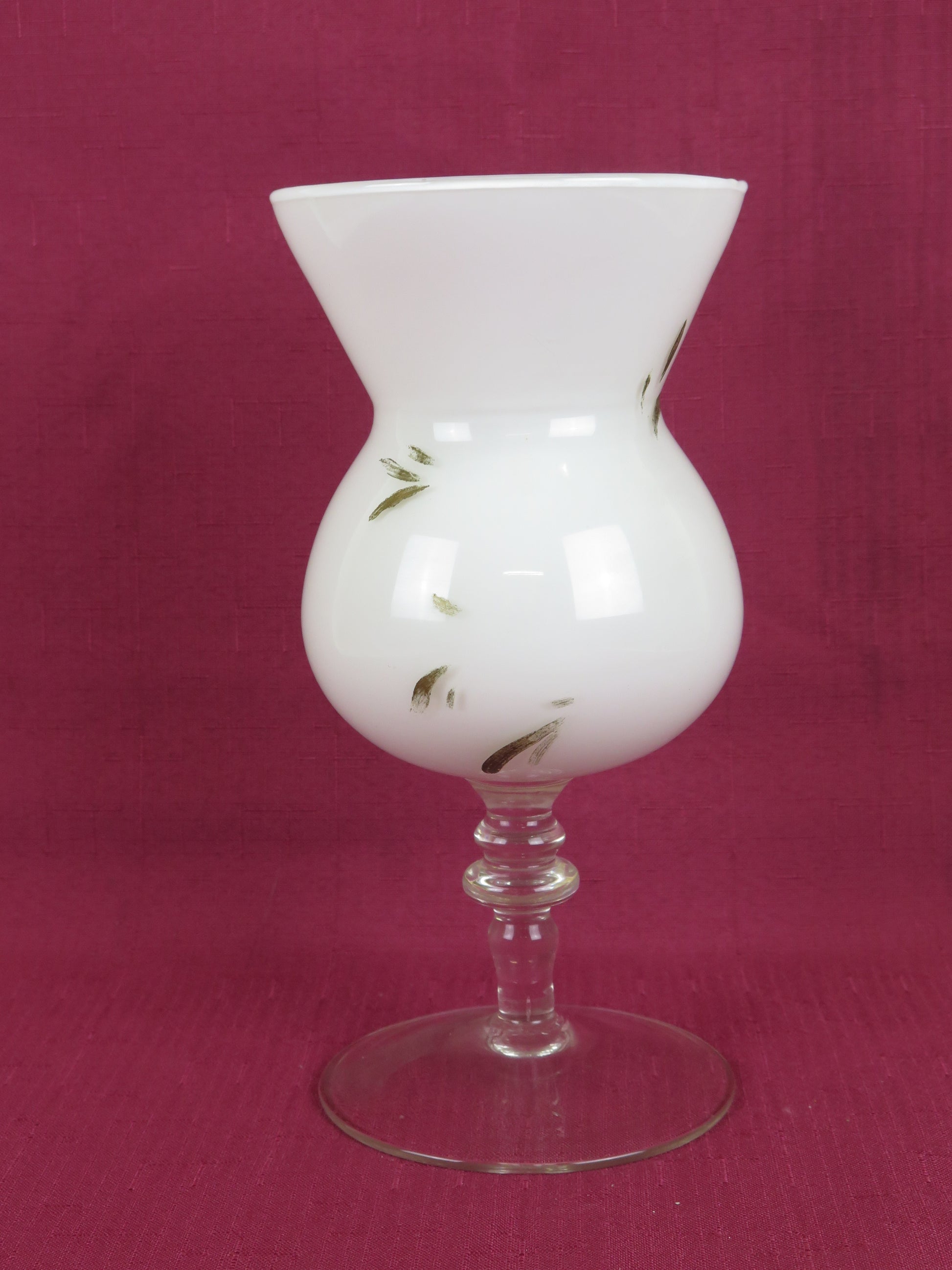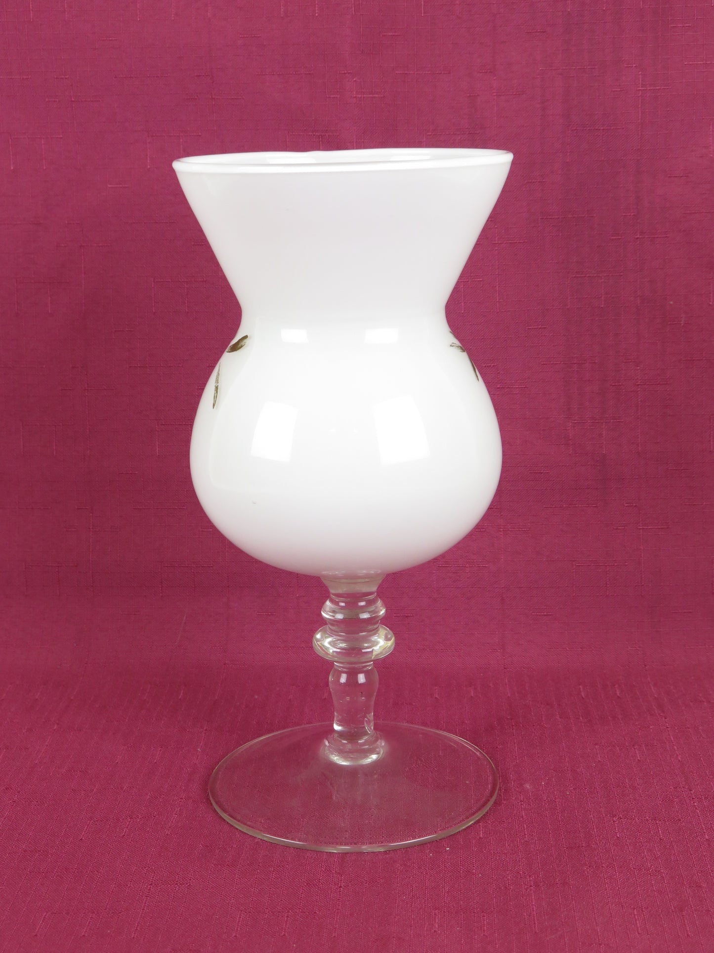 Vaso di vetro opalino bianco con decoro floreale (sbiadito) e gambo di vetro trasparente.