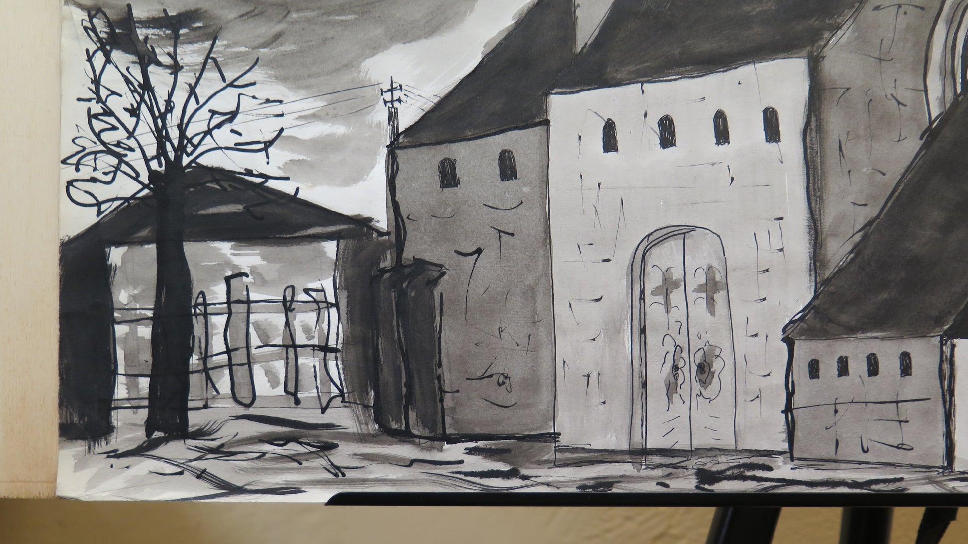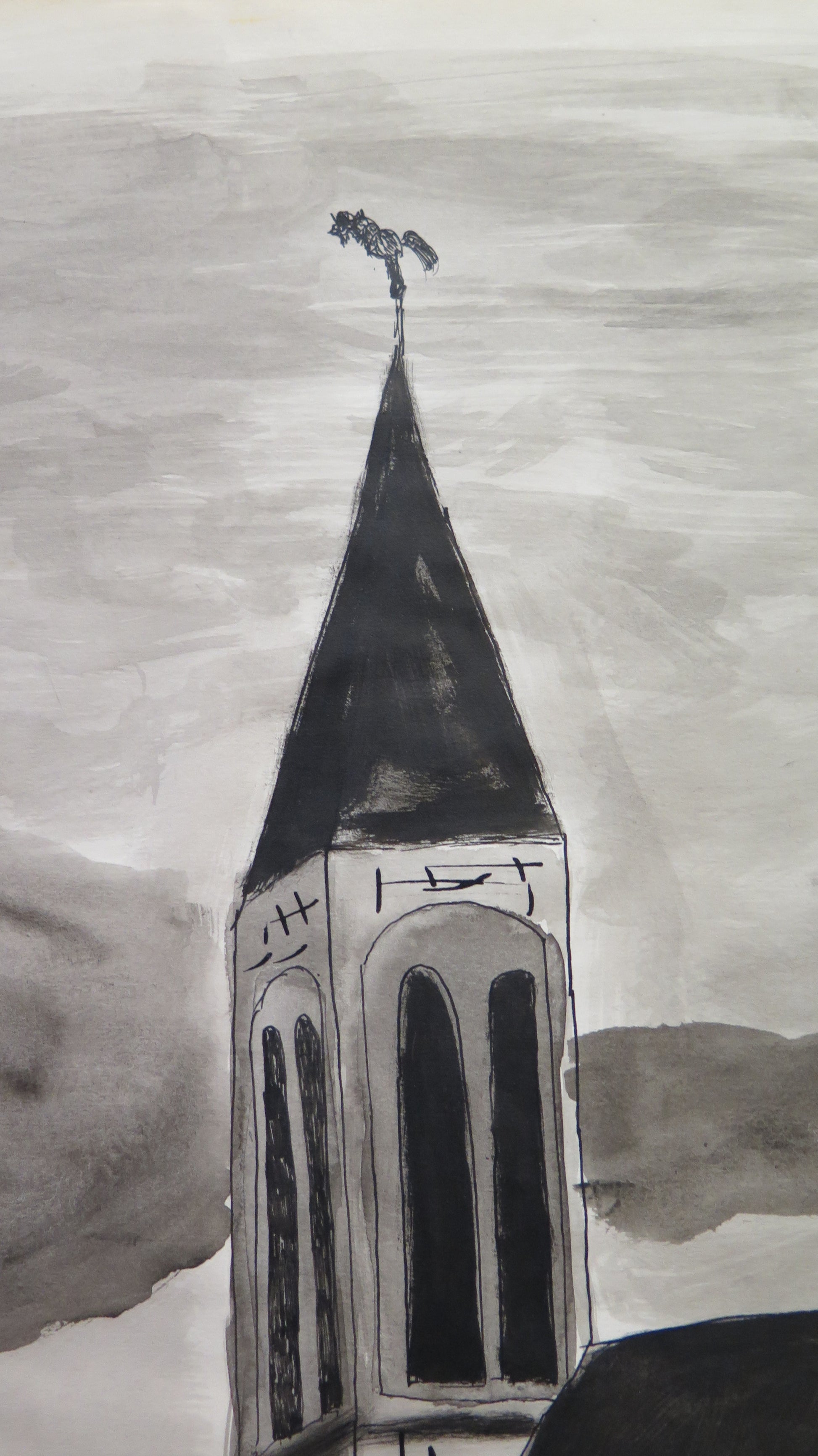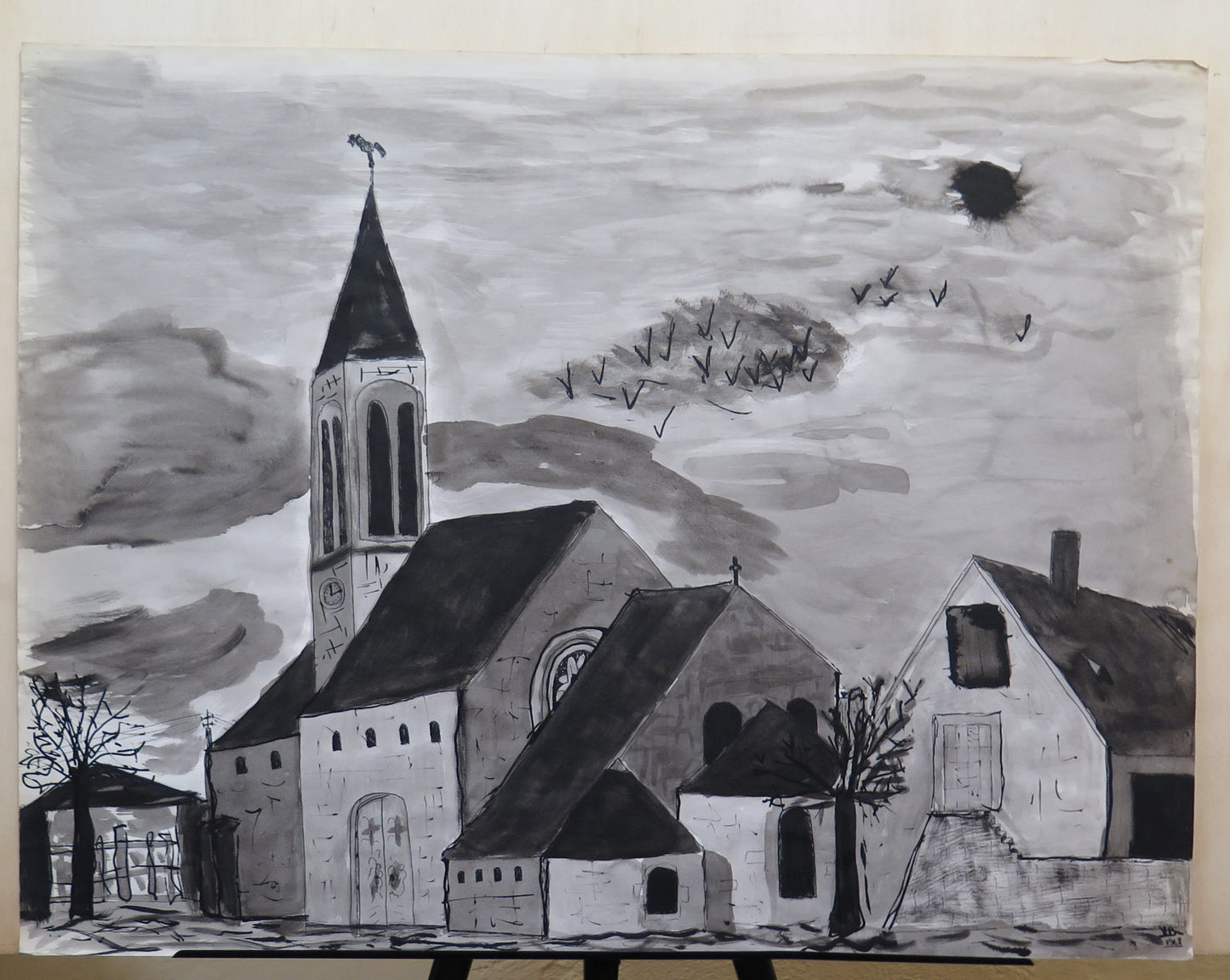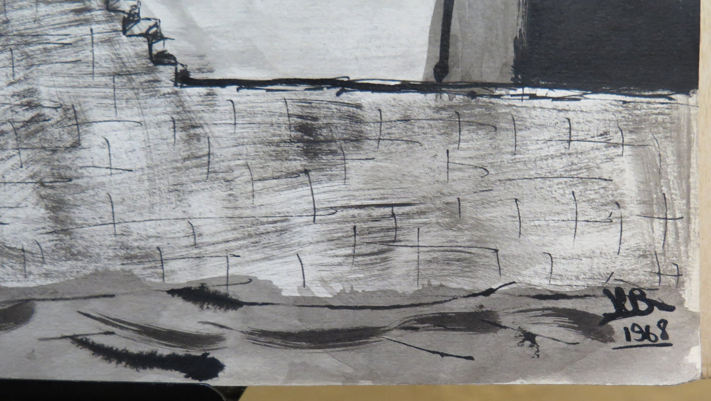 Grande dipinto bianco / nero firmato "VB68" con veduta di un'abbazia francese.