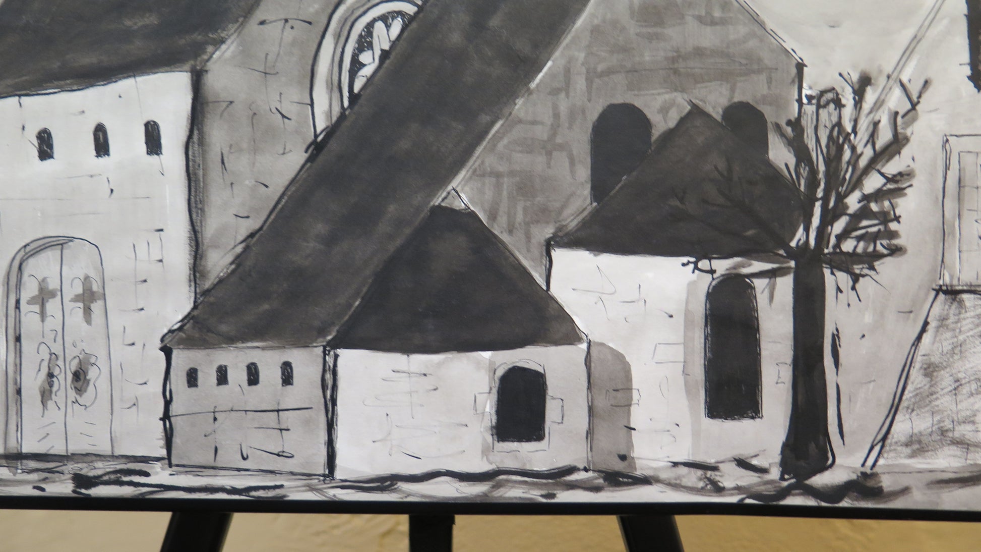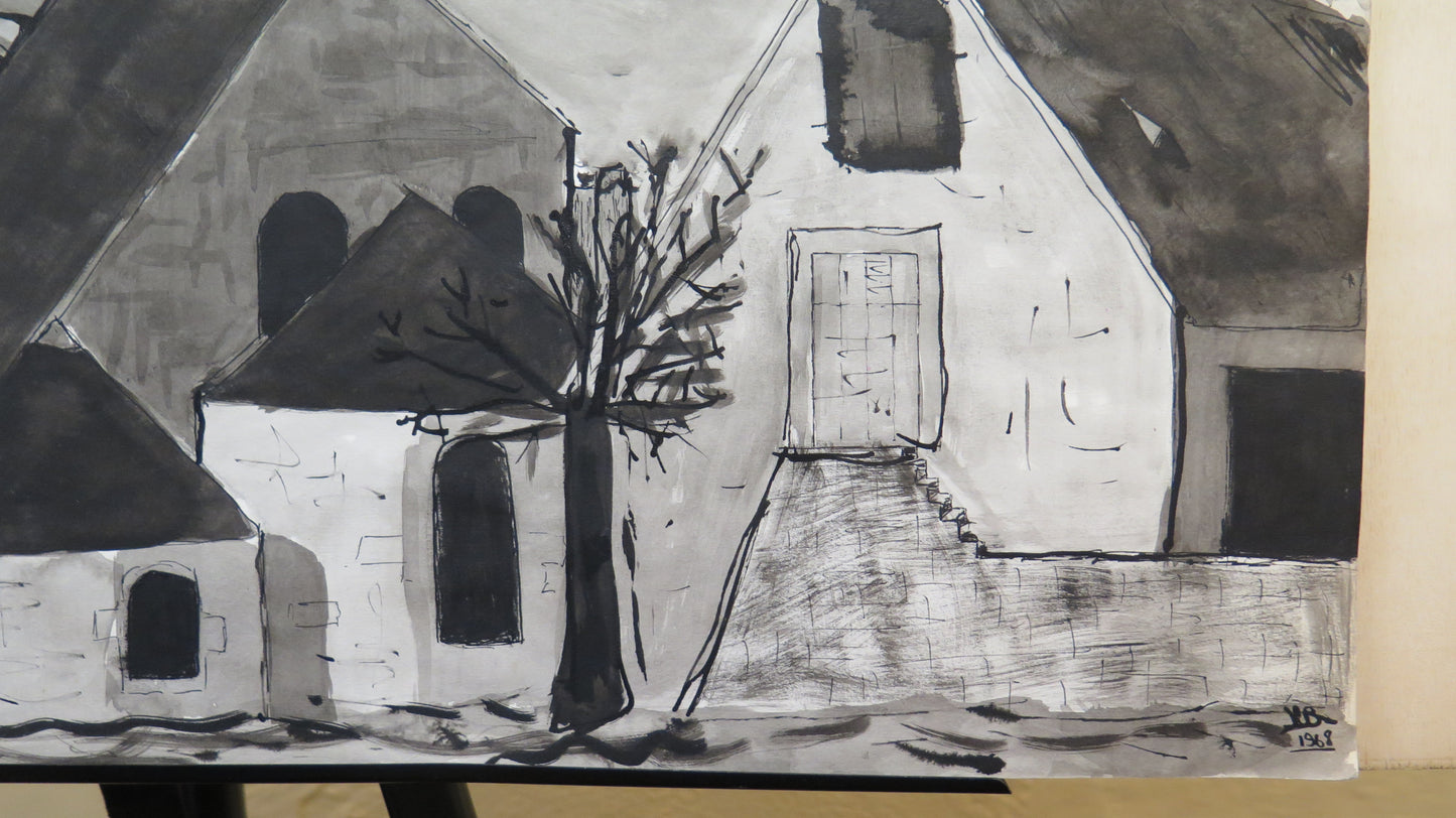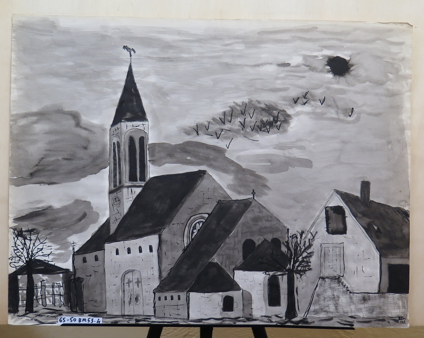 Grande dipinto bianco / nero firmato "VB68" con veduta di un'abbazia francese.