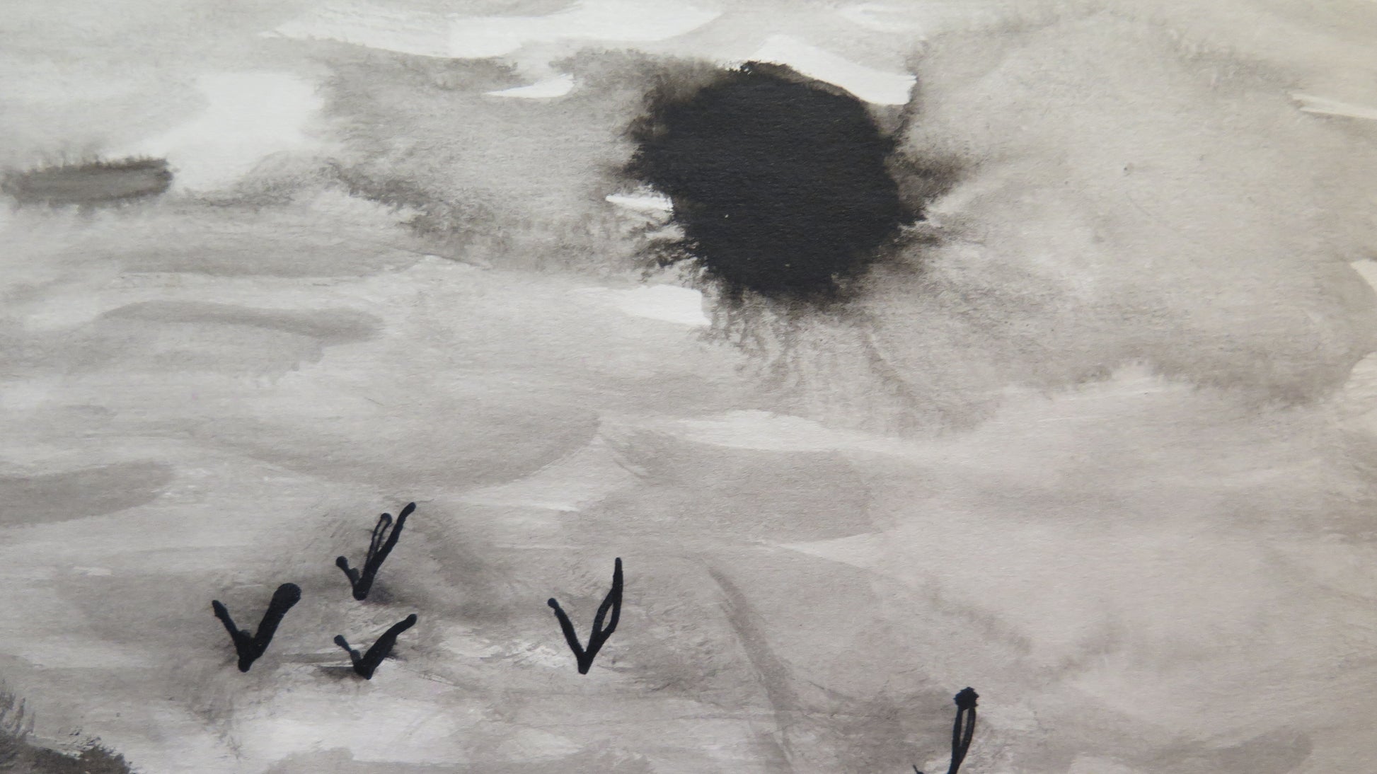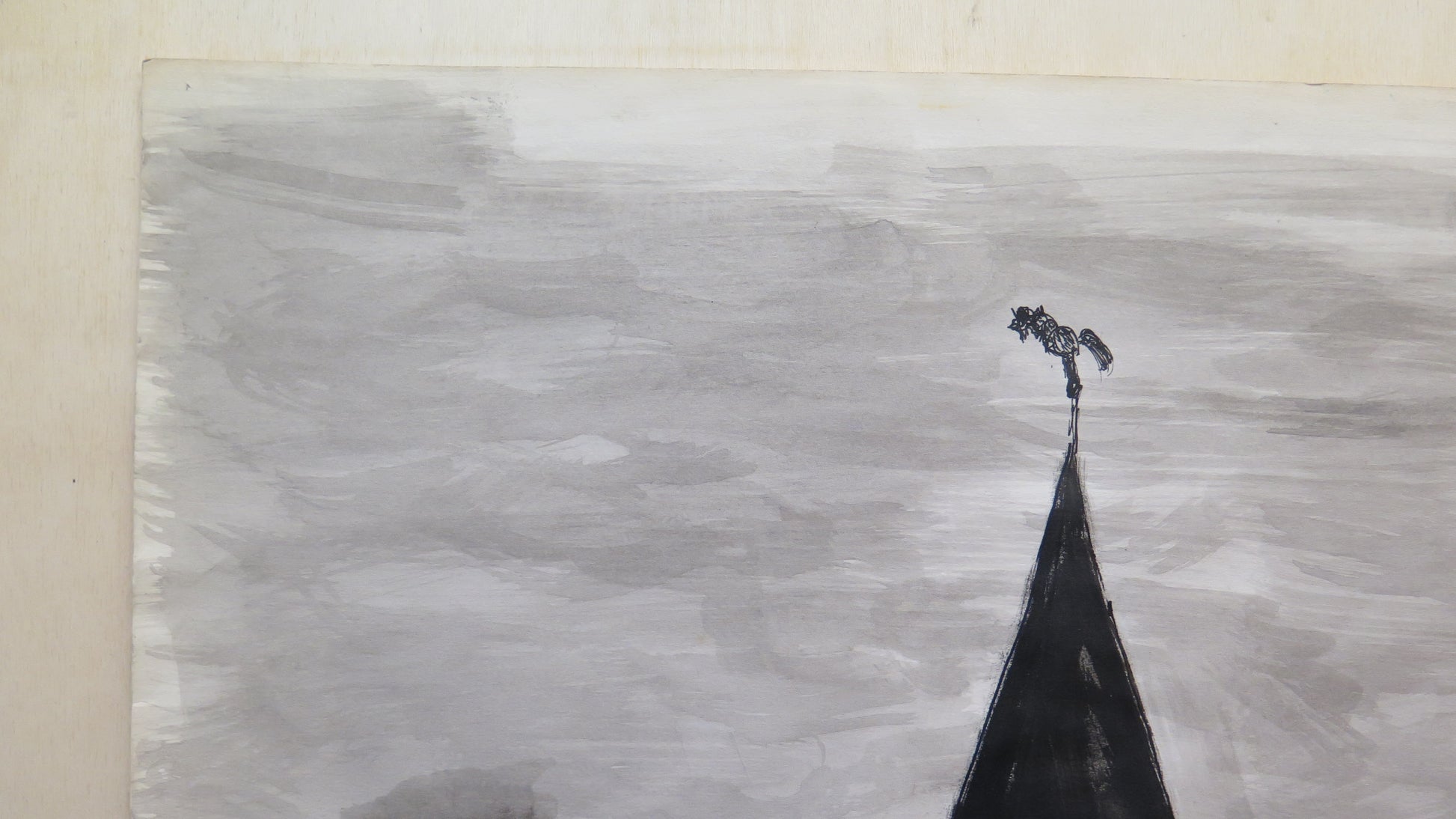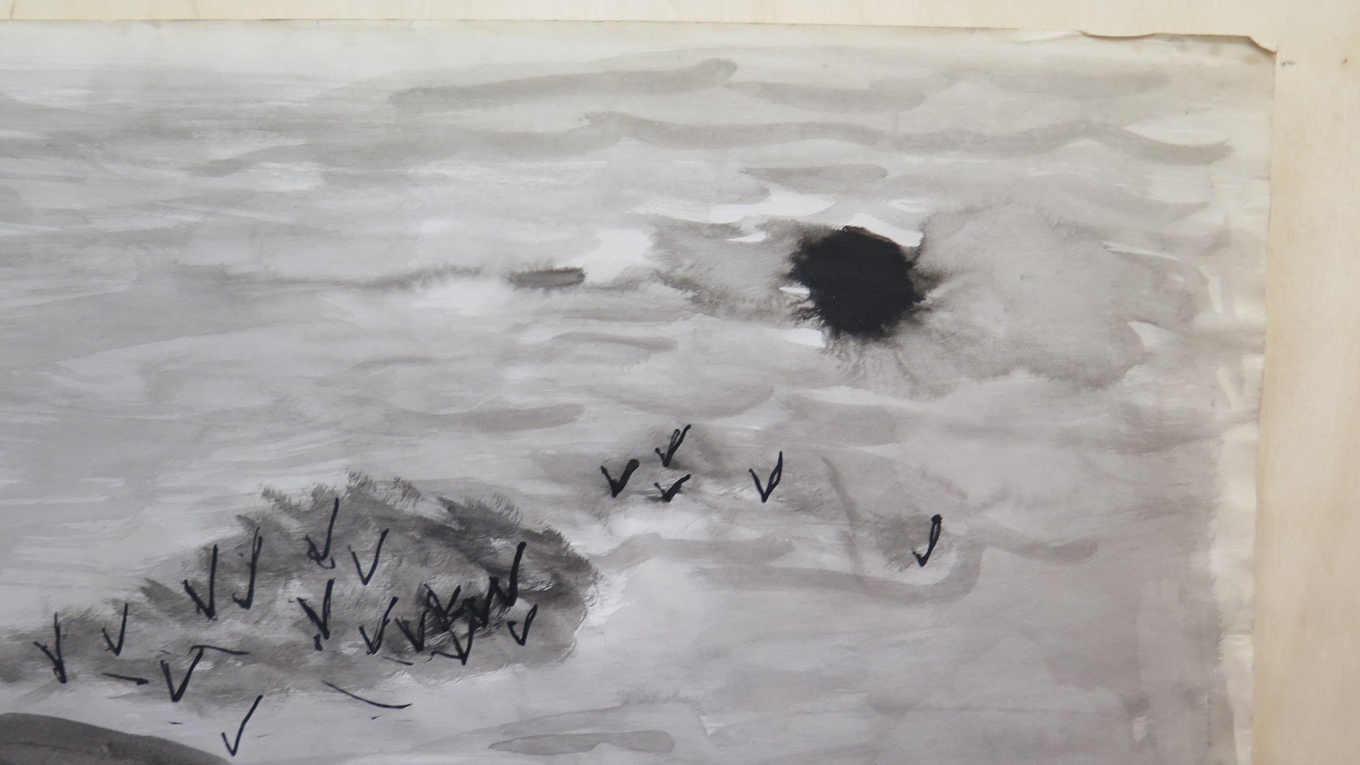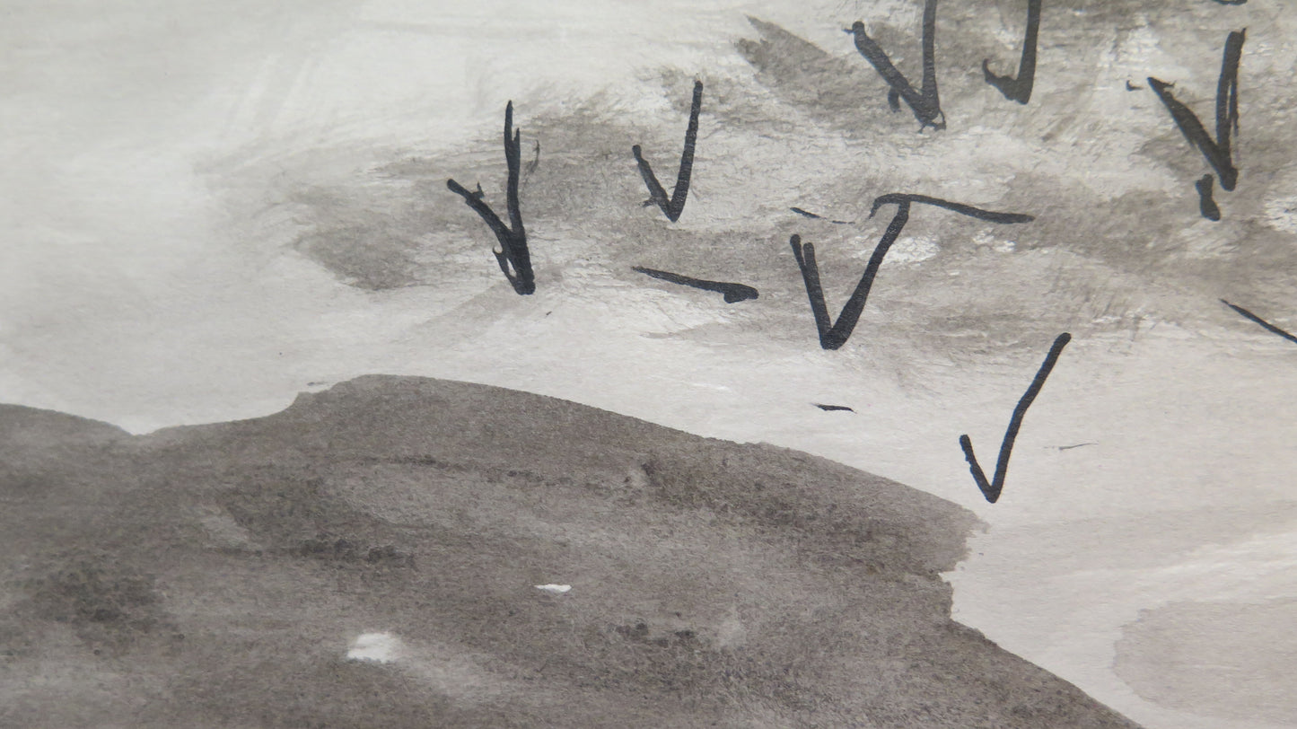 Grande dipinto bianco / nero firmato "VB68" con veduta di un'abbazia francese.