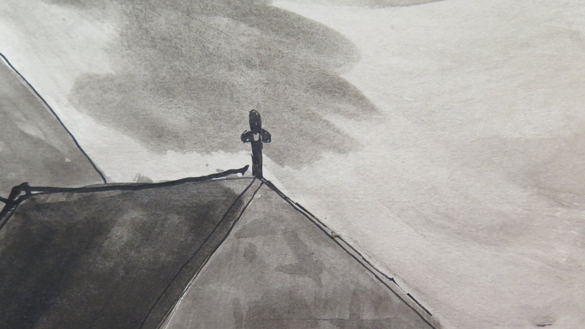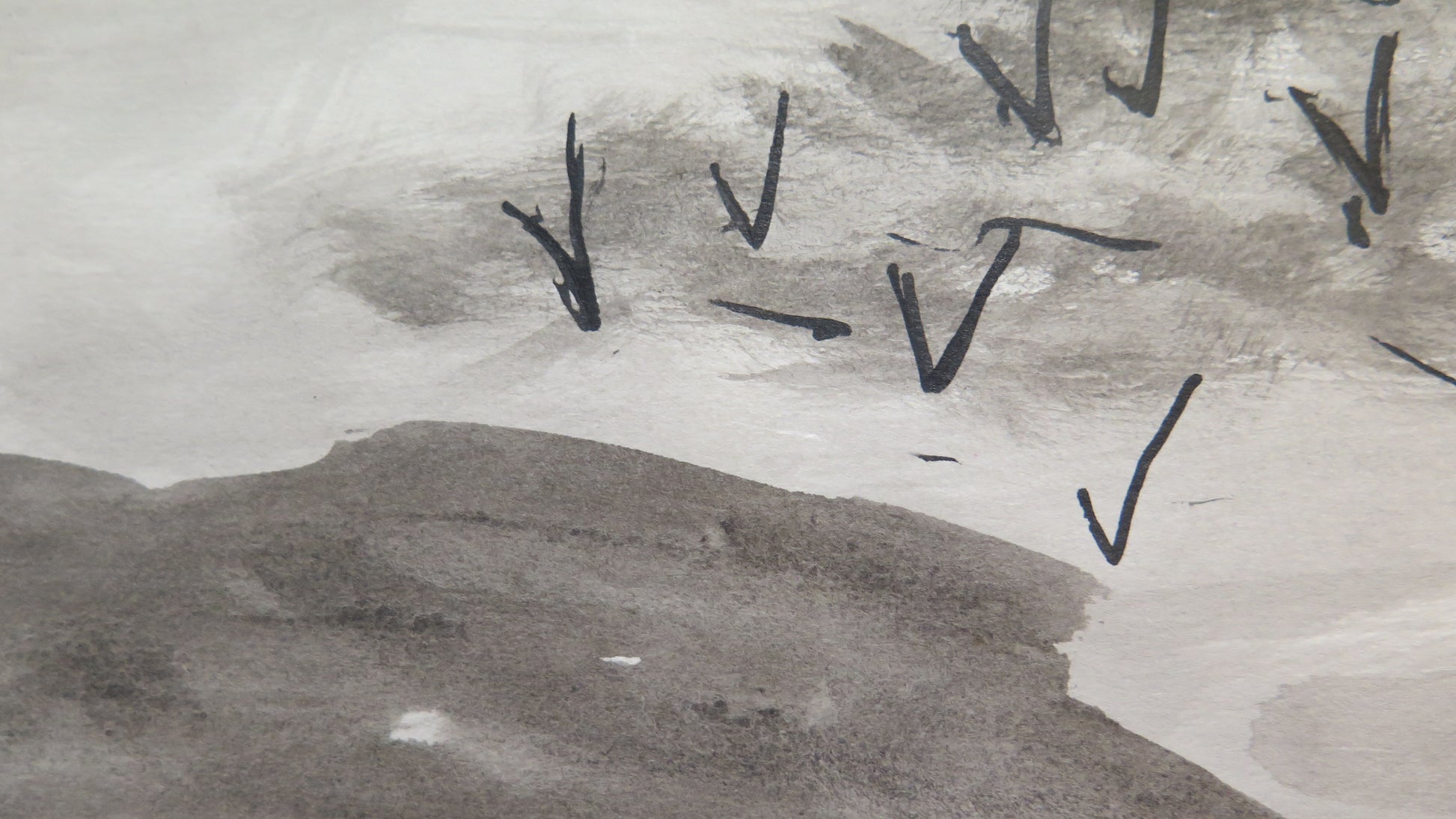 VECCHIO DIPINTO AD ACQUERELLO SU CARTA IN BIANCO E NERO VEDUTA DI ABBAZIA FRANCIA MATA' 20 SECOLO BM53.4