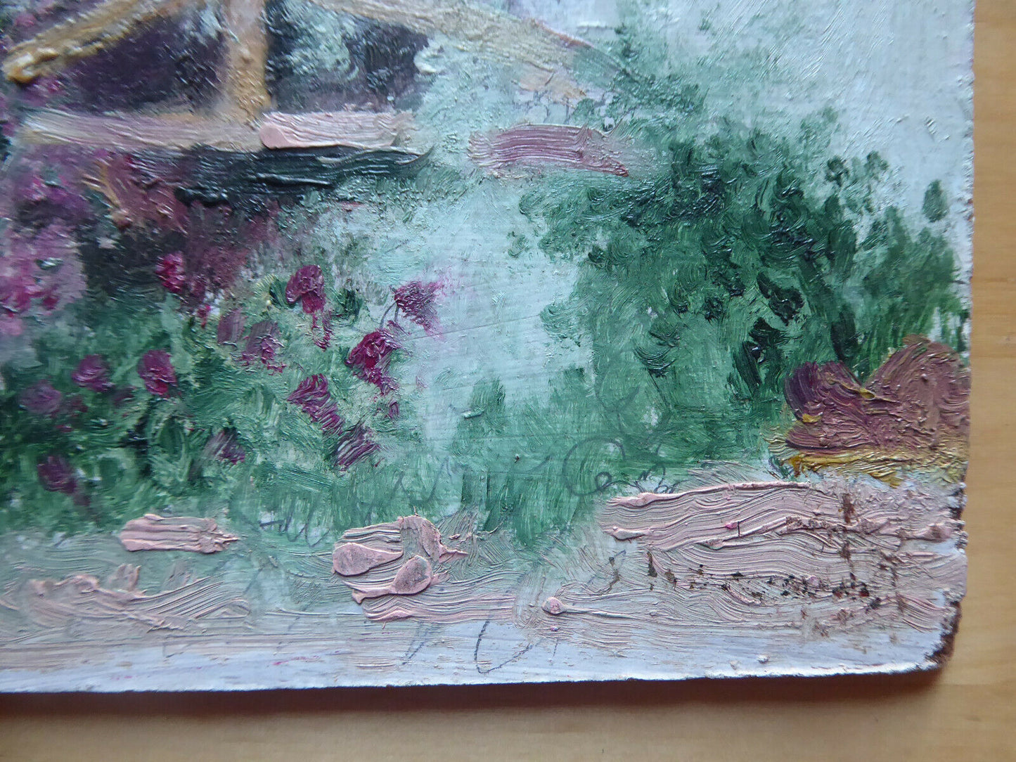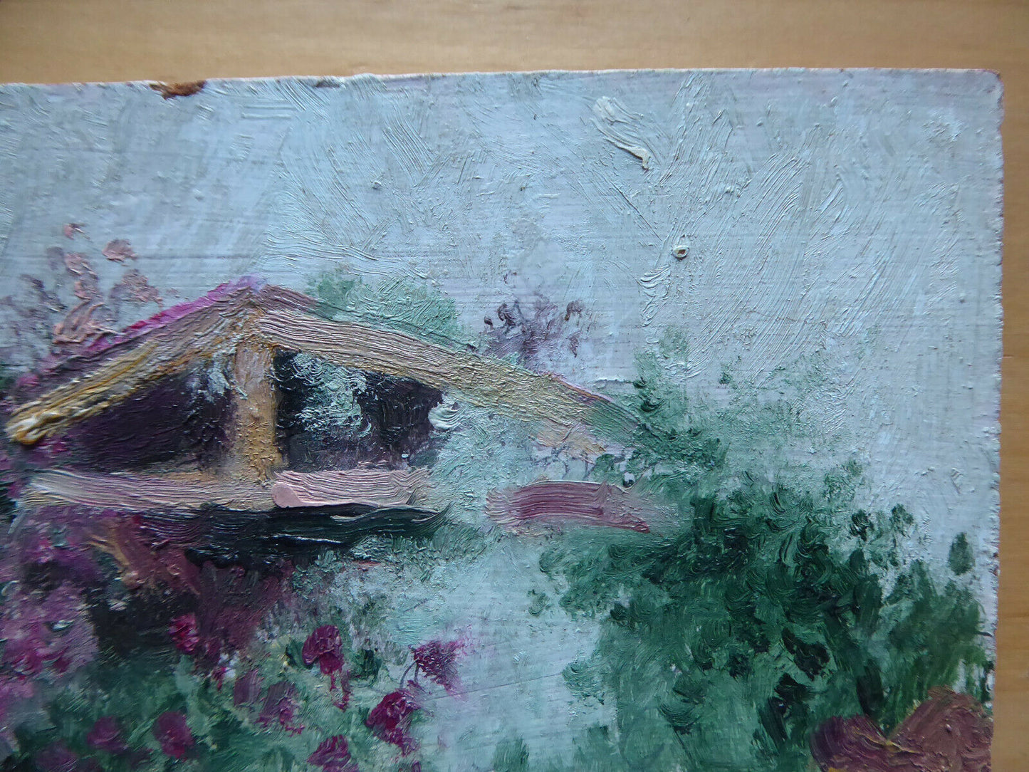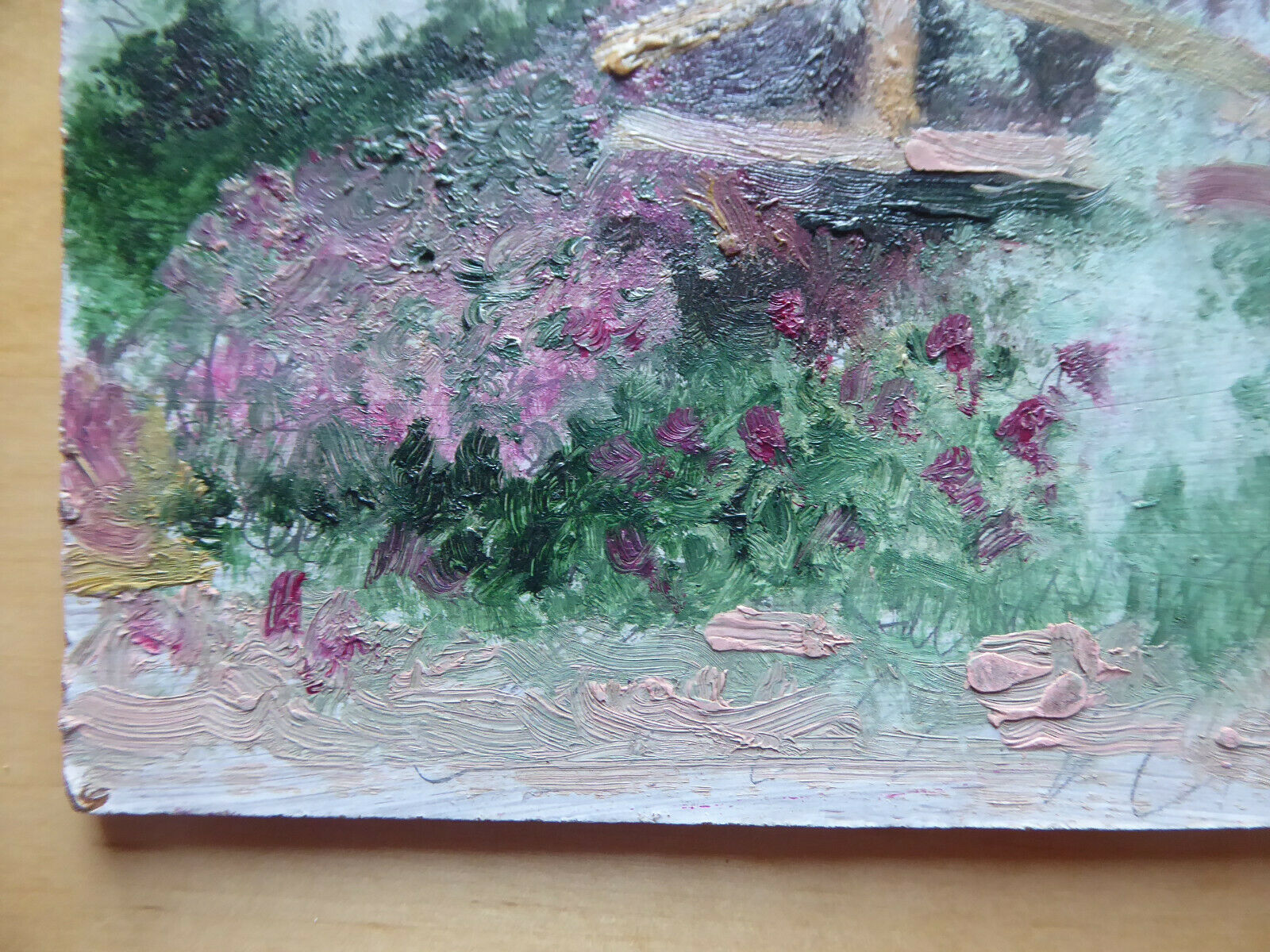 VECCHIO DIPINTO AD OLIO SU TAVOLA PICCOLO QUADRO PAESAGGIO IN FIORE VINTAGE MD1