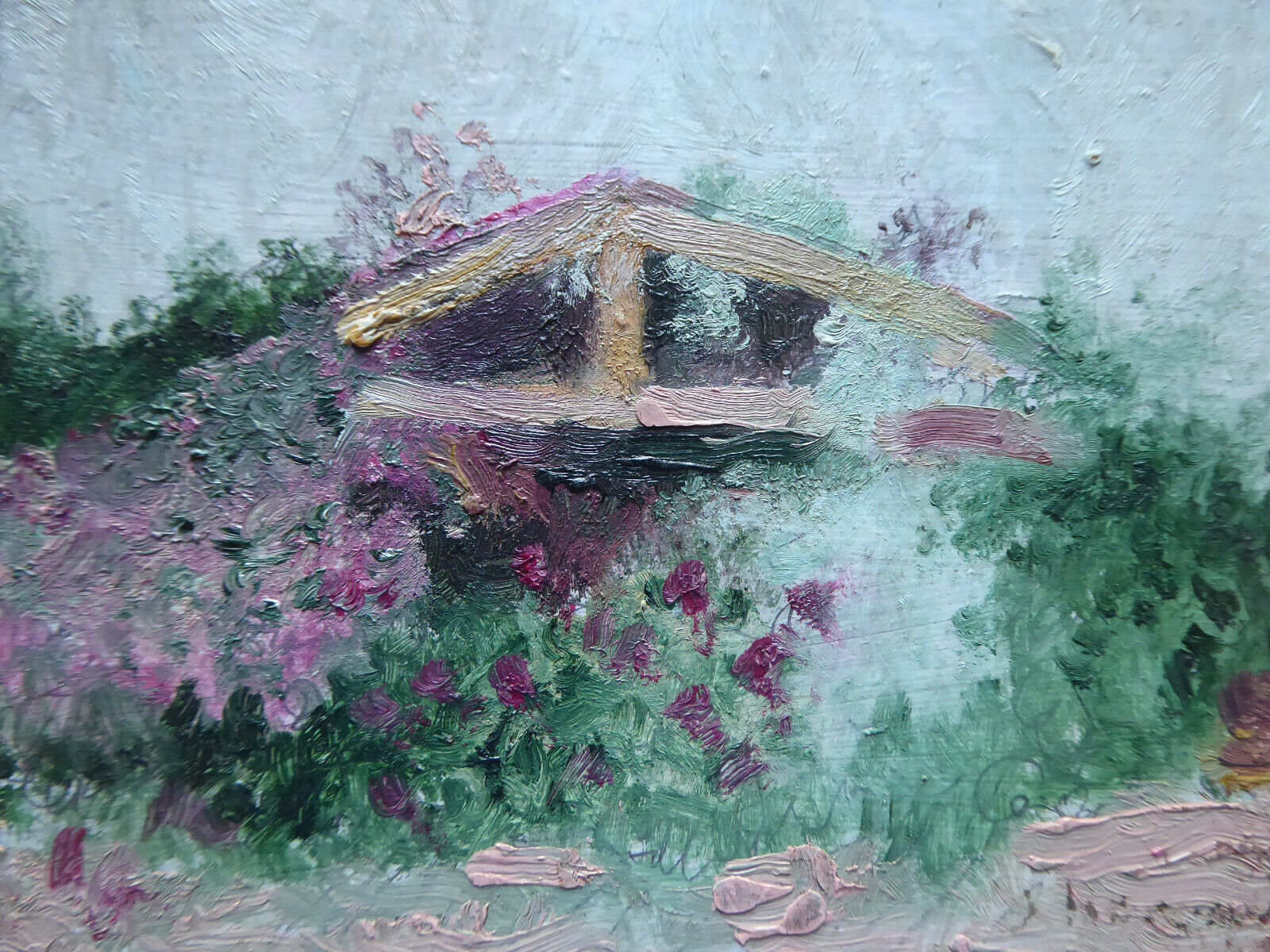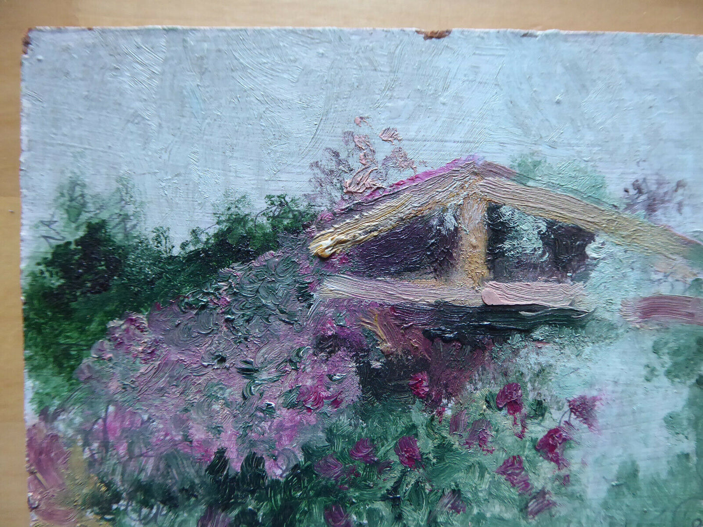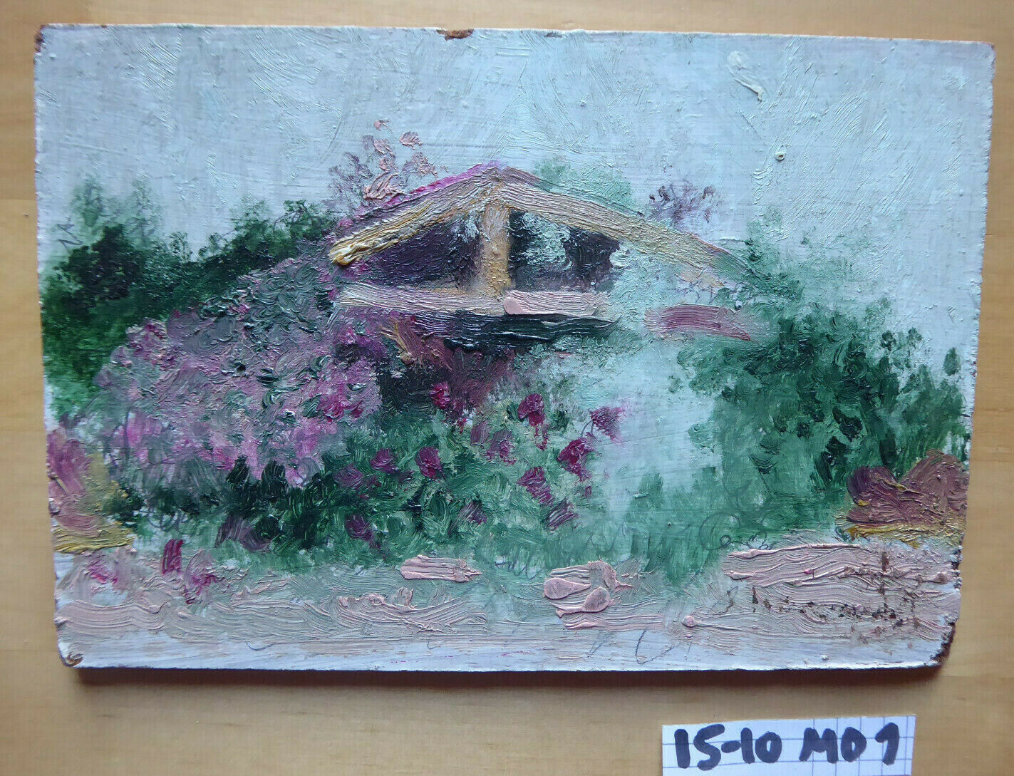 VECCHIO DIPINTO AD OLIO SU TAVOLA PICCOLO QUADRO PAESAGGIO IN FIORE VINTAGE MD1