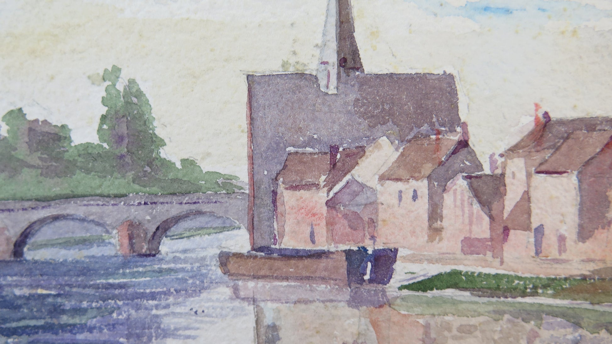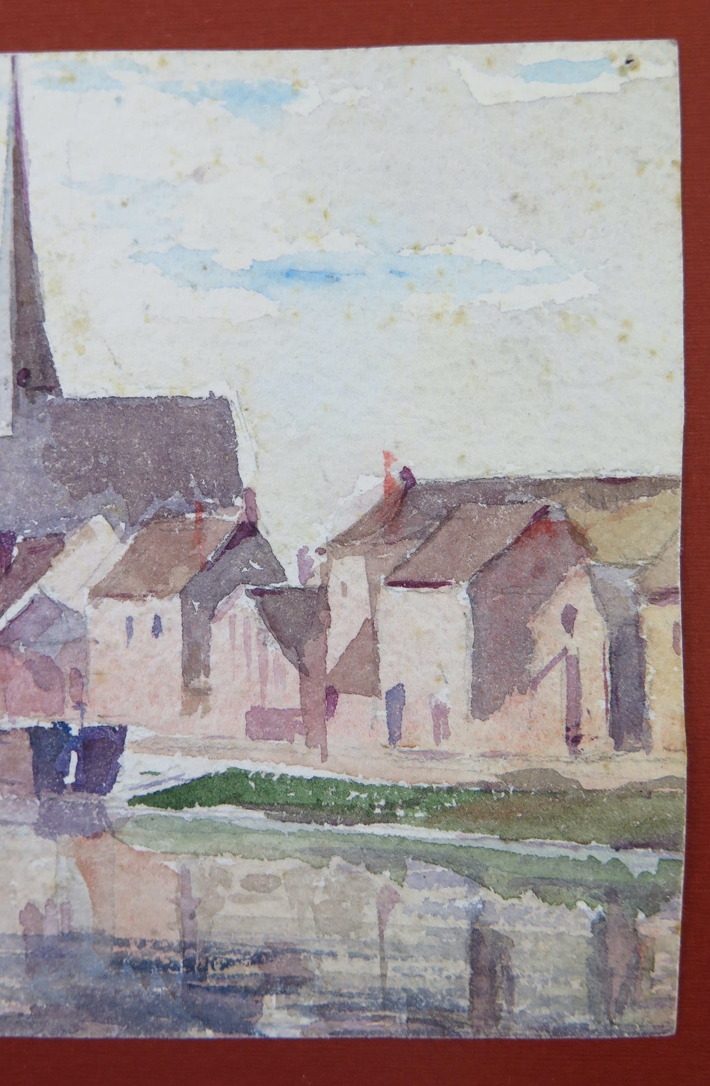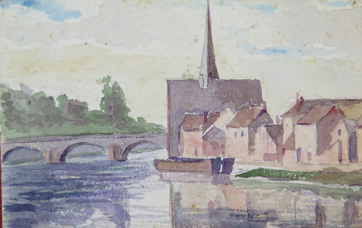 Delizioso dipinto di piccole dimensioni che raffigura un tipico paese della Francia. Dipinto anche al retro.