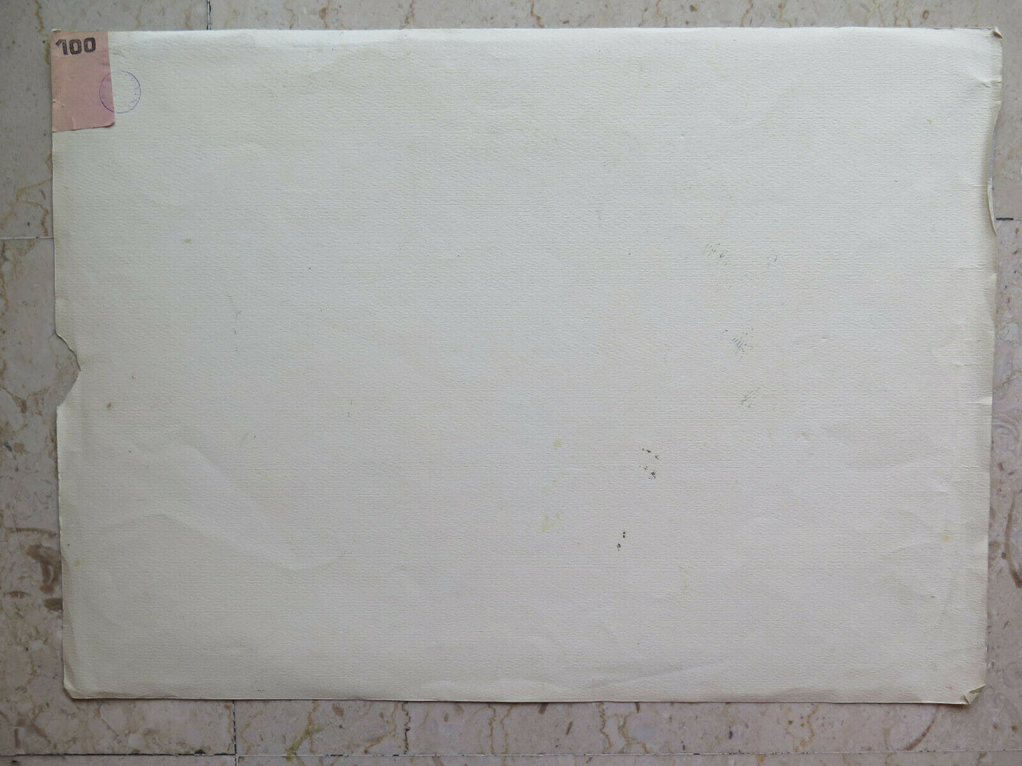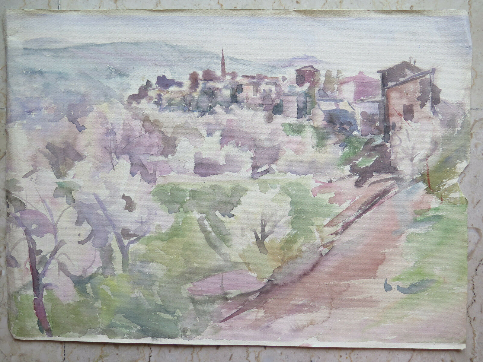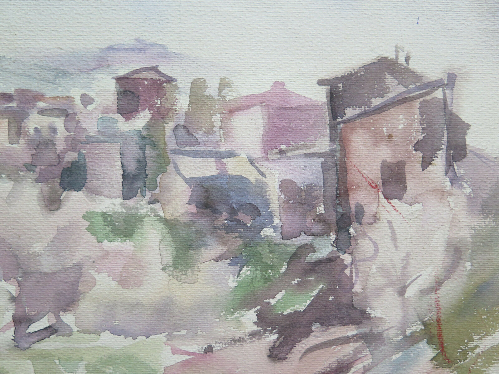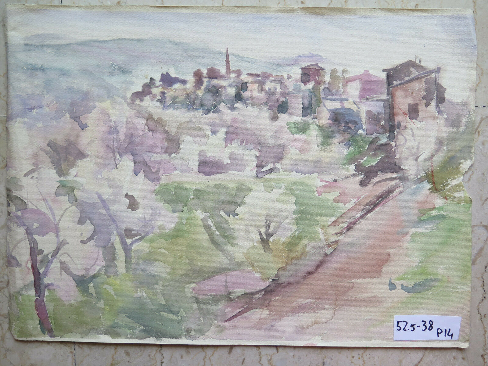 VECCHIO DIPINTO PITTORE LOCALE BOZZETTO SCORCIO DI PAESE SU CARTA 52x38 cm P14