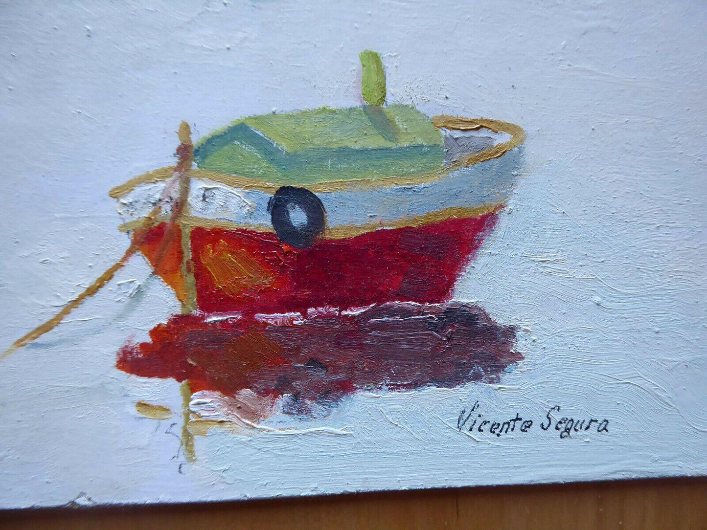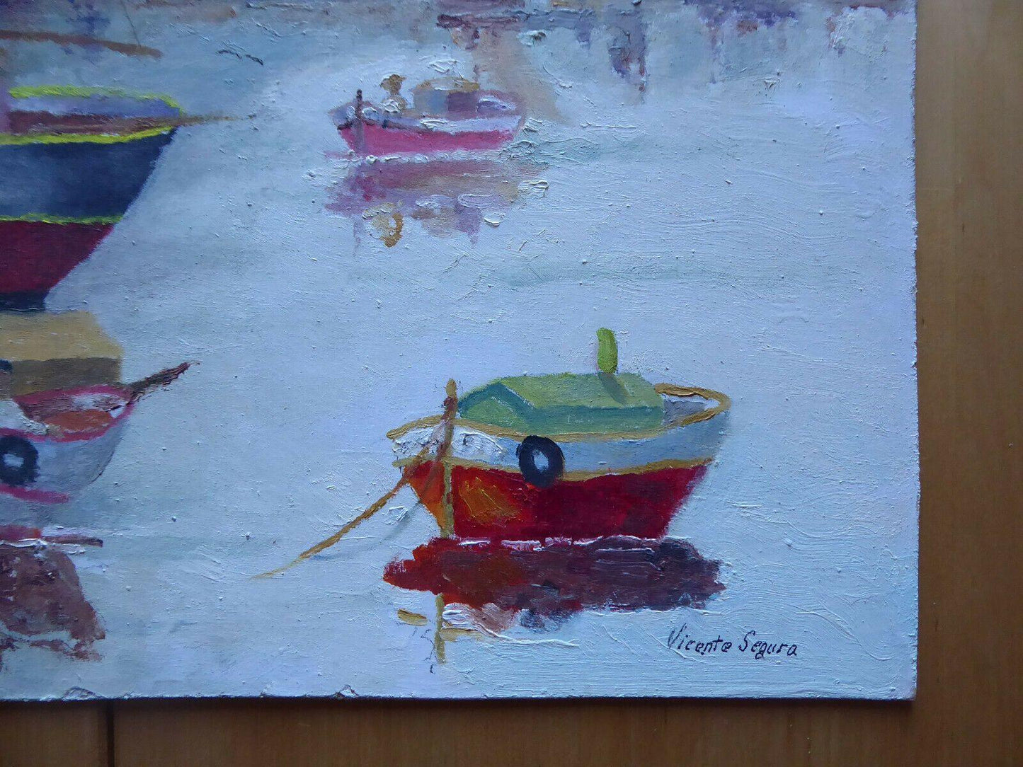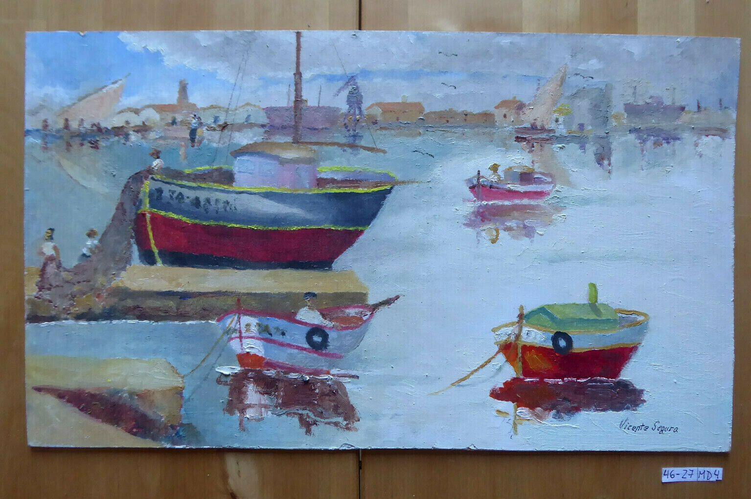 VECCHIO QUADRO AD OLIO SU TAVOLA MARINA BARCHE FIRMATO SEGURA SPAGNA '900 MD4