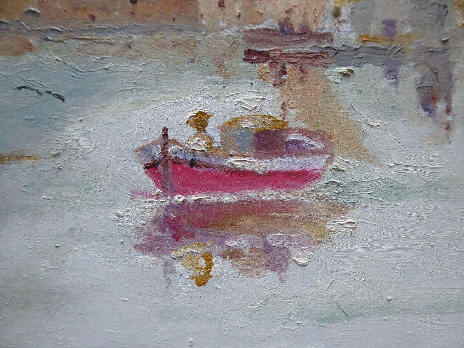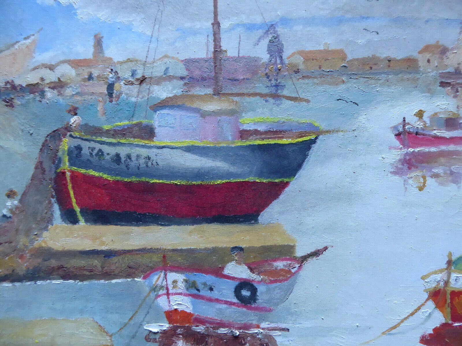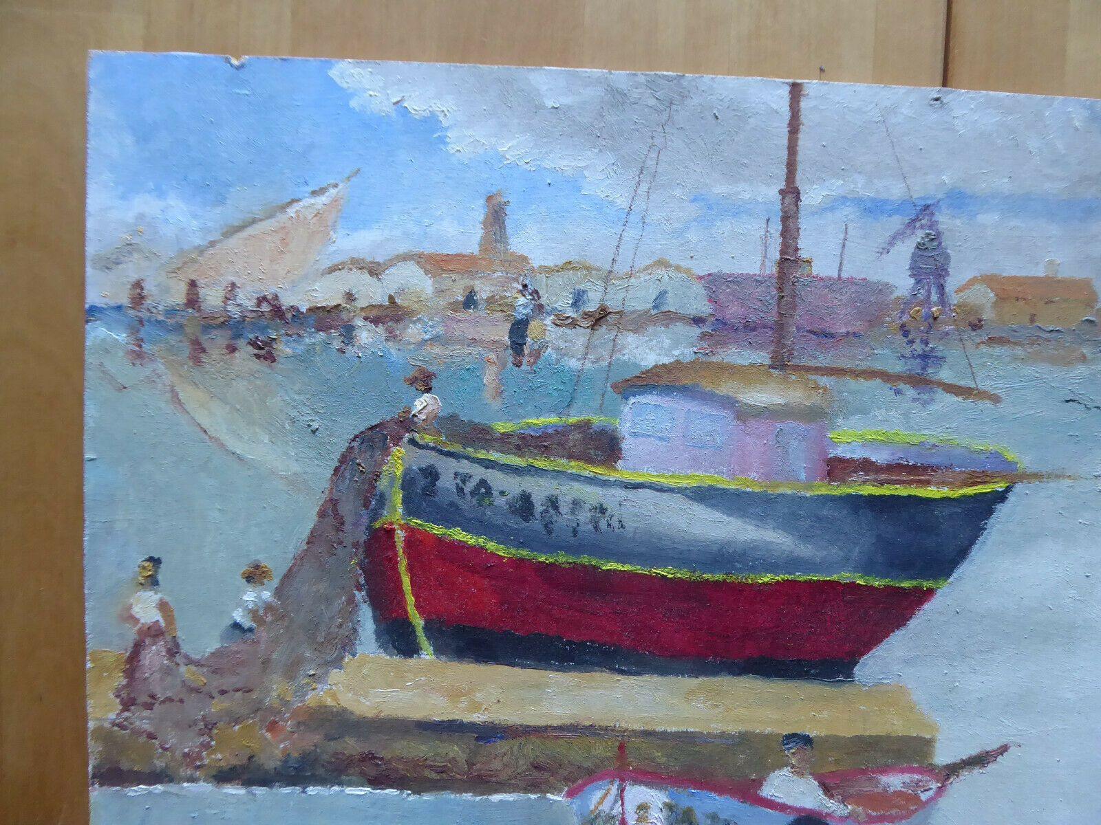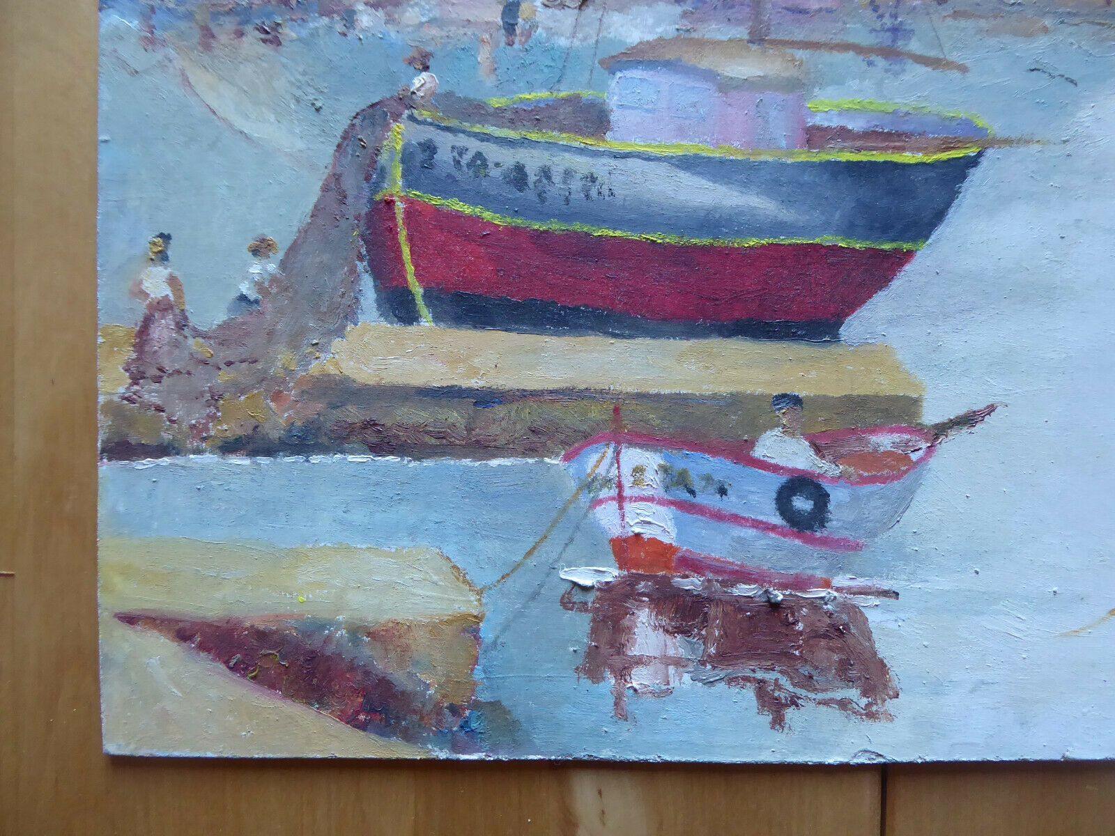 VECCHIO QUADRO AD OLIO SU TAVOLA MARINA BARCHE FIRMATO SEGURA SPAGNA '900 MD4