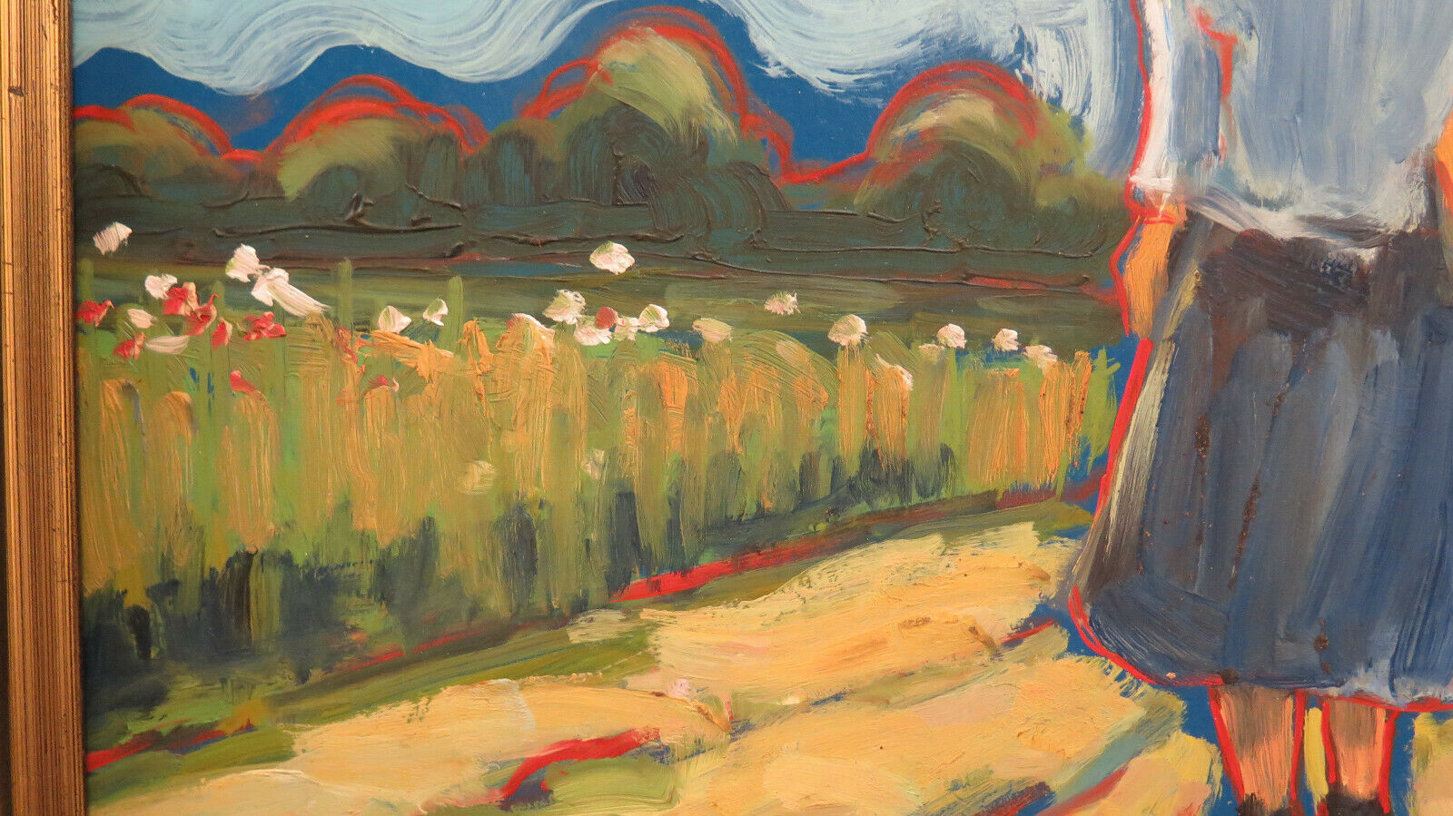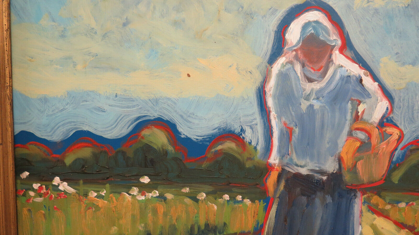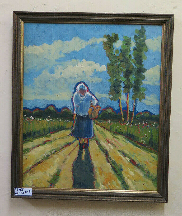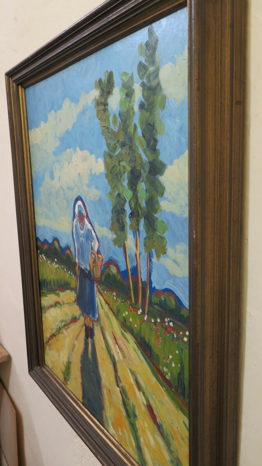 Luminiso dipinto che raffigura una contadina incamminata lungo una strada di campagna la cui sagoma si staglia sul cielo azzurro, il tutto rappresentato con larghe pennellate.