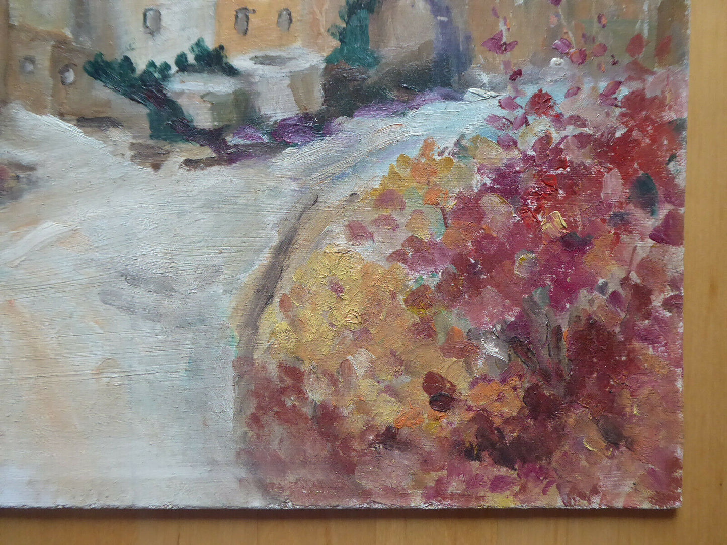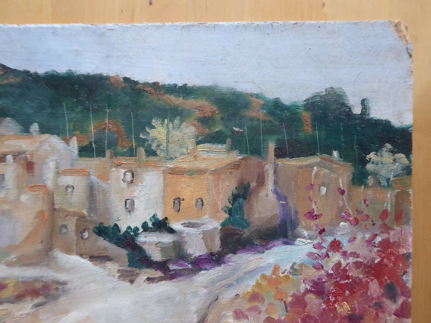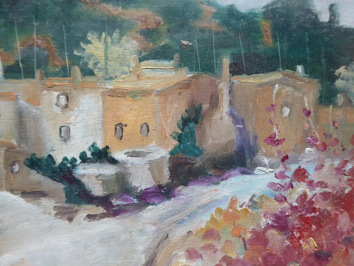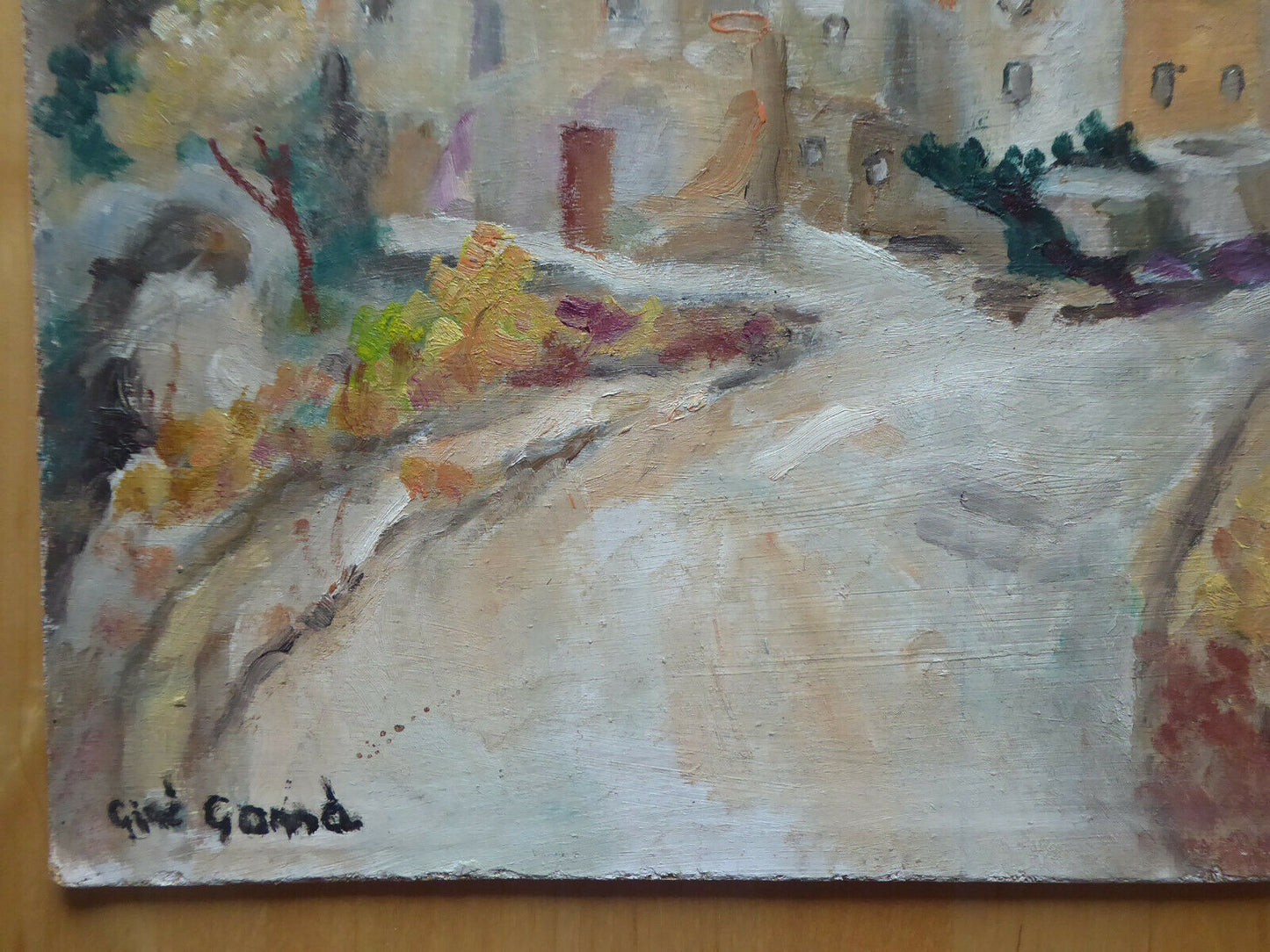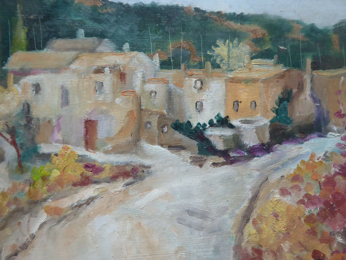 Elegante dipinto ad olio su tavola in stile impressionista che raffigura un paesaggio della campagna spagnola firmato "Ginè Gomà " in basso a sinistra ed al retro. Intitolato "otoño en el pueblo" (autunno nel paese).