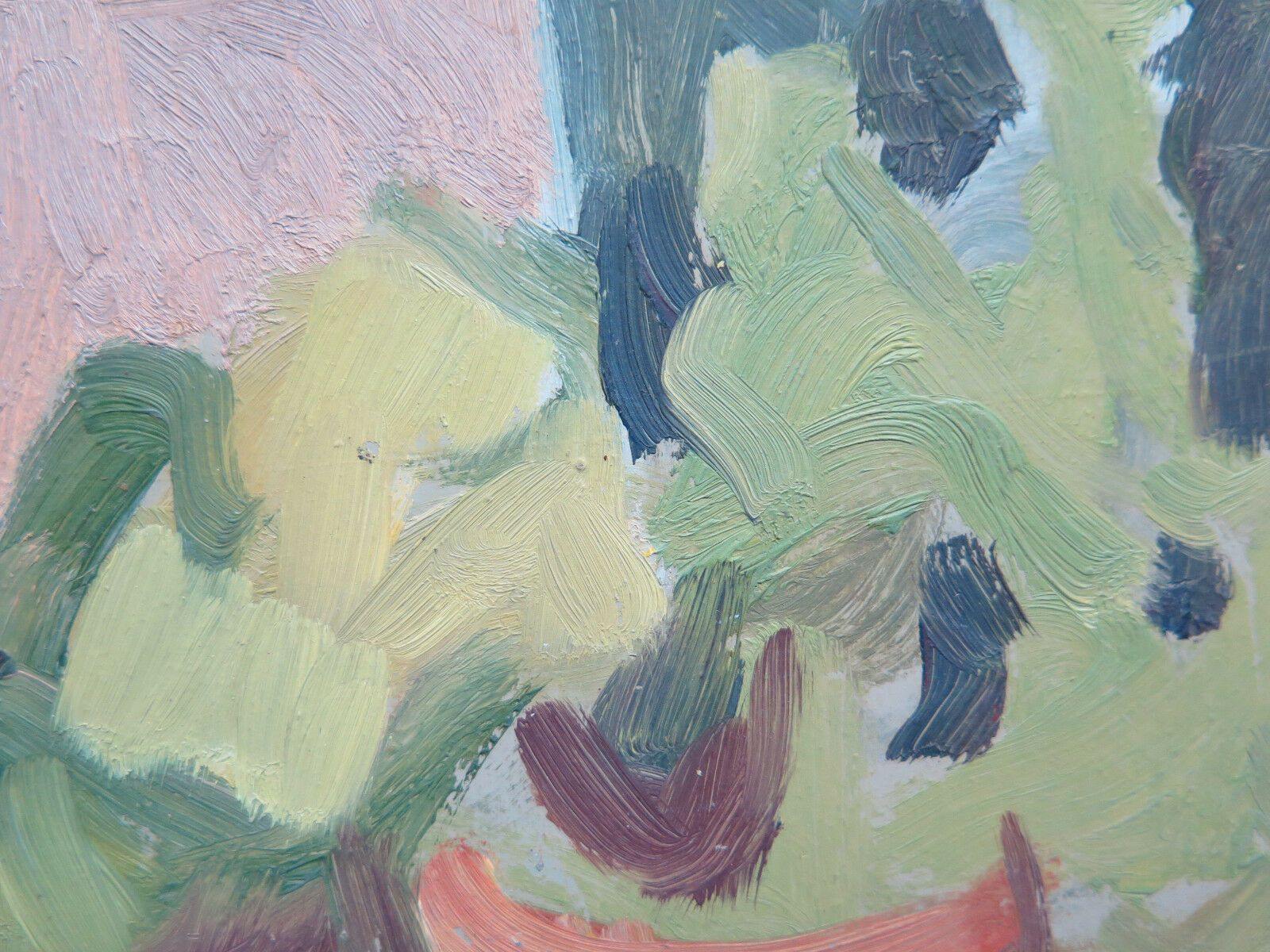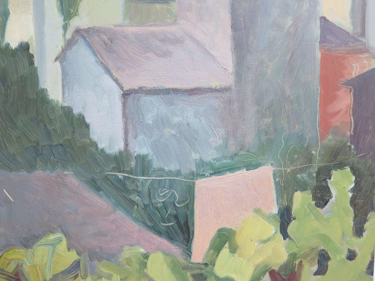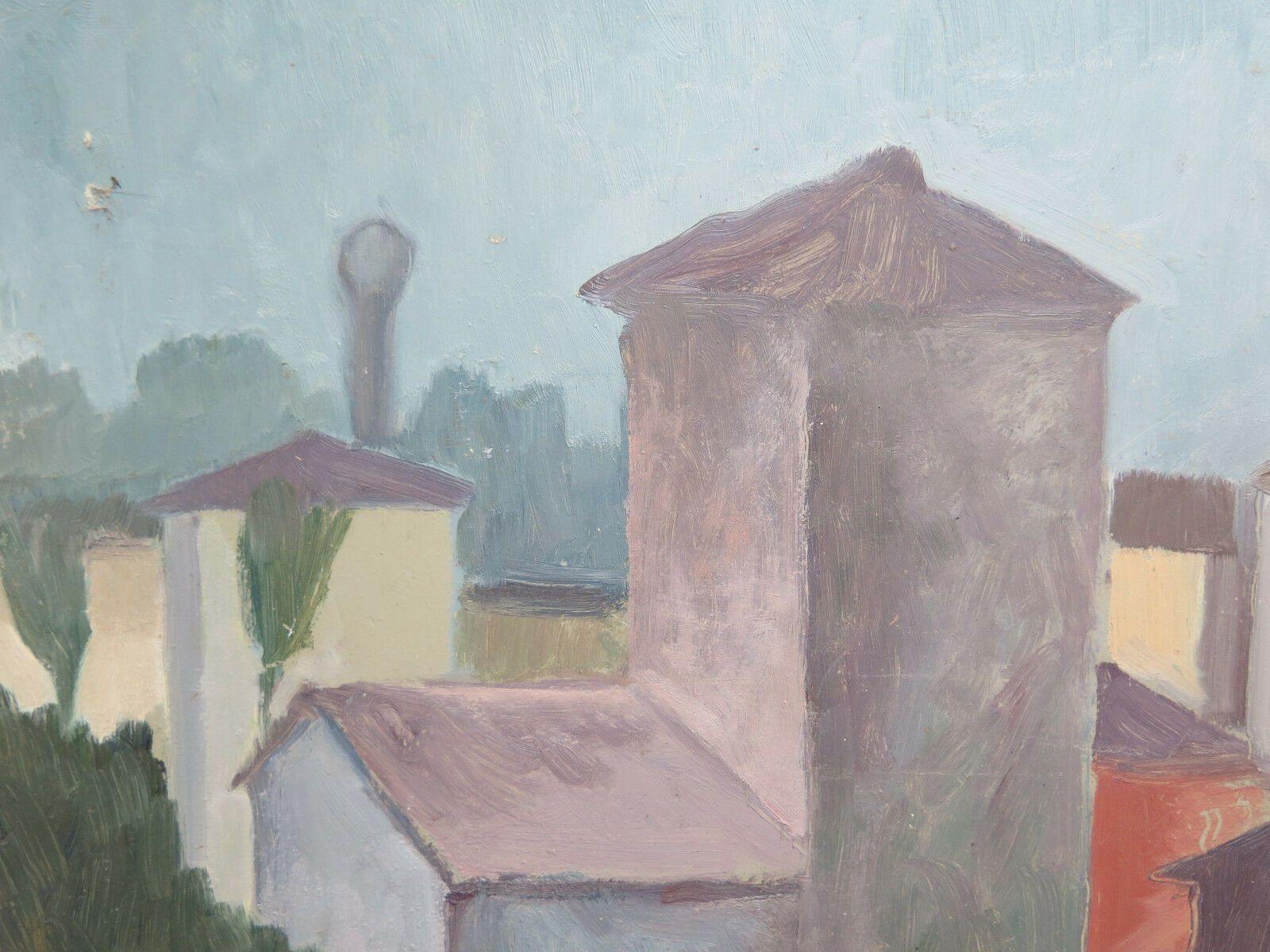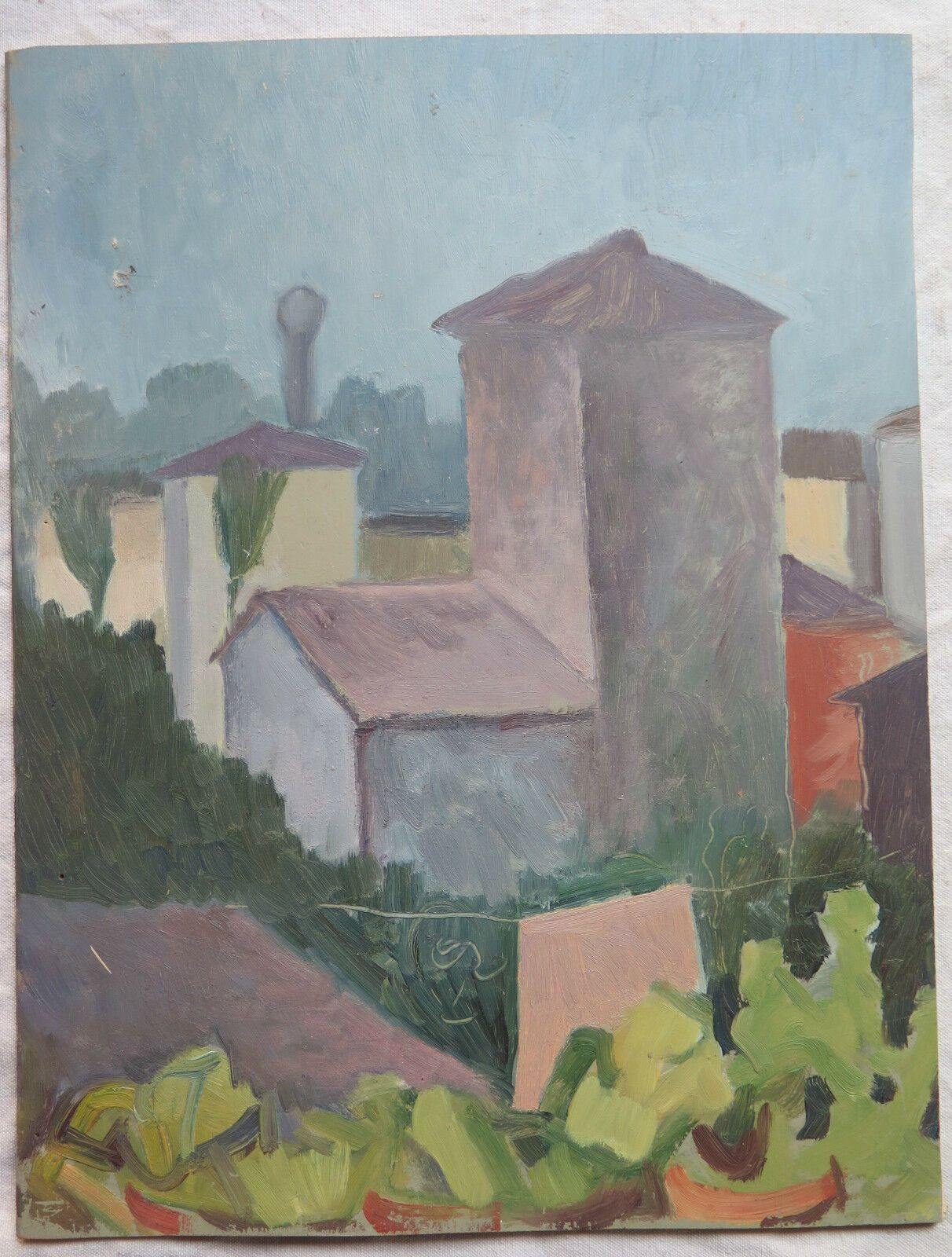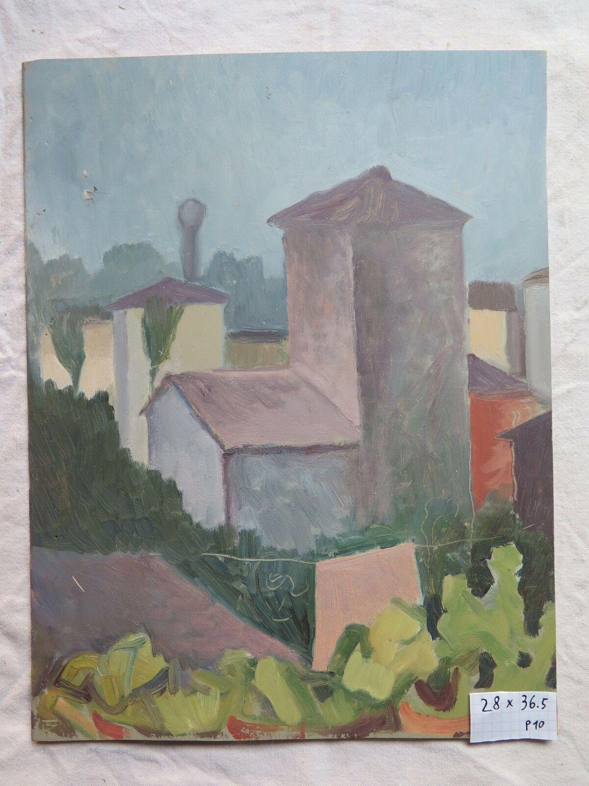 Antico dipinto ad olio su tavola realizzato dal pittore modenese Gaetano Pancaldi (1922-2014), veduta dalla finestra della casa del pittore, soggetto ricorrente nella sua produzione.