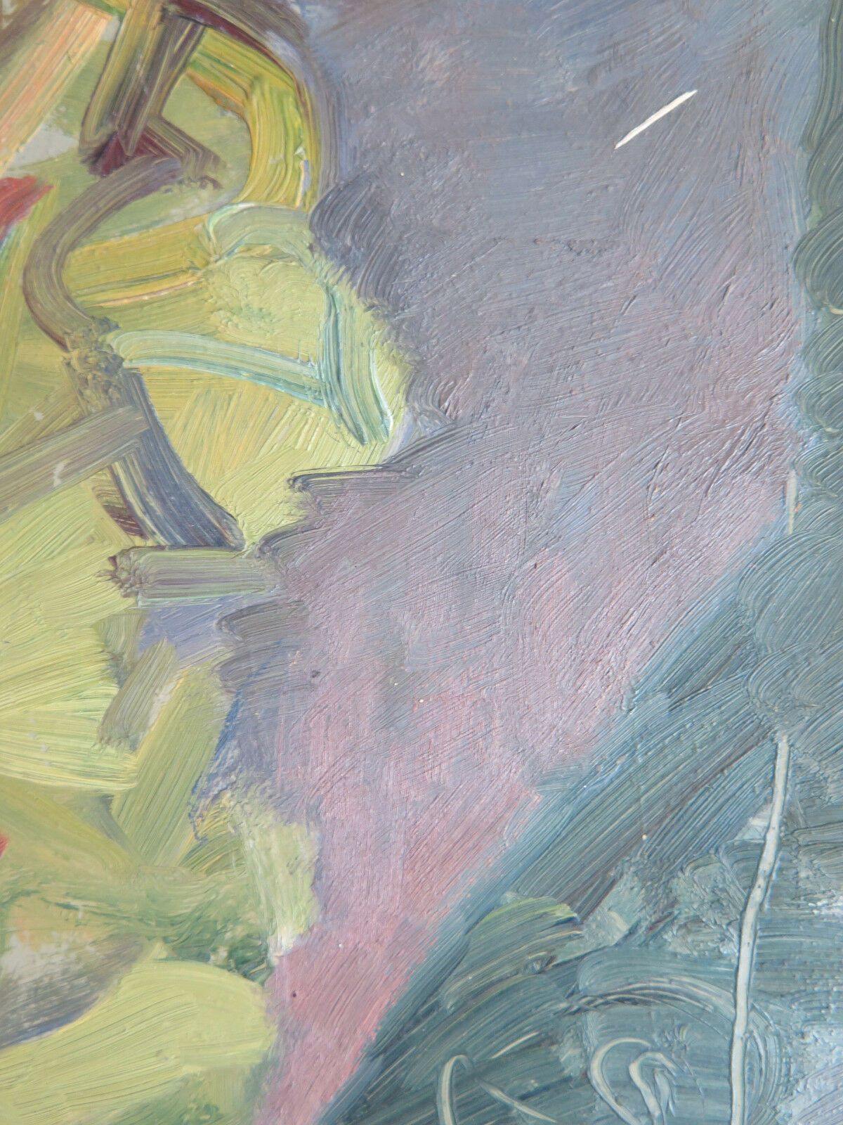 Antico dipinto ad olio su tavola, veduta dalla finestra della casa del pittore
